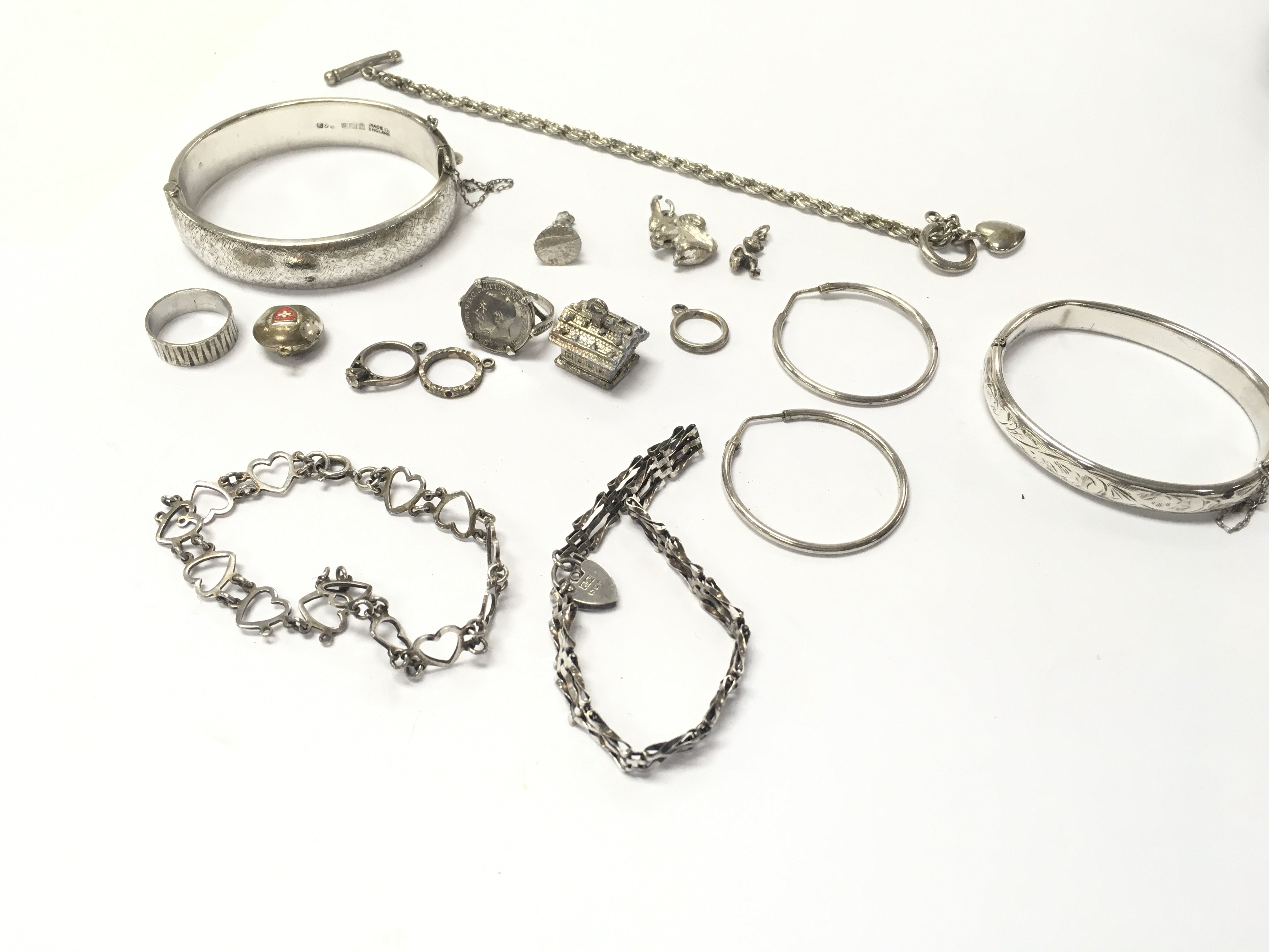 A collection of assorted silver jewellery including bracelets charms etc. 92.56g Postage B