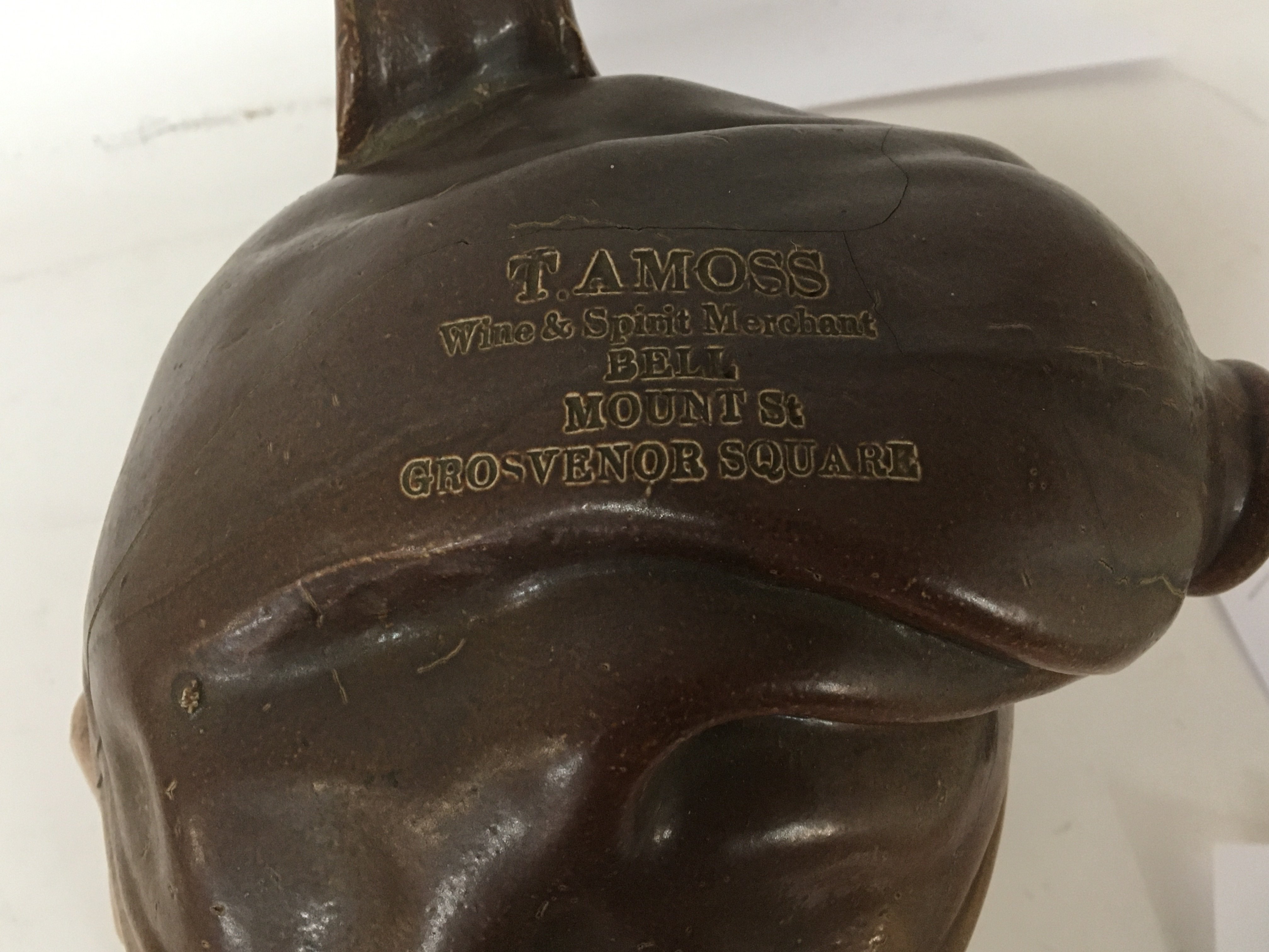 A rare stoneware 19th Century bottle decanter in the form of a large head Souter Johnnie. The top with impressed marks TA Amoss wine and spirit Merchant Bell Mount St Grosvenor Square. Height 26cm hairline cracks.