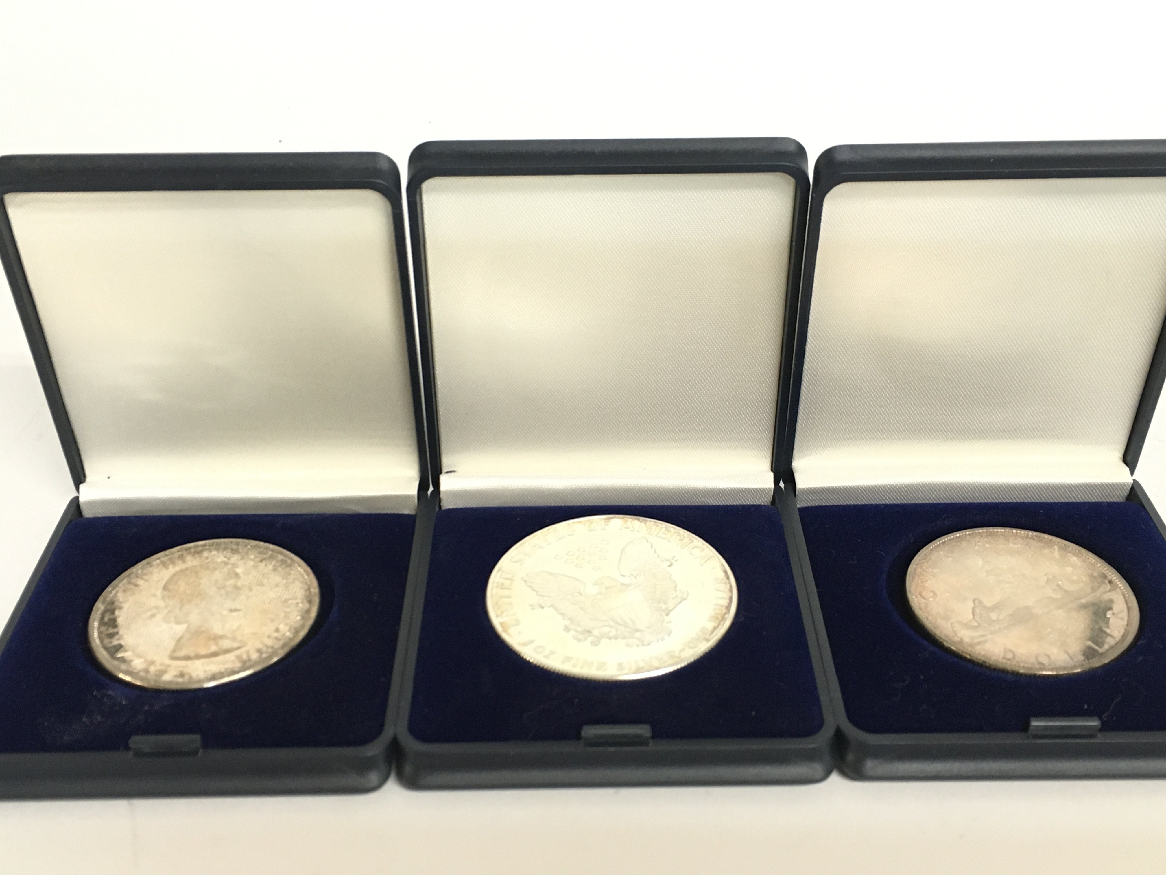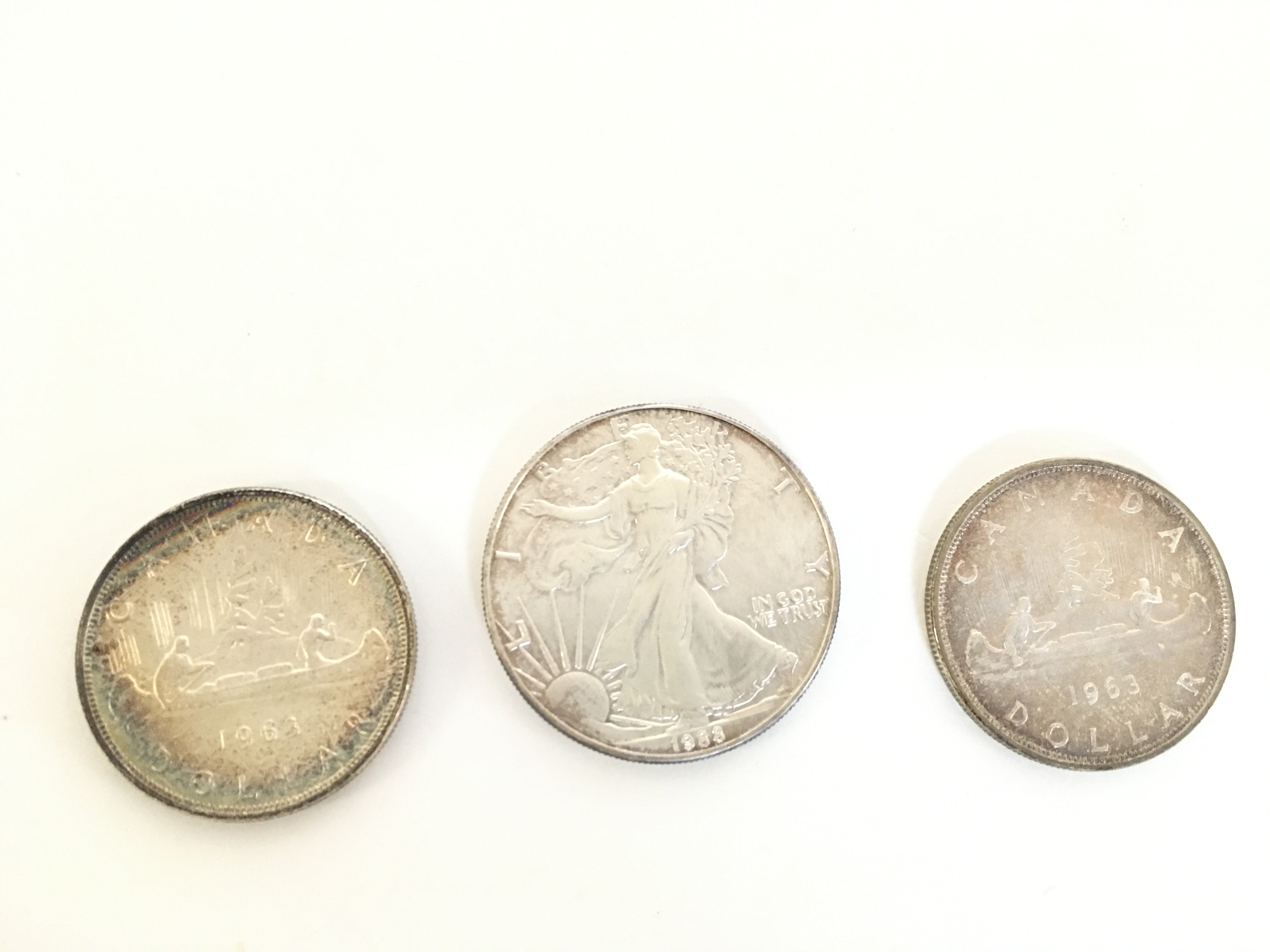 A silver 1oz American dollar and two 1963 Canadian dollars. Postage category A