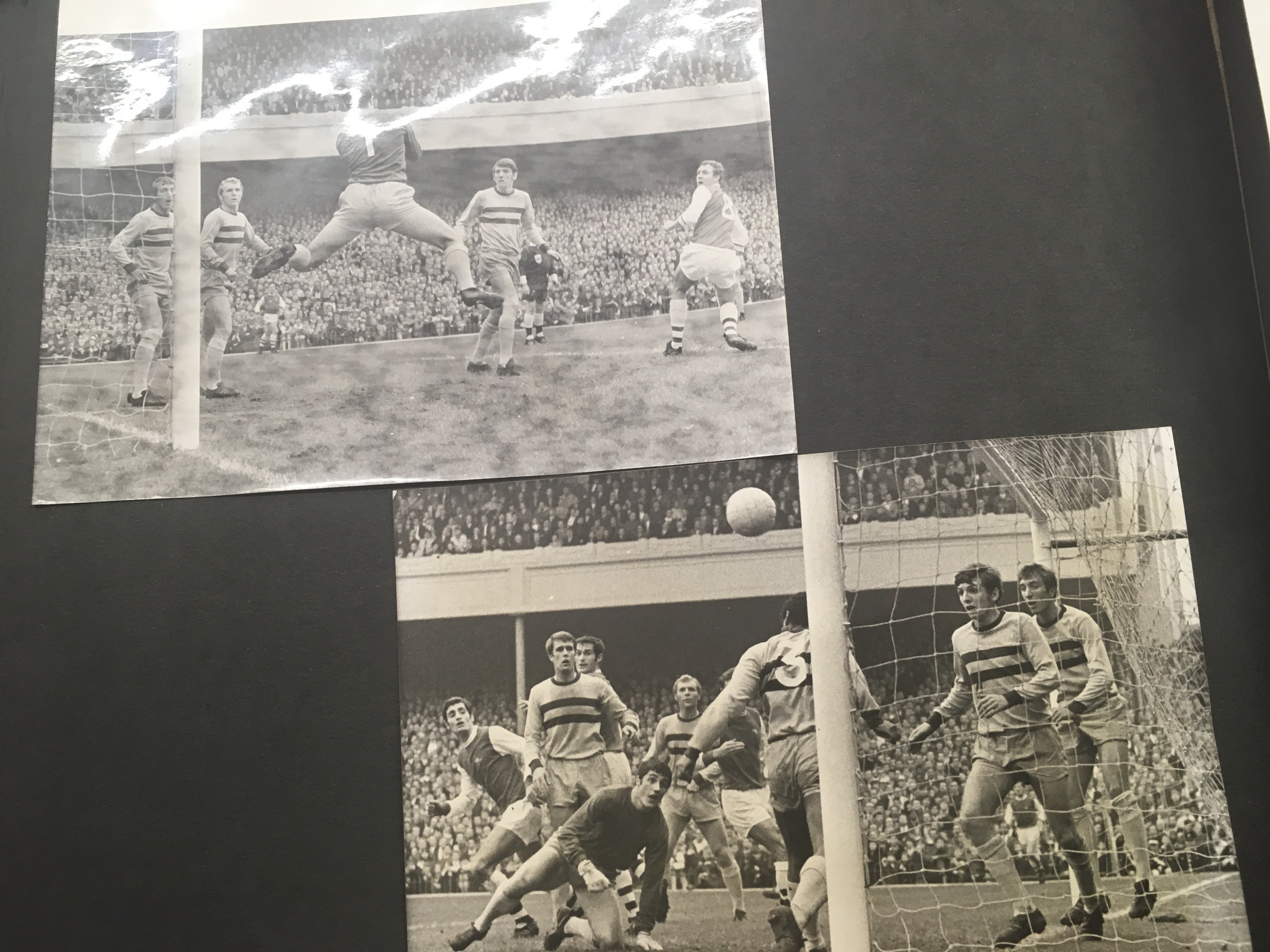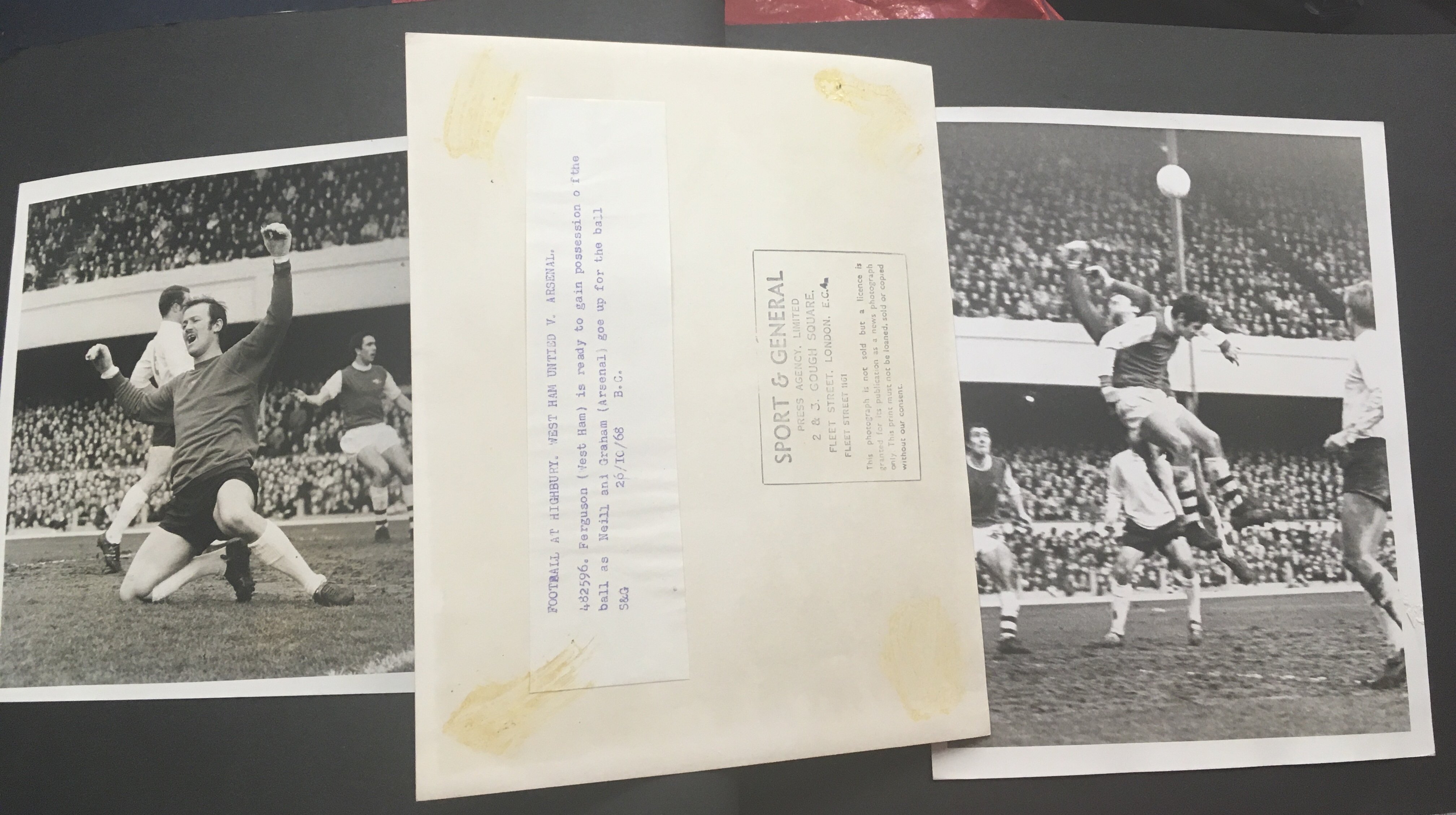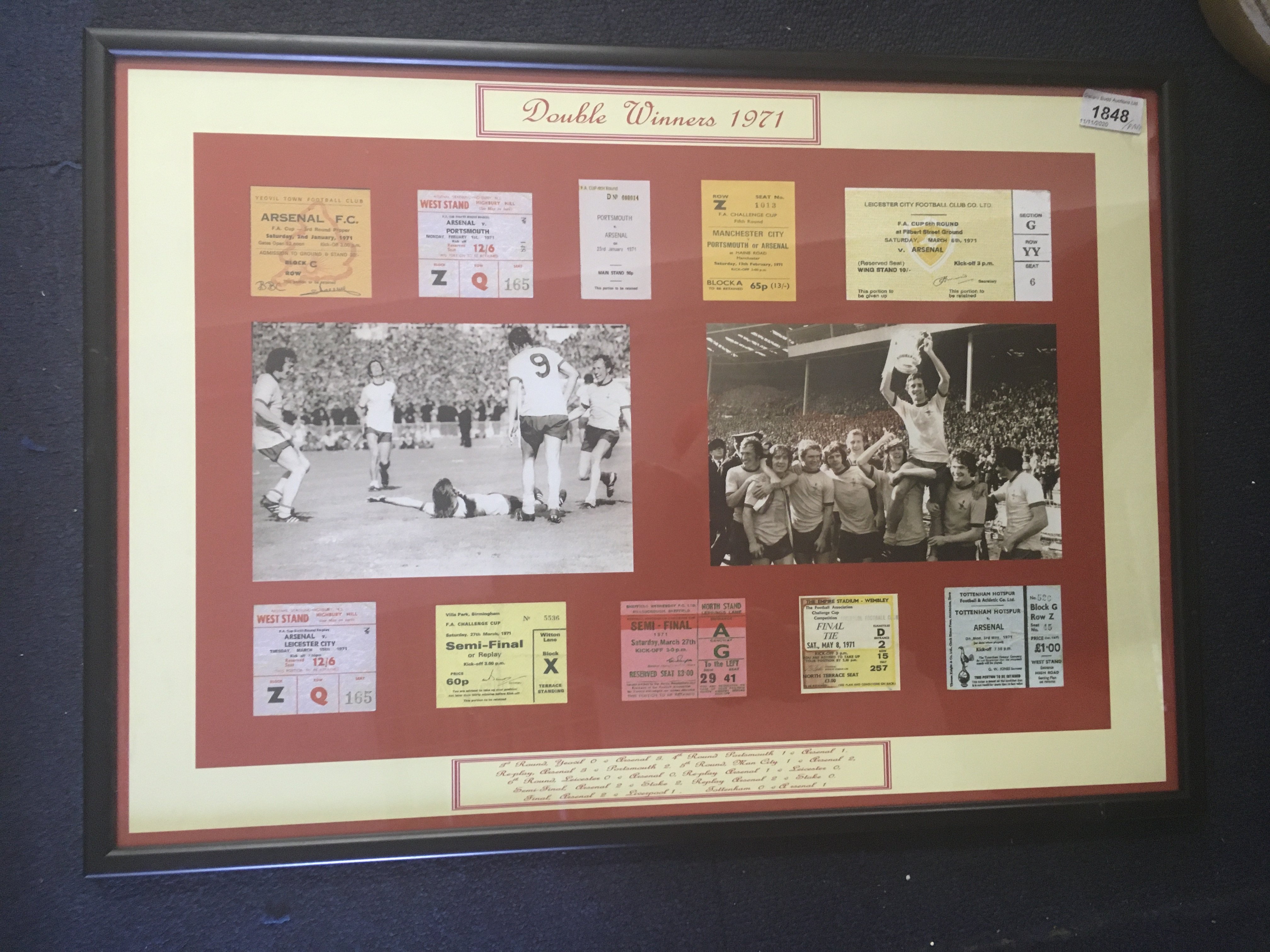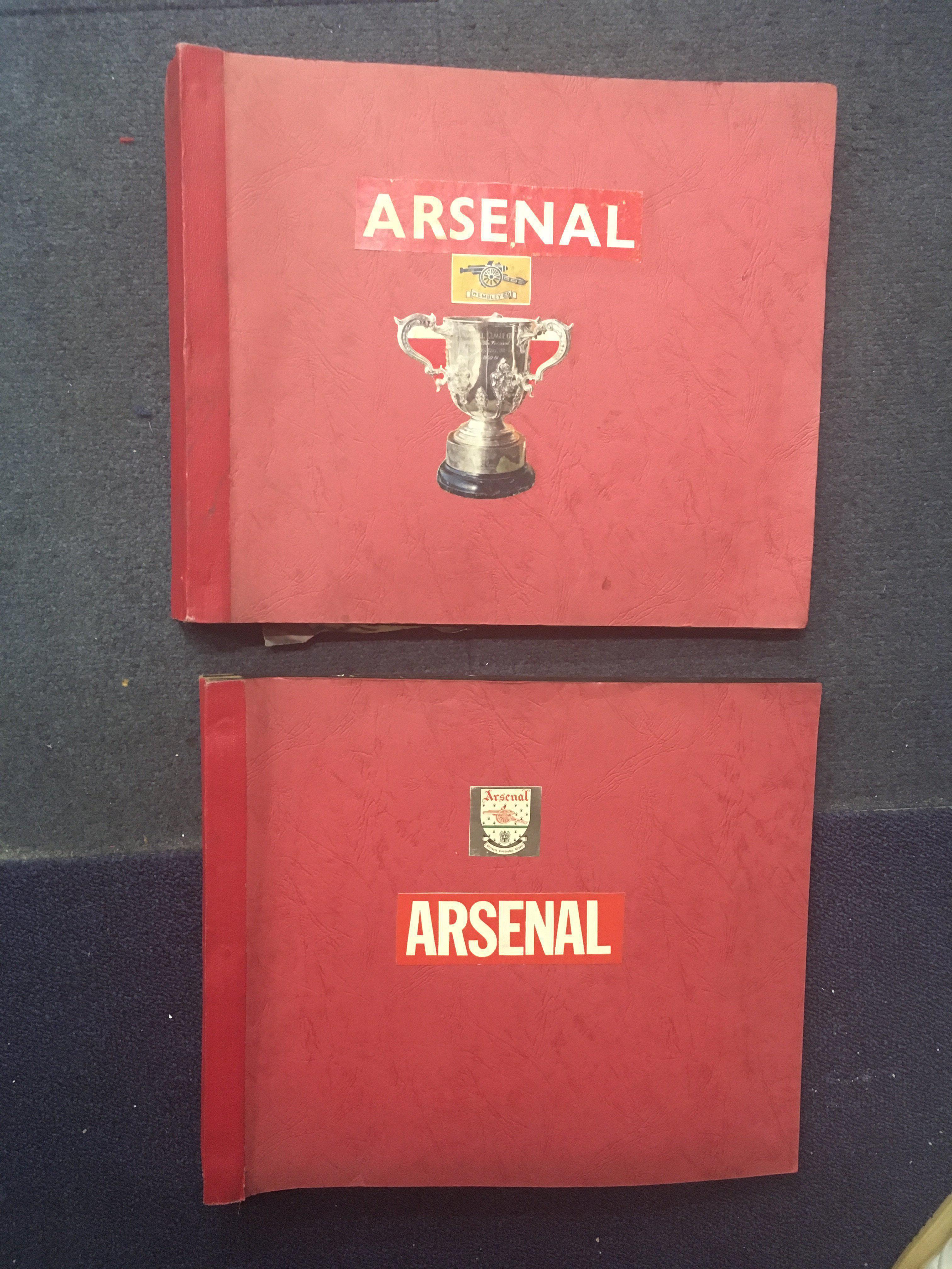 Arsenal Football Press Photo Collection: Two large scrapbooks with over half 10 x 8 inch press photos stuck in from the 60s right up to the double season of 70/71. Peeled a few back to reveal press stamps. 96 press photos. C/W a framed display of replica tickets from the 1971 FA Cup run.