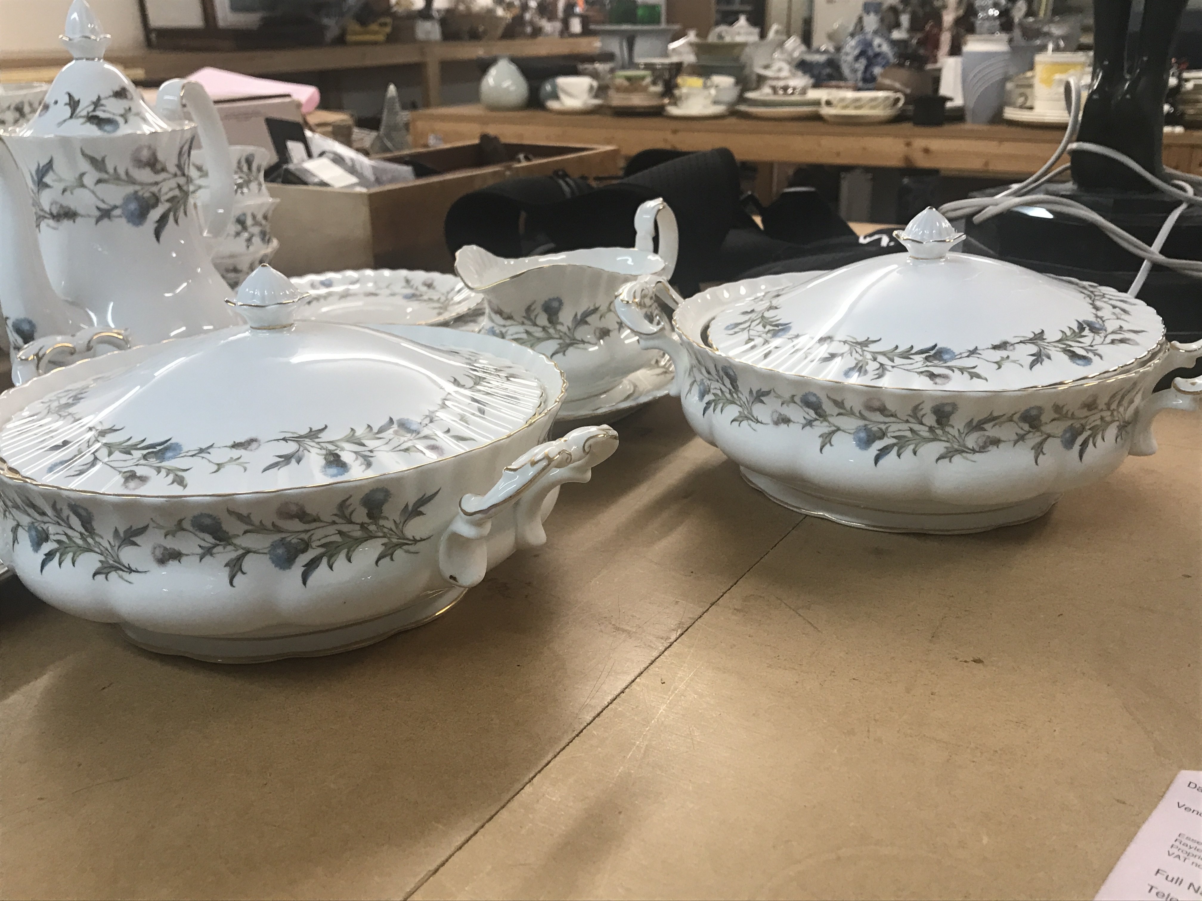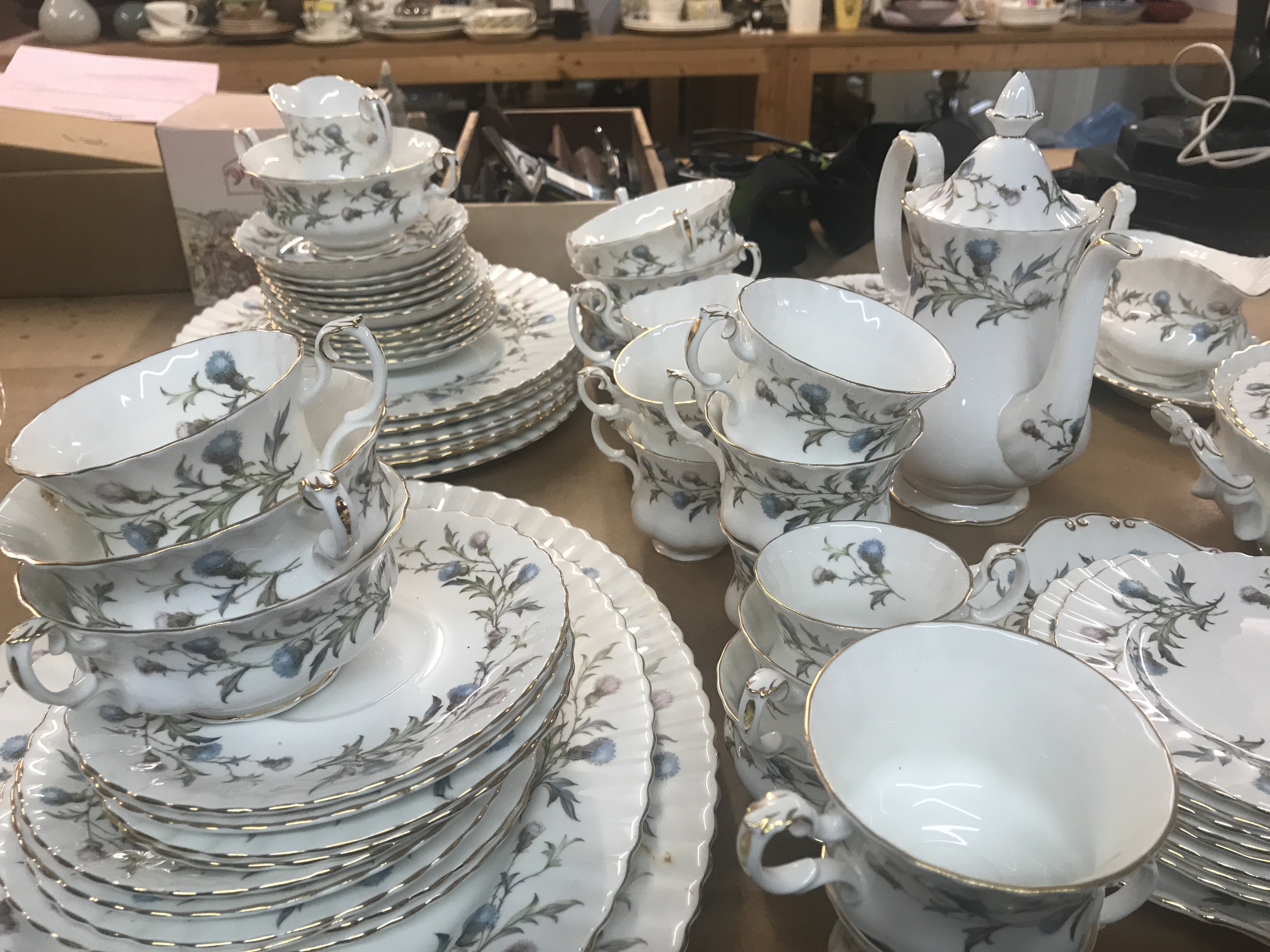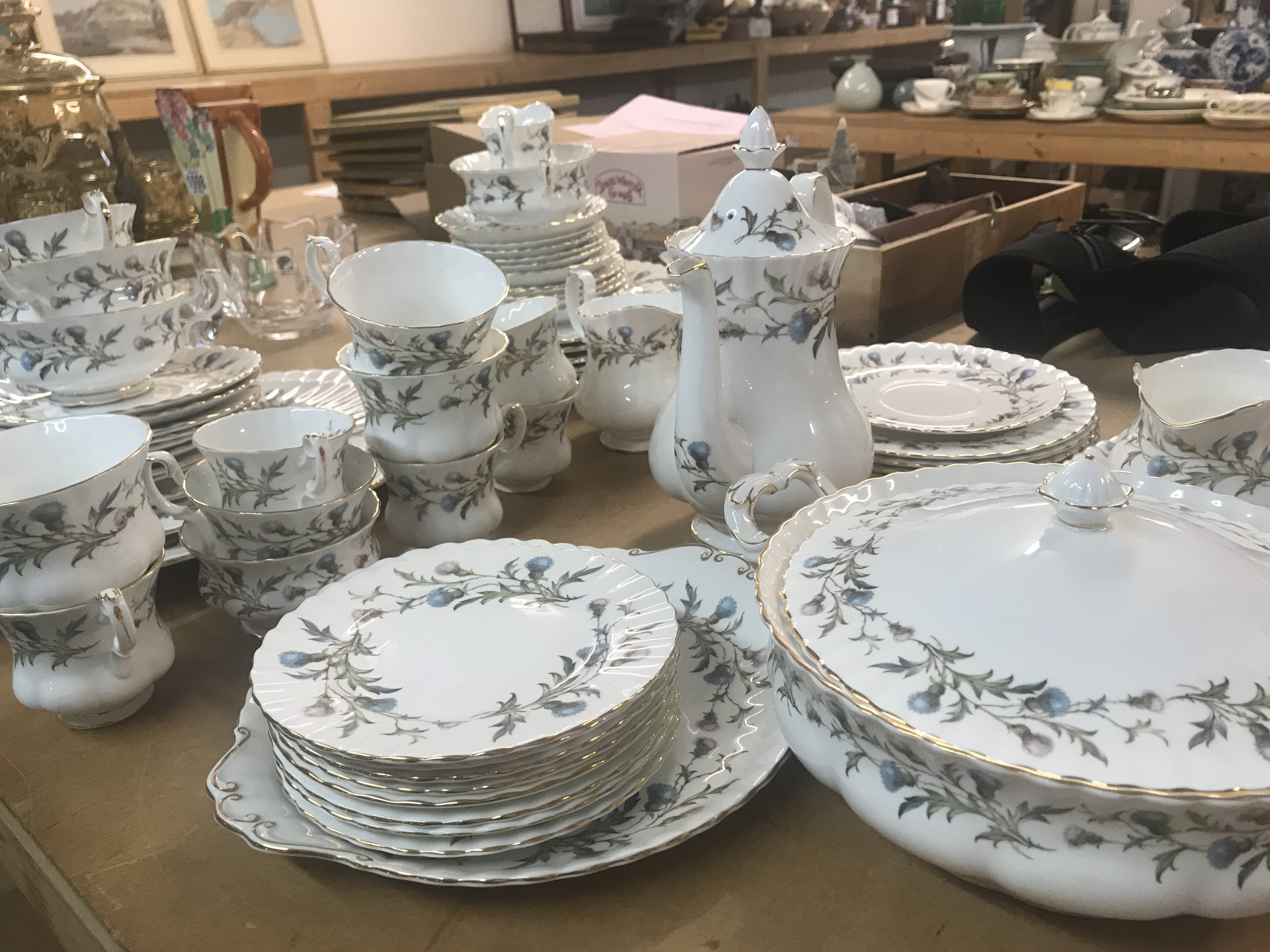 A Royal Albert Brigadoon dinner/ tea set including tureens serving dishes dinner plates cups saucers and coffee pot .