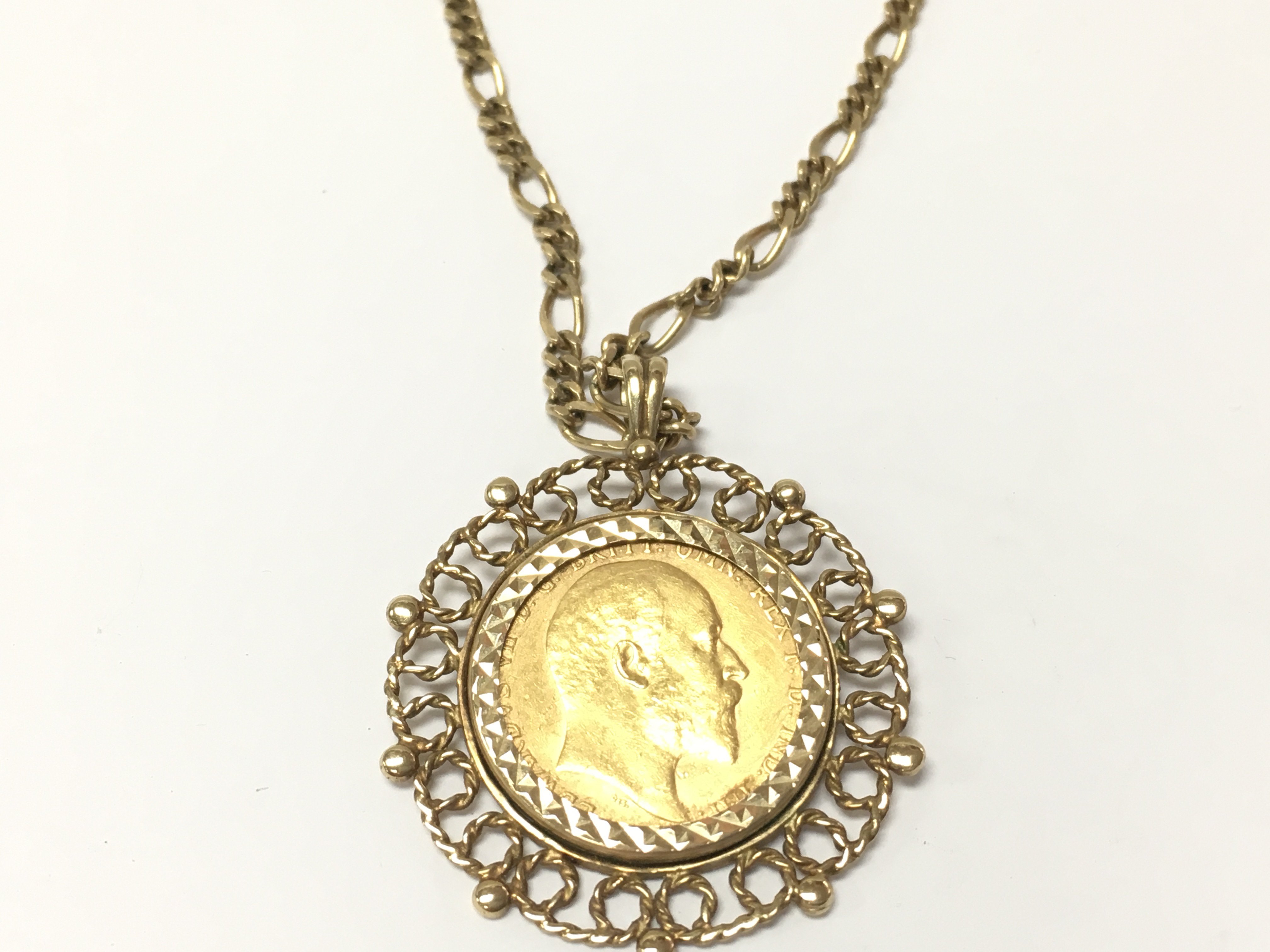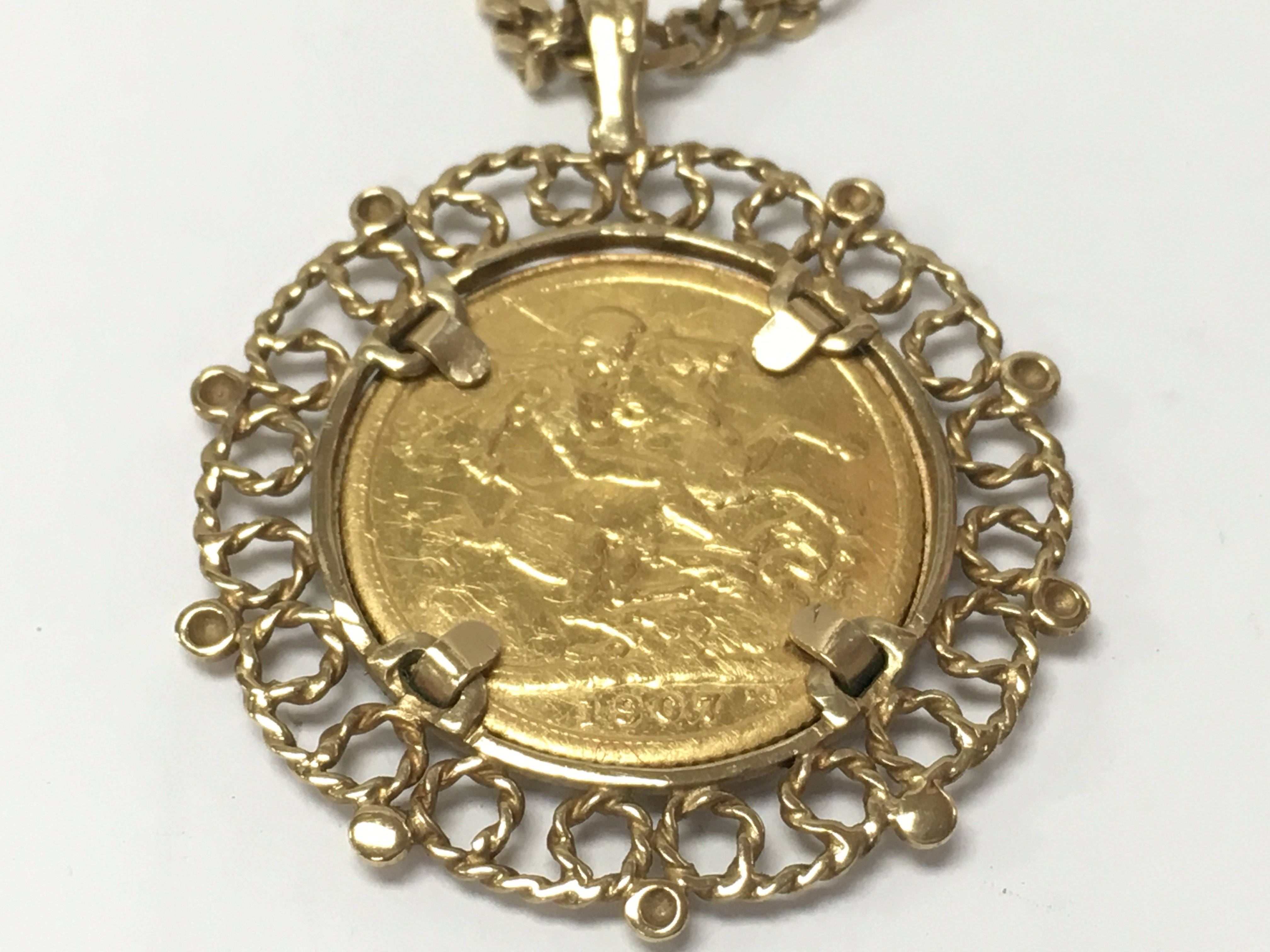 A 1907 full sovereign in a 9ct mount with 9ct chain. Total weight 20.28g Postage B