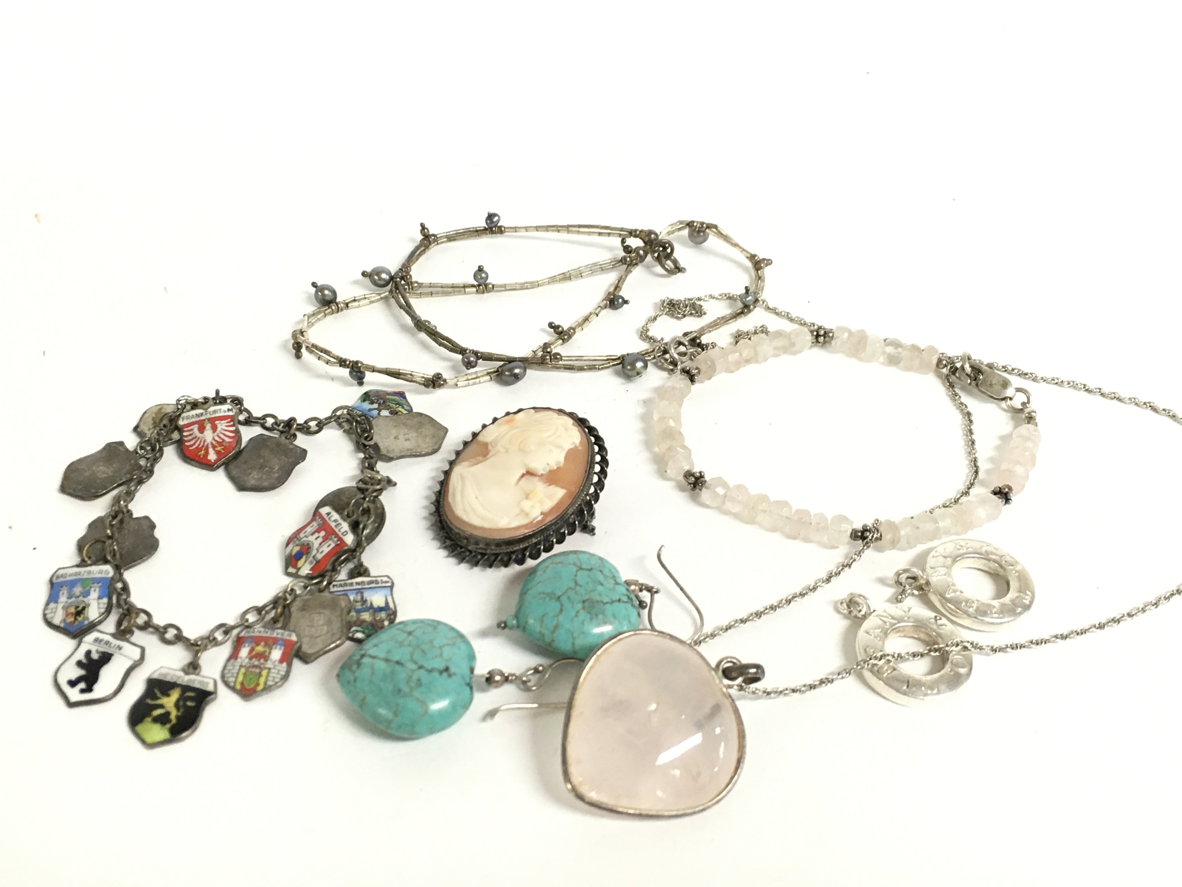 A collection of jewellery including a rose Quartz pendant, silver enamel charm bracelet, cameo etc. Postage category a