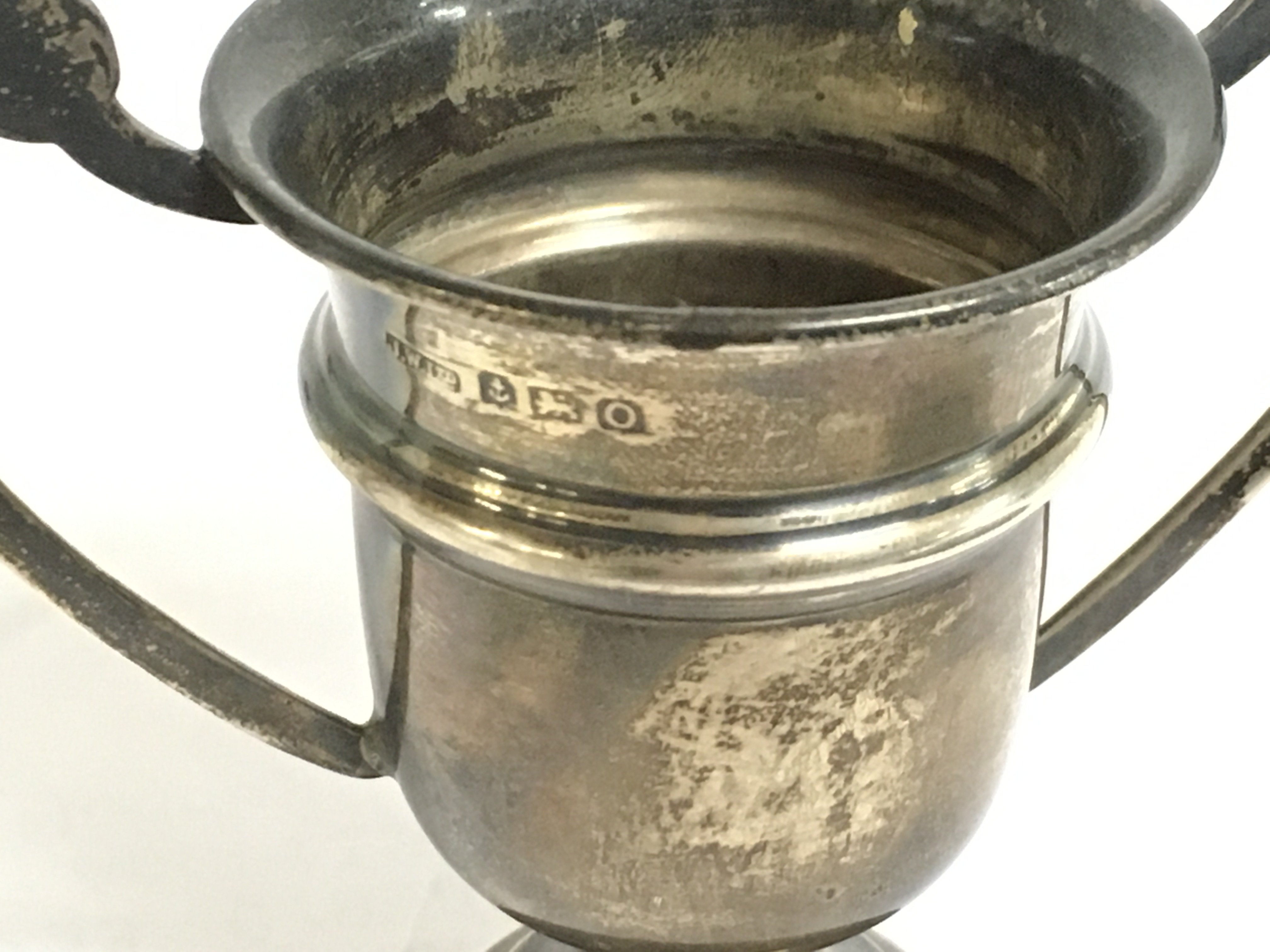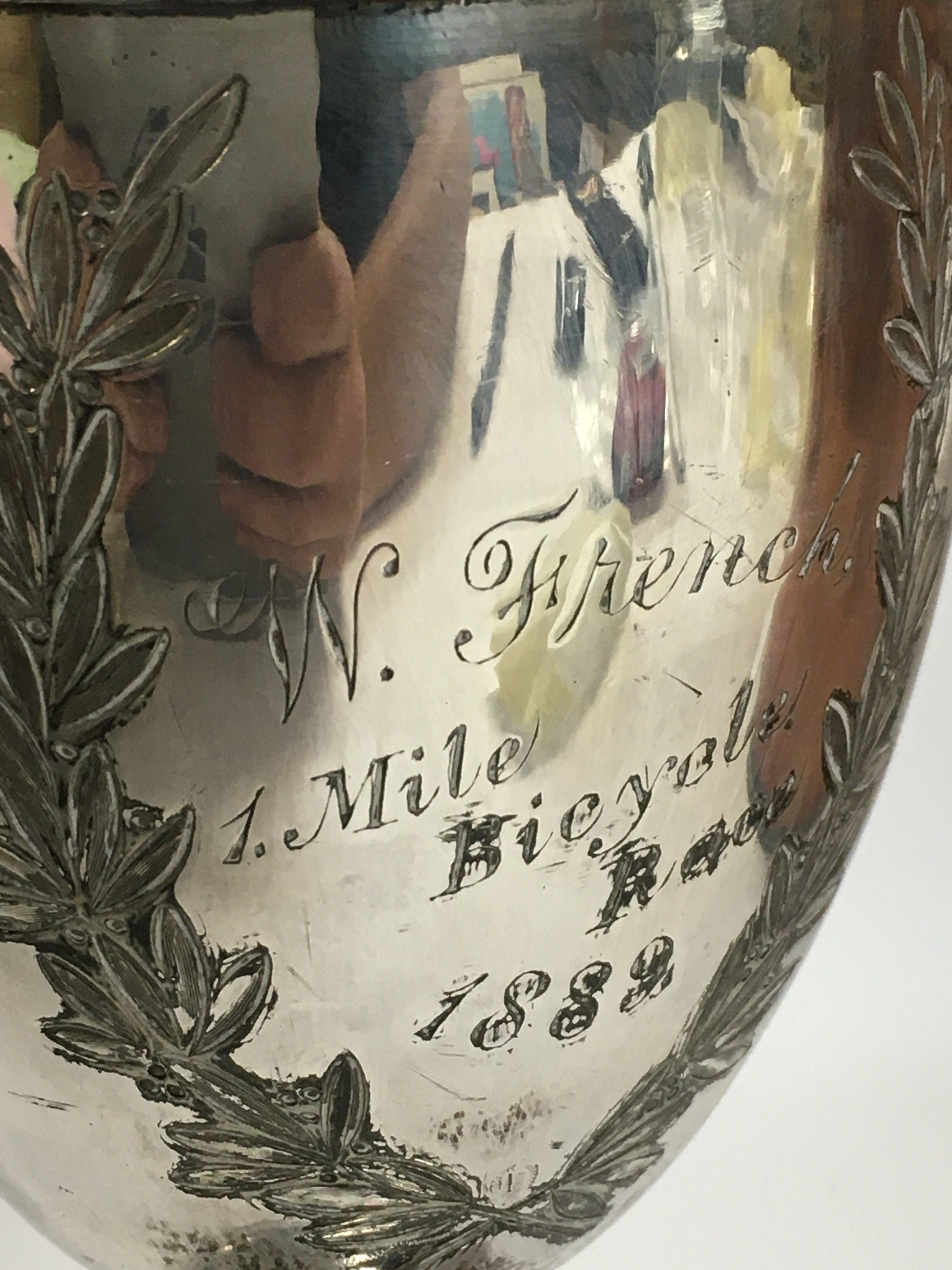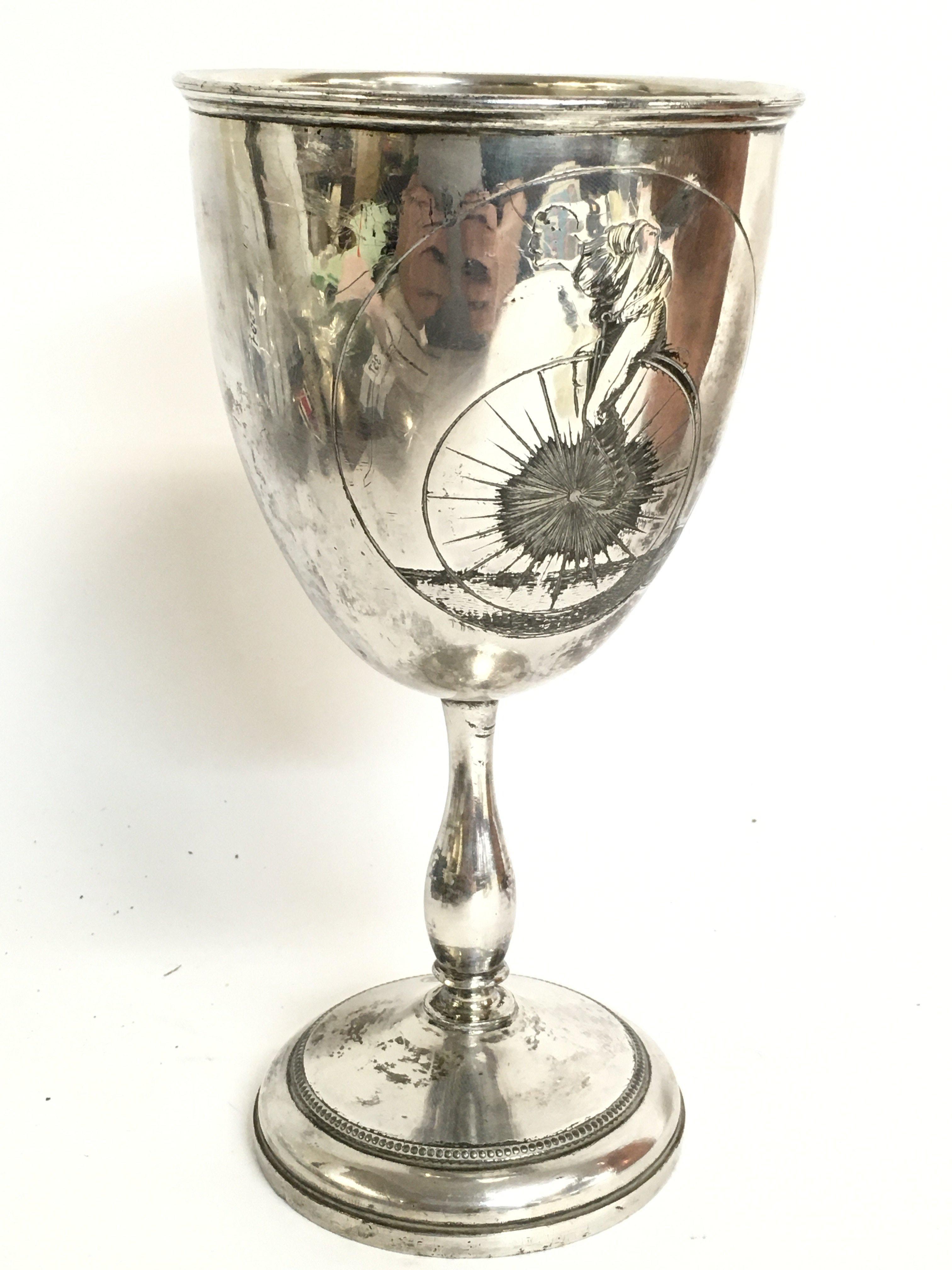 Silver hallmarked car & motorcycle annual best rally driver trophy 1953, a Penny farthing cup dated 1889. 7cm tall. Postage category A