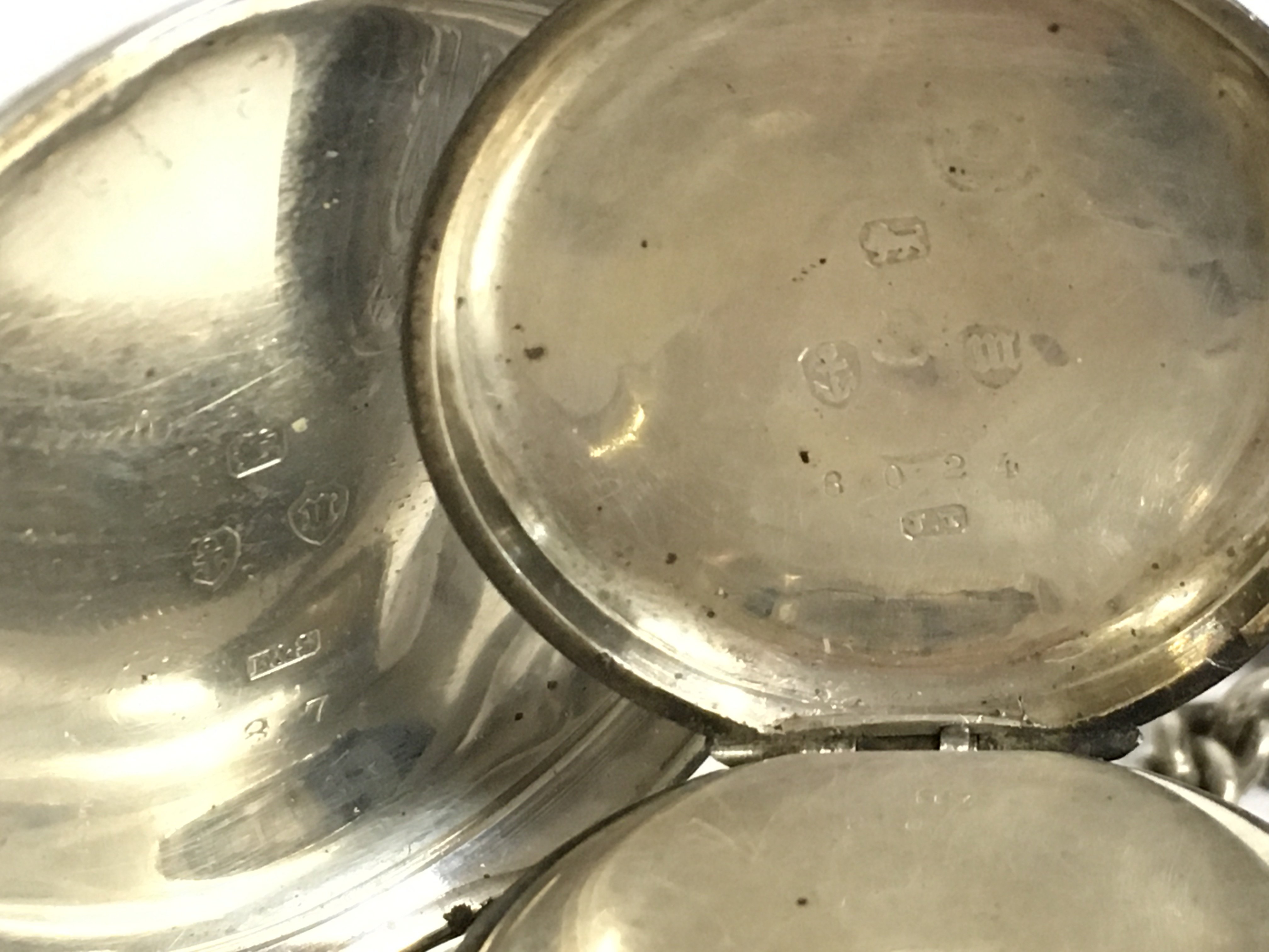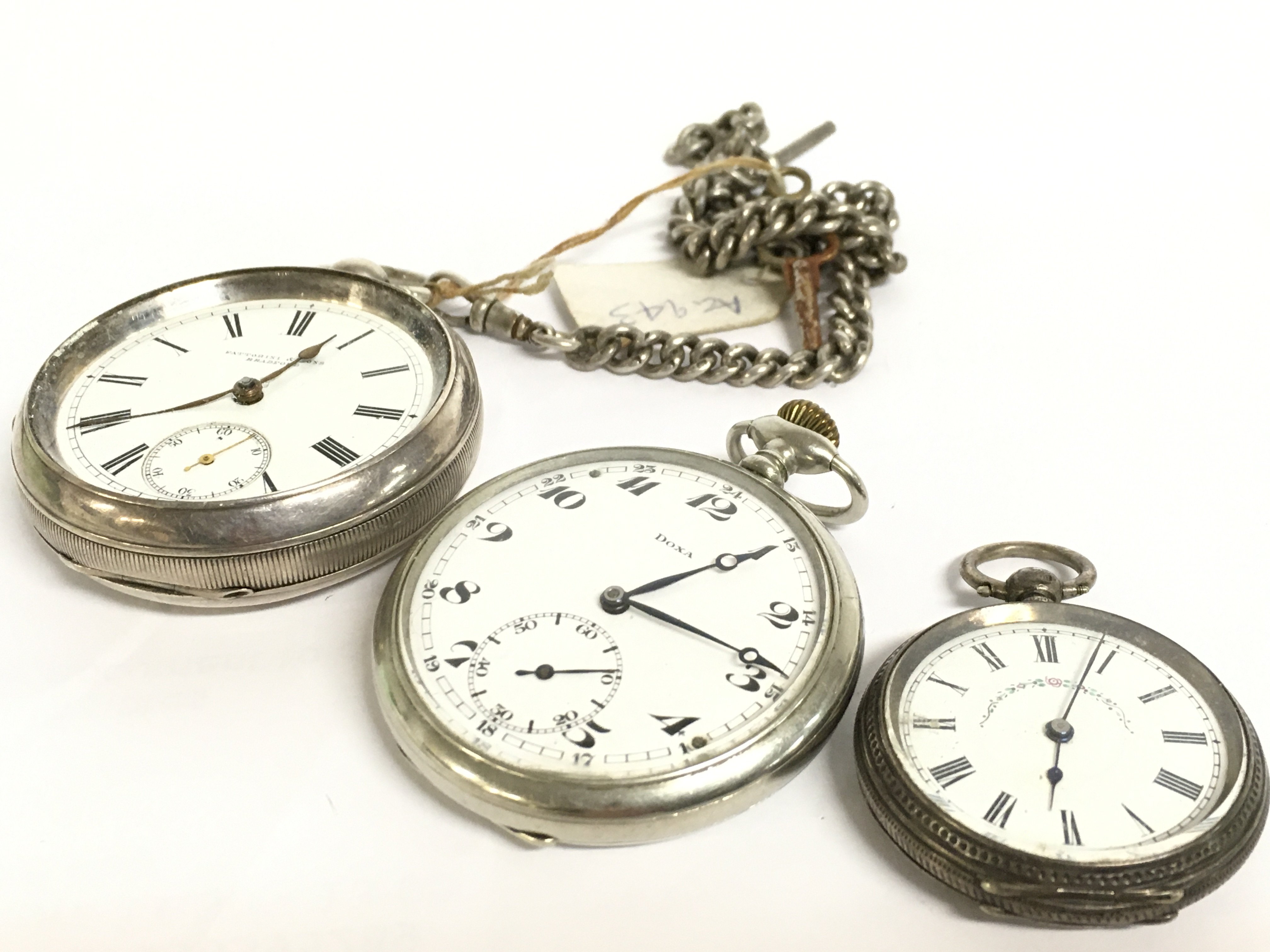 Pocket watches including a silver hallmarked Fattorini & Sons watch with silver chain, a small silver pocket watch and a Doxa. This lot cannot be posted