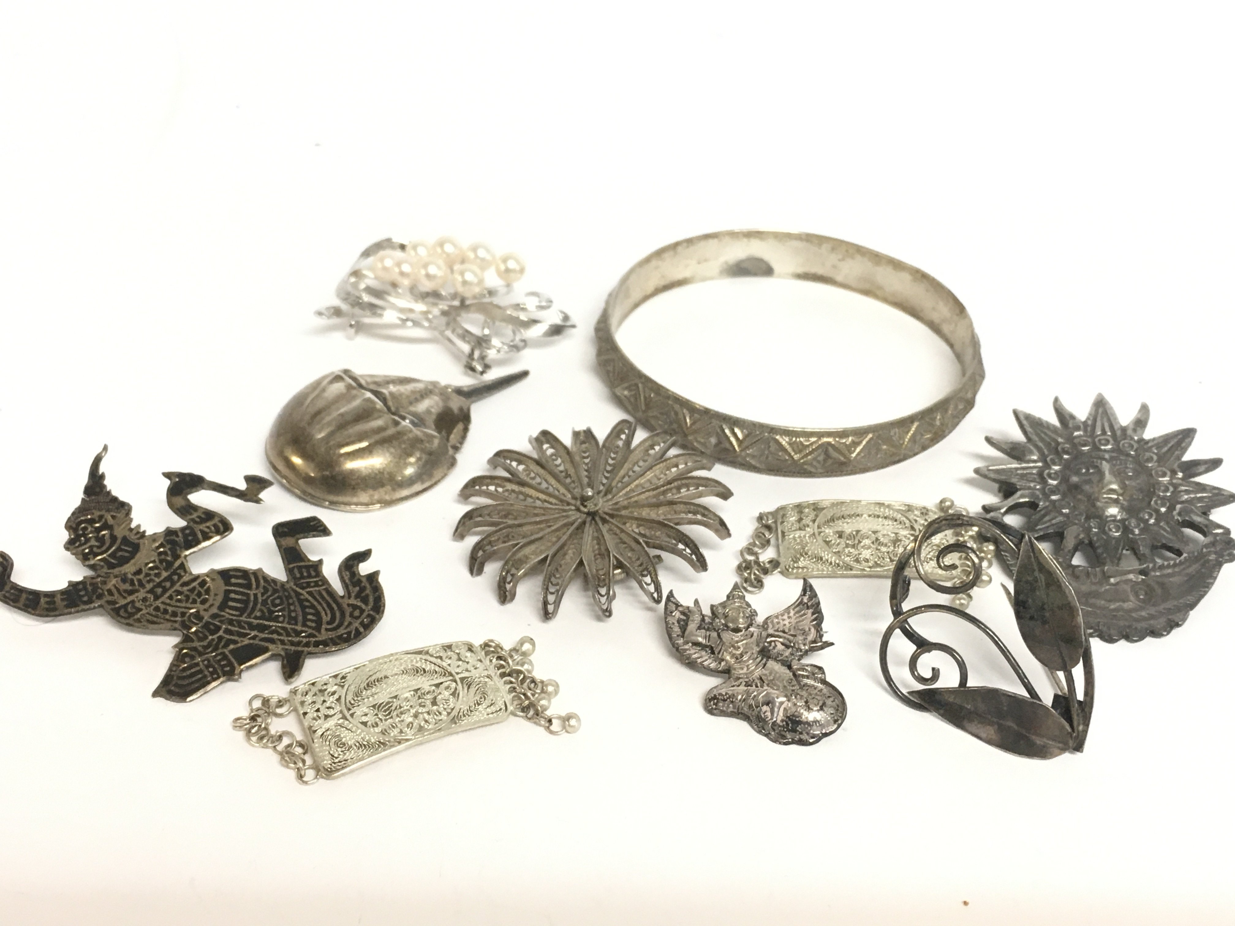 A collection of silver jewellery including brooches and a bangle. 100g in total. postage category A- NO RESERVE