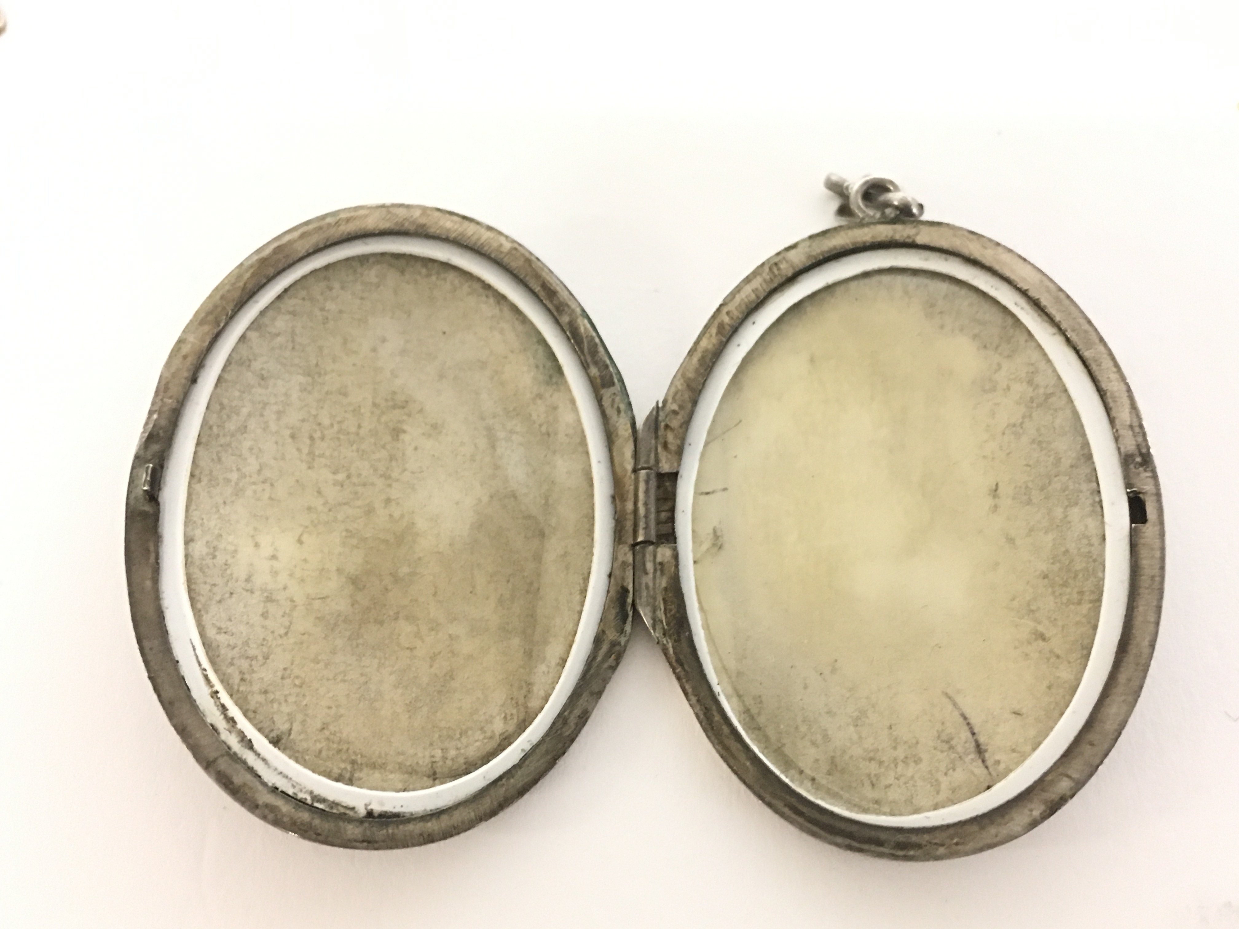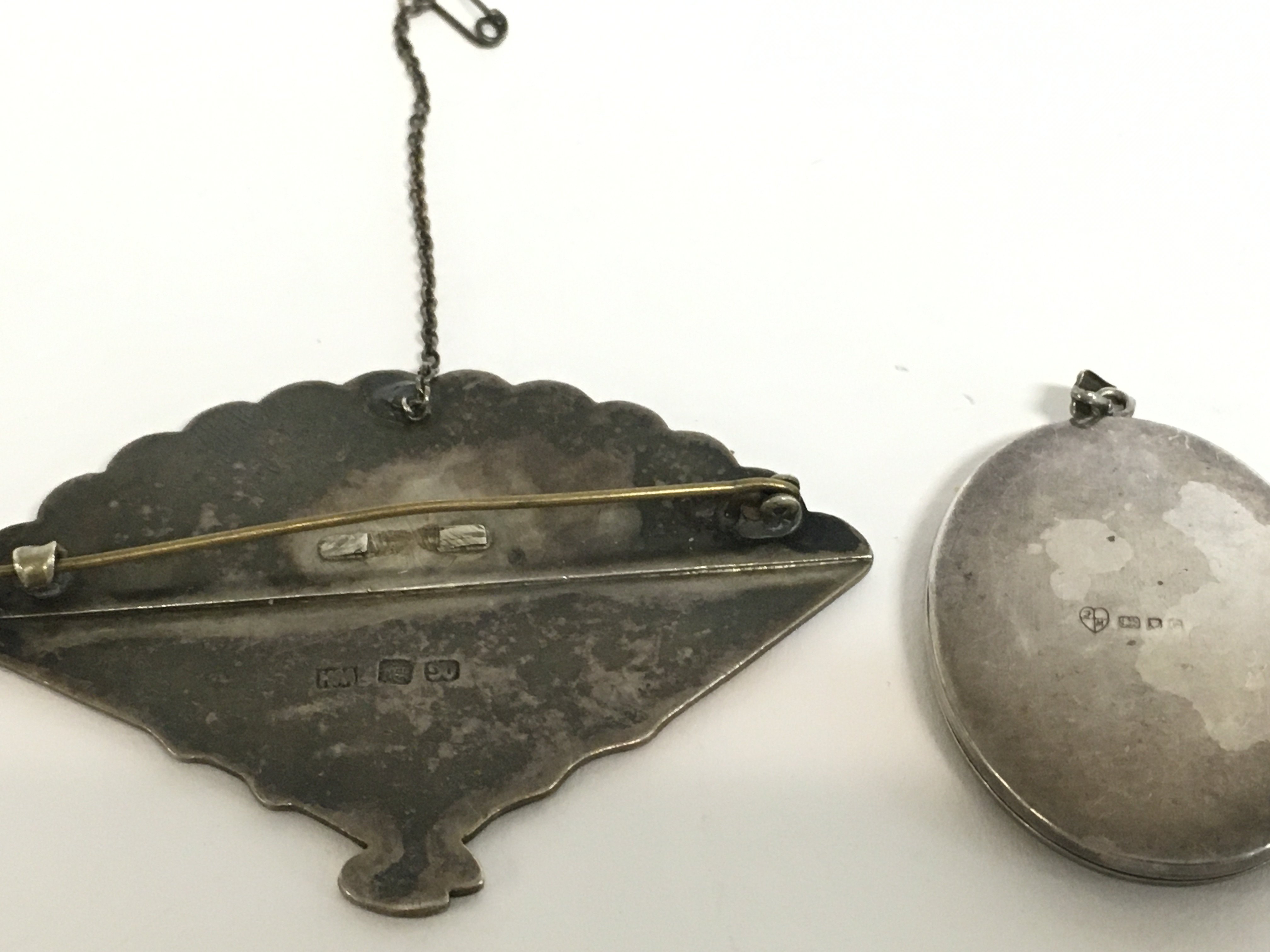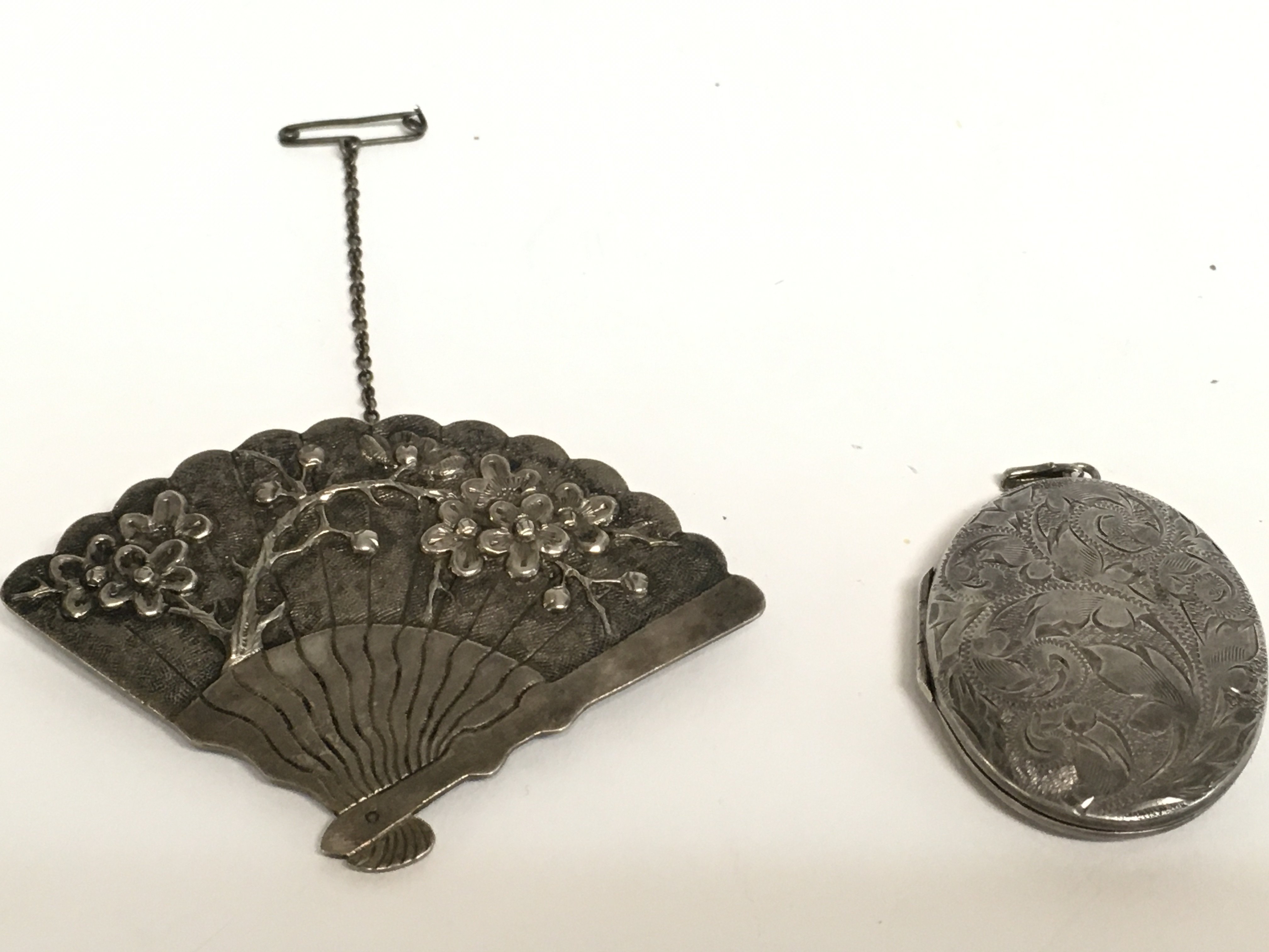 A Chinese silver fan brooch and a silver locket. Postage category A- NO RESERVE