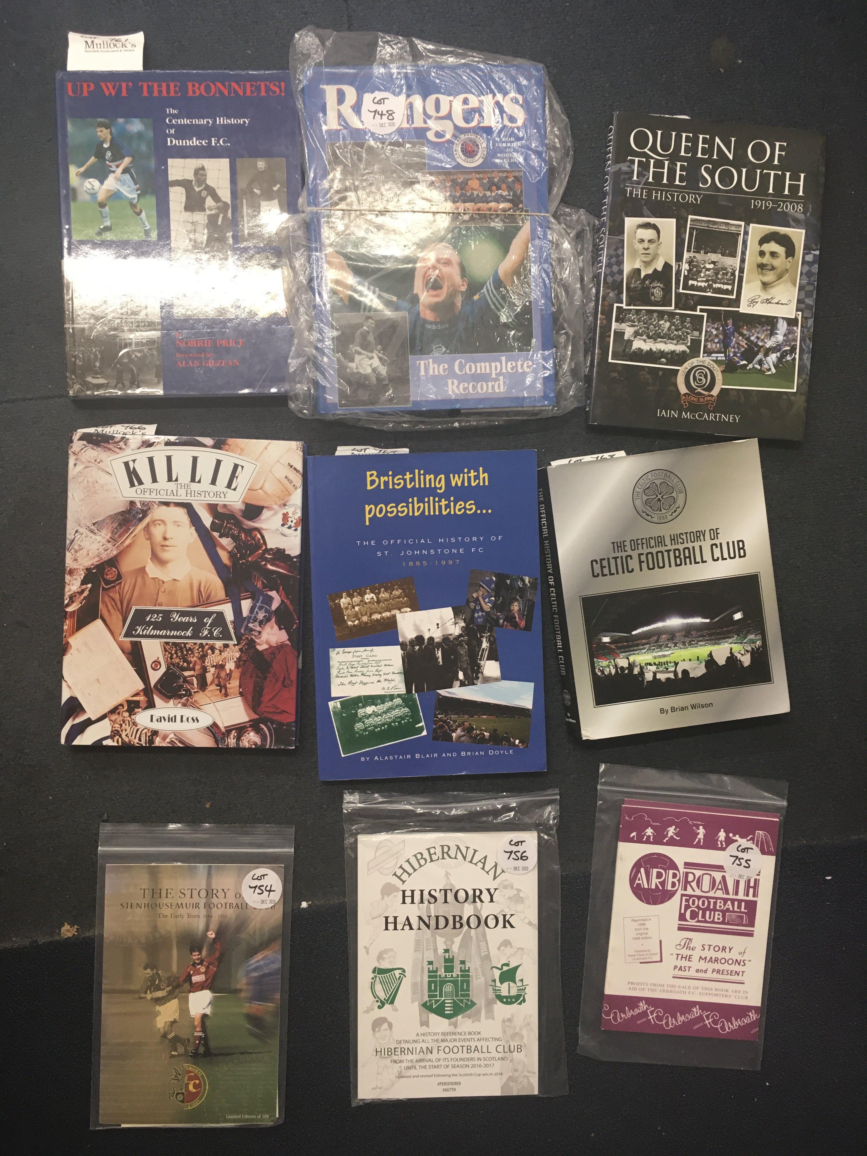Scottish Football Book Collection: Very nice collection which were good enough to be purchased individually from another auction house. History books of Dundee Rangers Queen of the South Kilmarnock St Johnstone Celtic Stenhousemuir Hibernian and Arbroath. Excellent. (9)