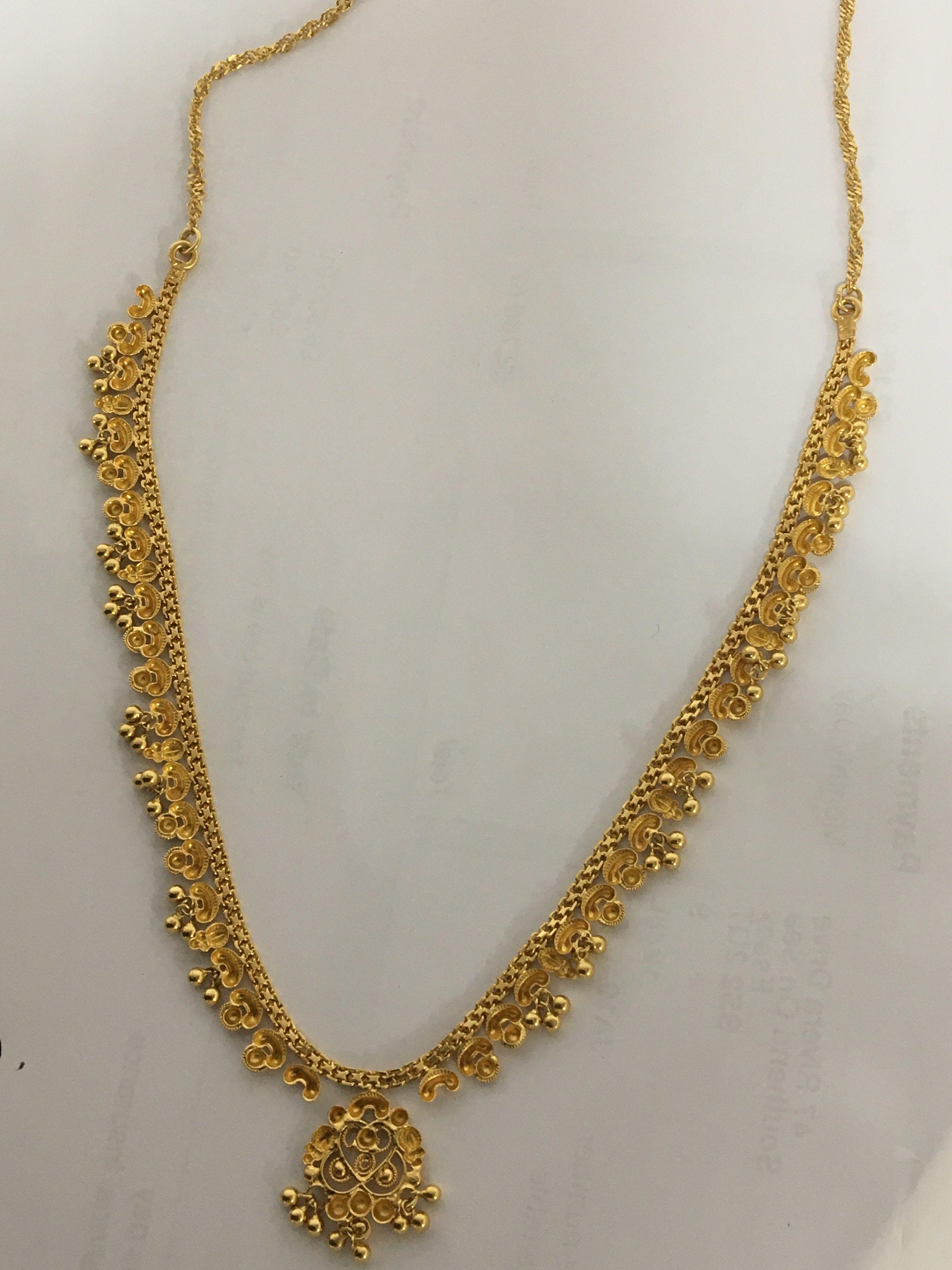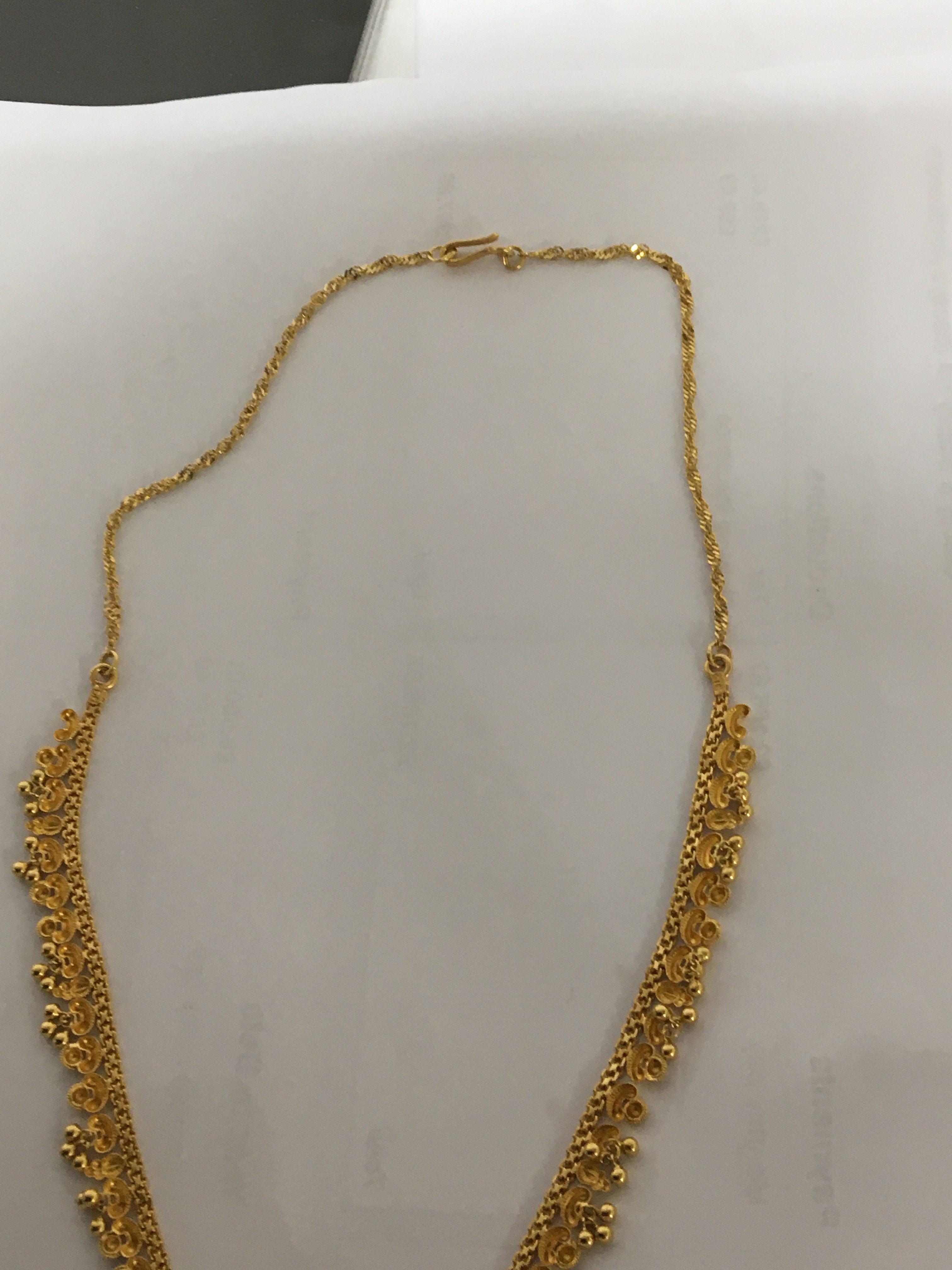 An Indian high grade gold 22 carat necklace with ornate drops. Weight 19g