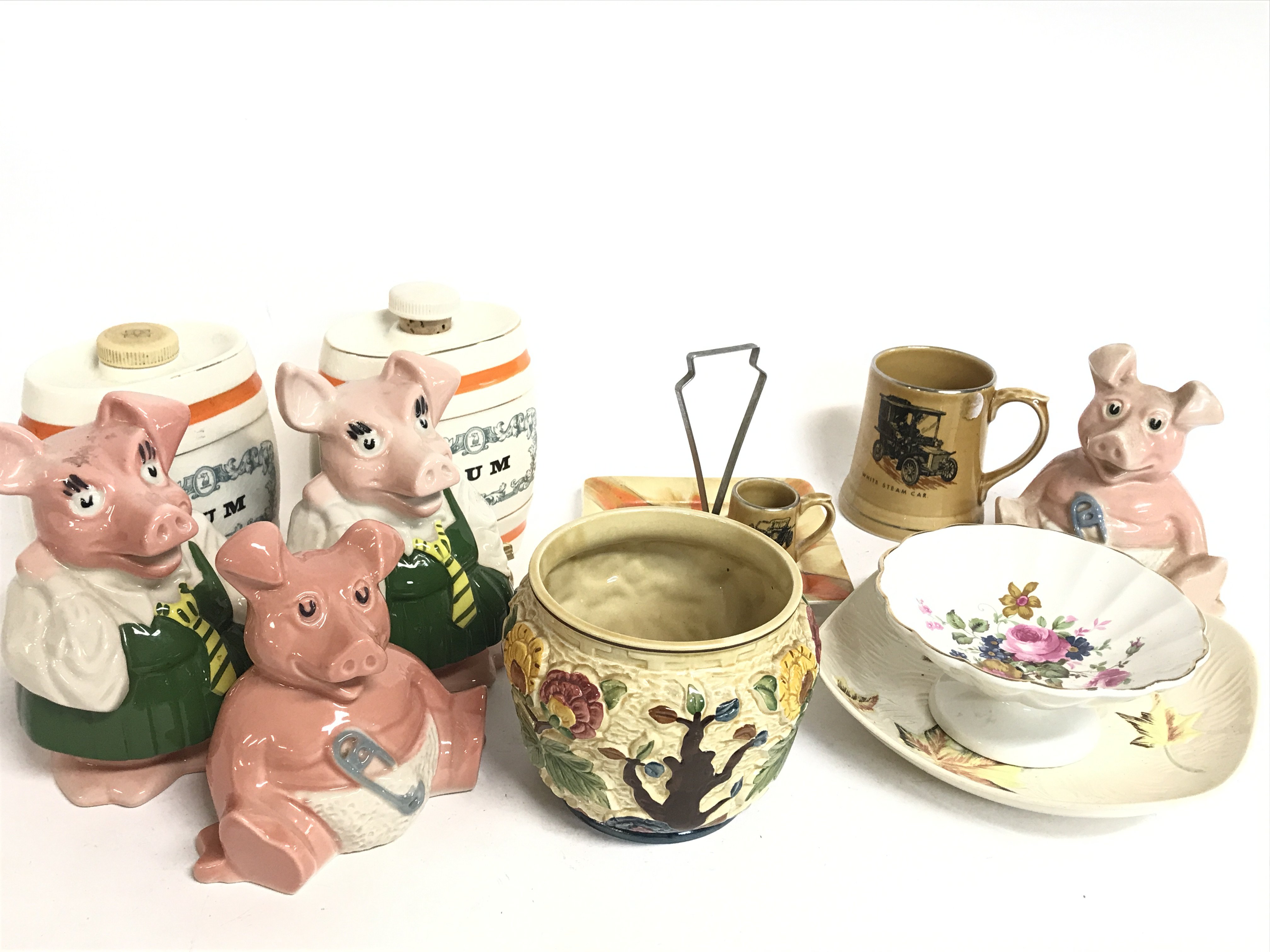 NatWest porcelain pig figures, rum containers, Indian tree vase, Woodland dish, Wade ceramics, ornaments, spirit containers etc. This lot cannot be posted- NO RESERVE