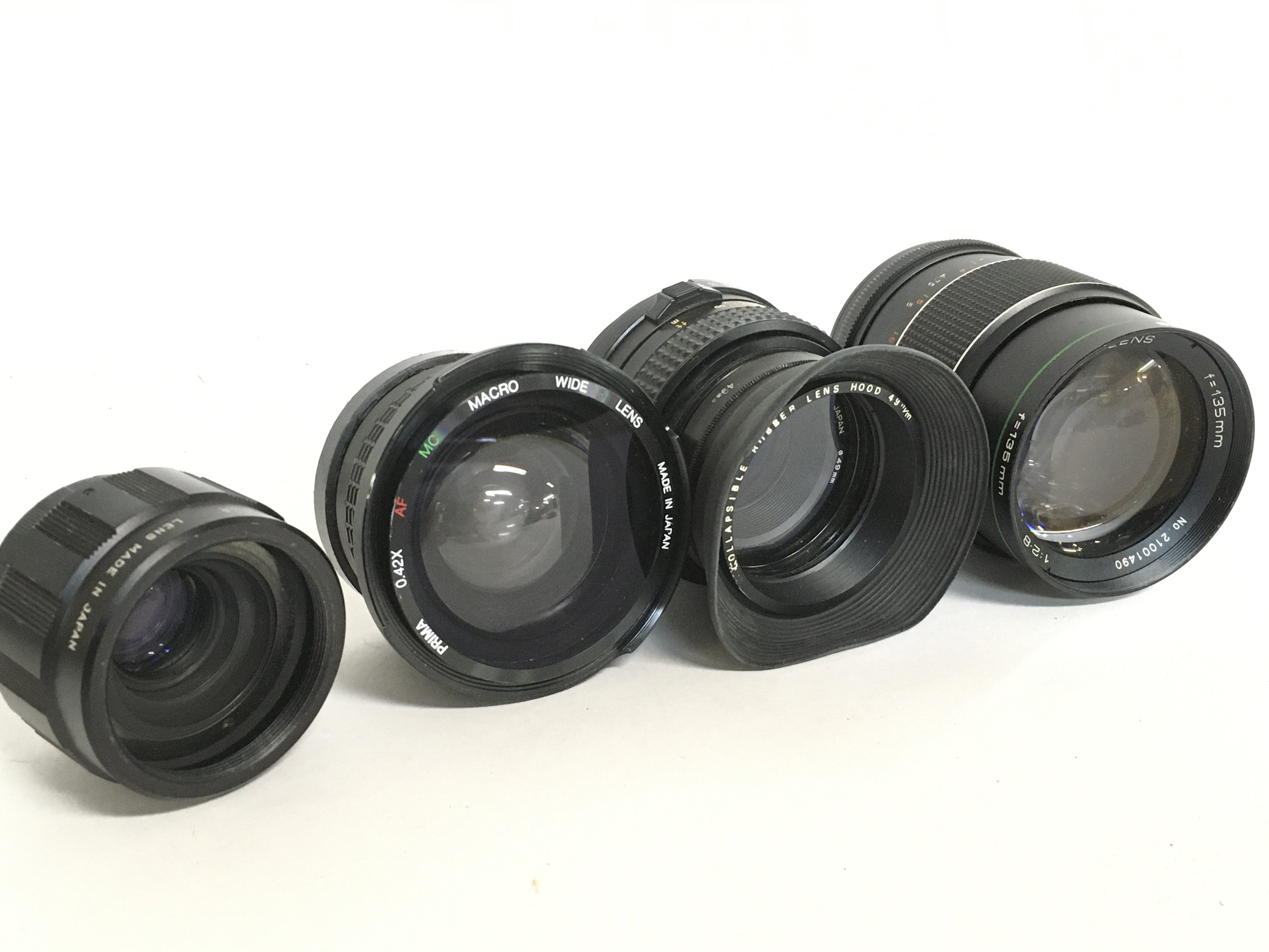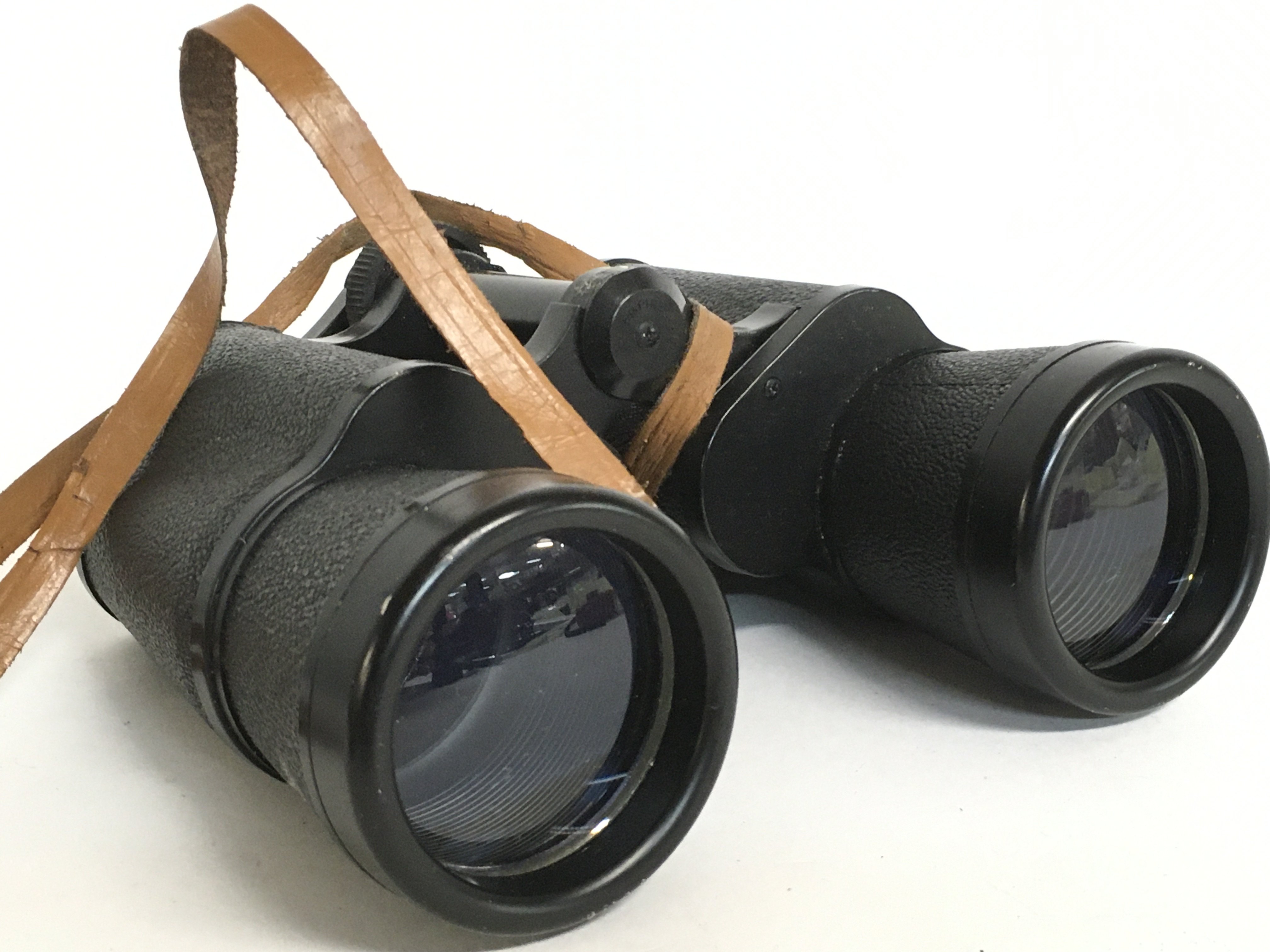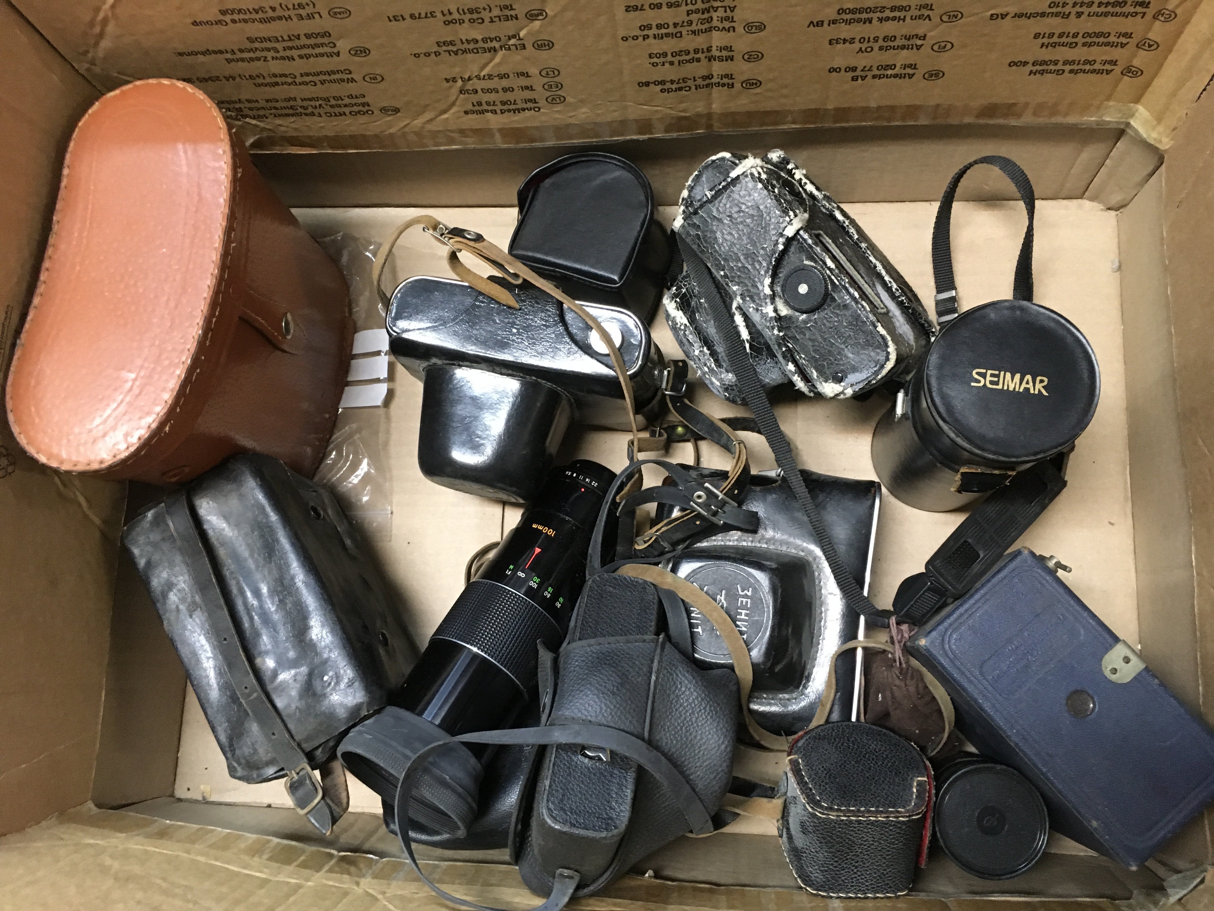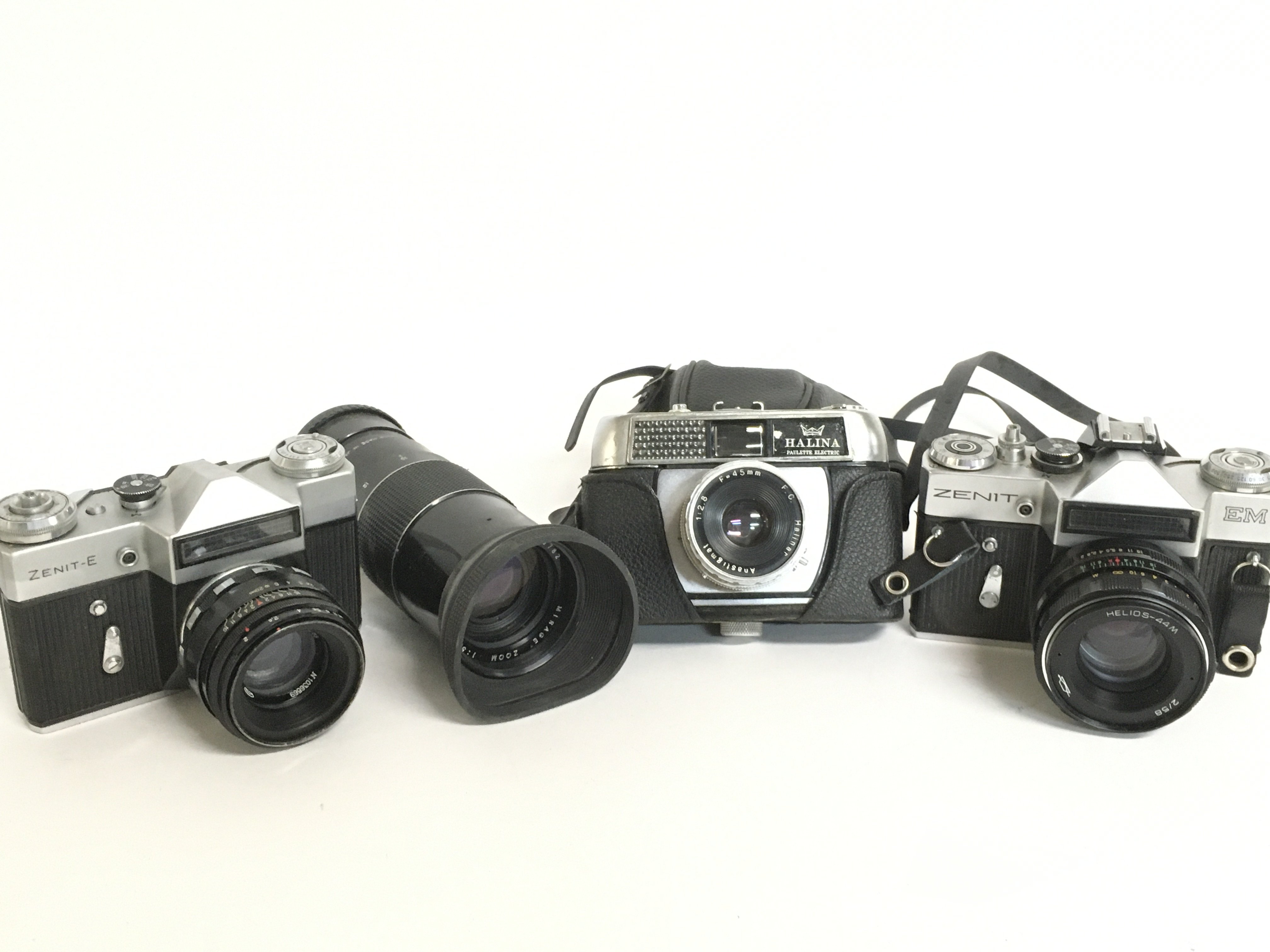 Vintage cameras including a Zenit-E, Halina, Zenit EM. Mirage zoom lens, Ajax 7x50 binoculars. This lot cannot be posted
