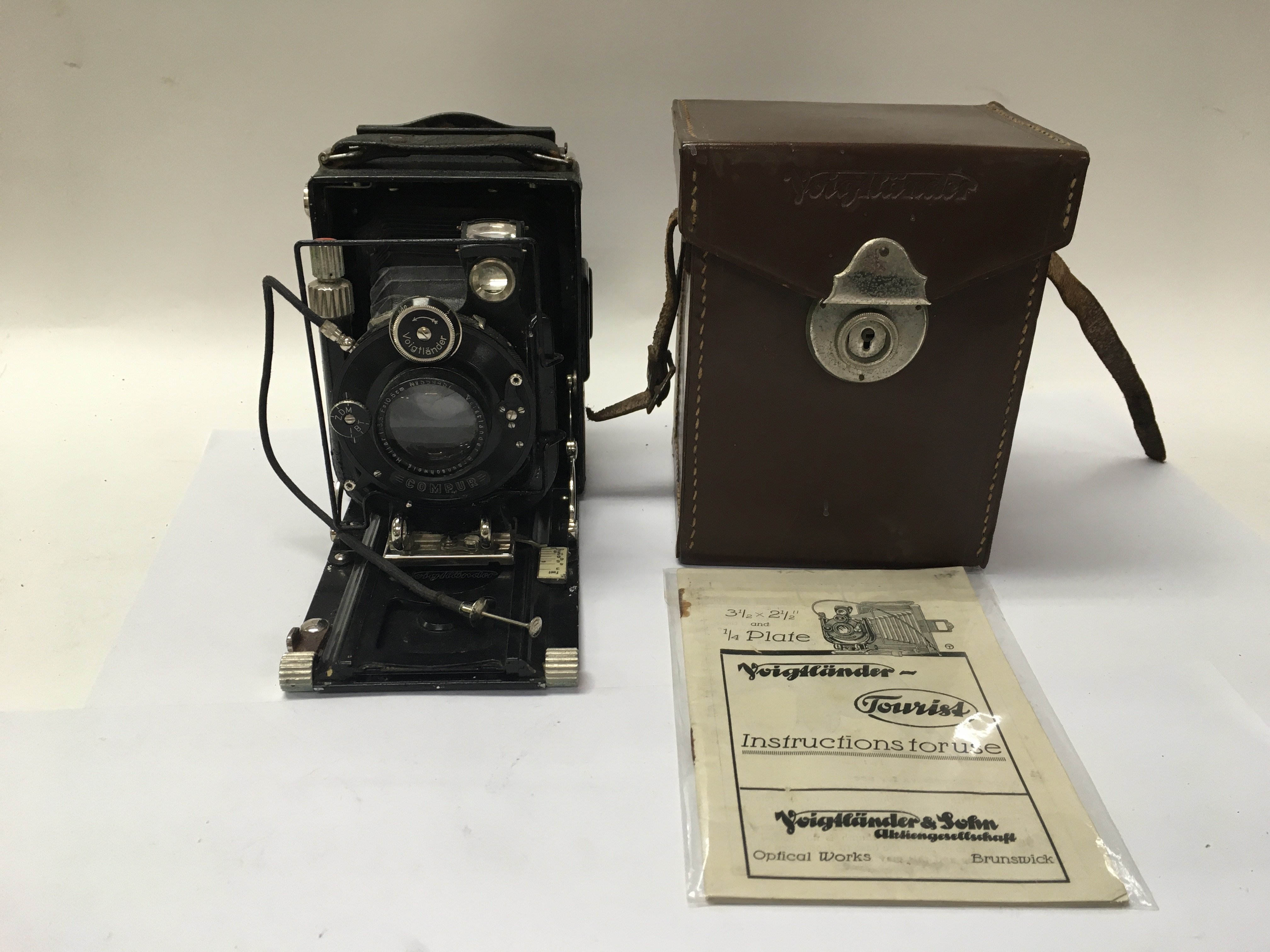 A rare Voigtlander plate camera with original instructions and leather carry case.