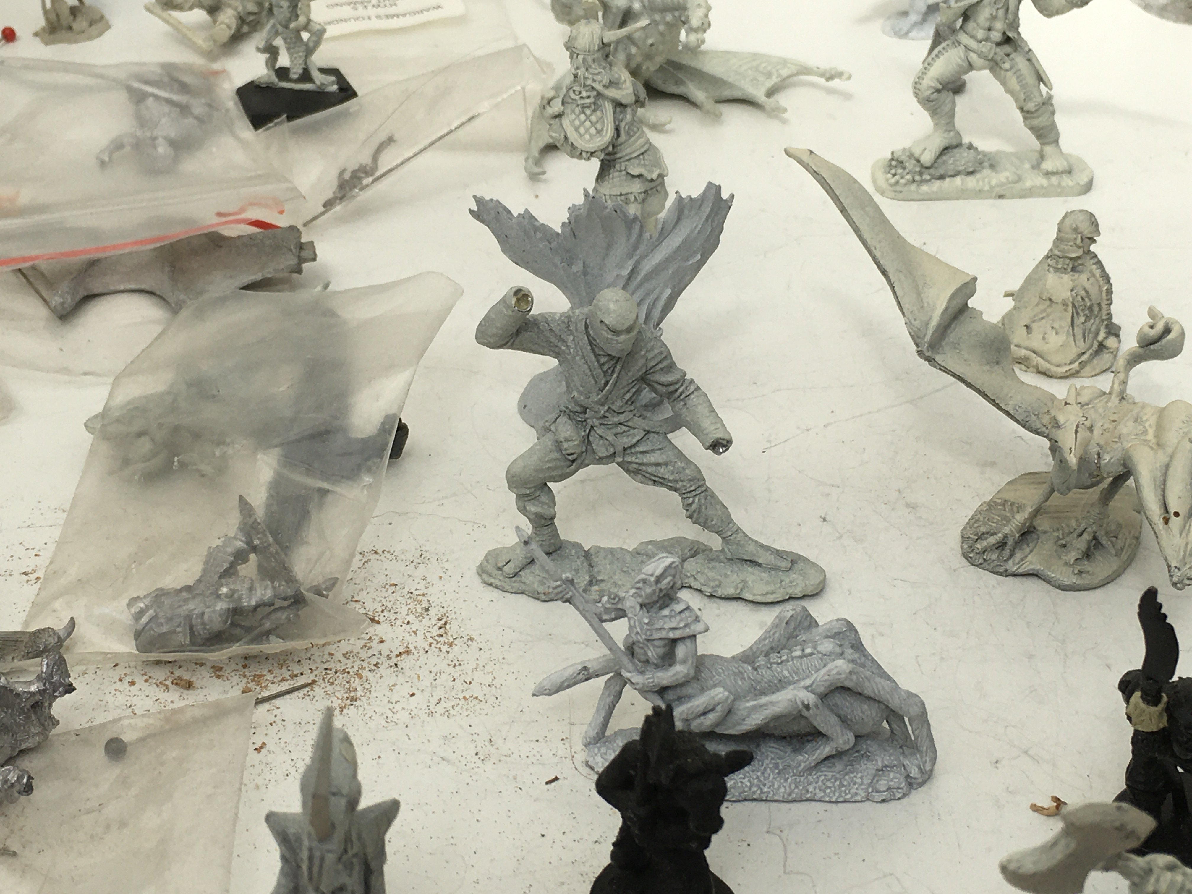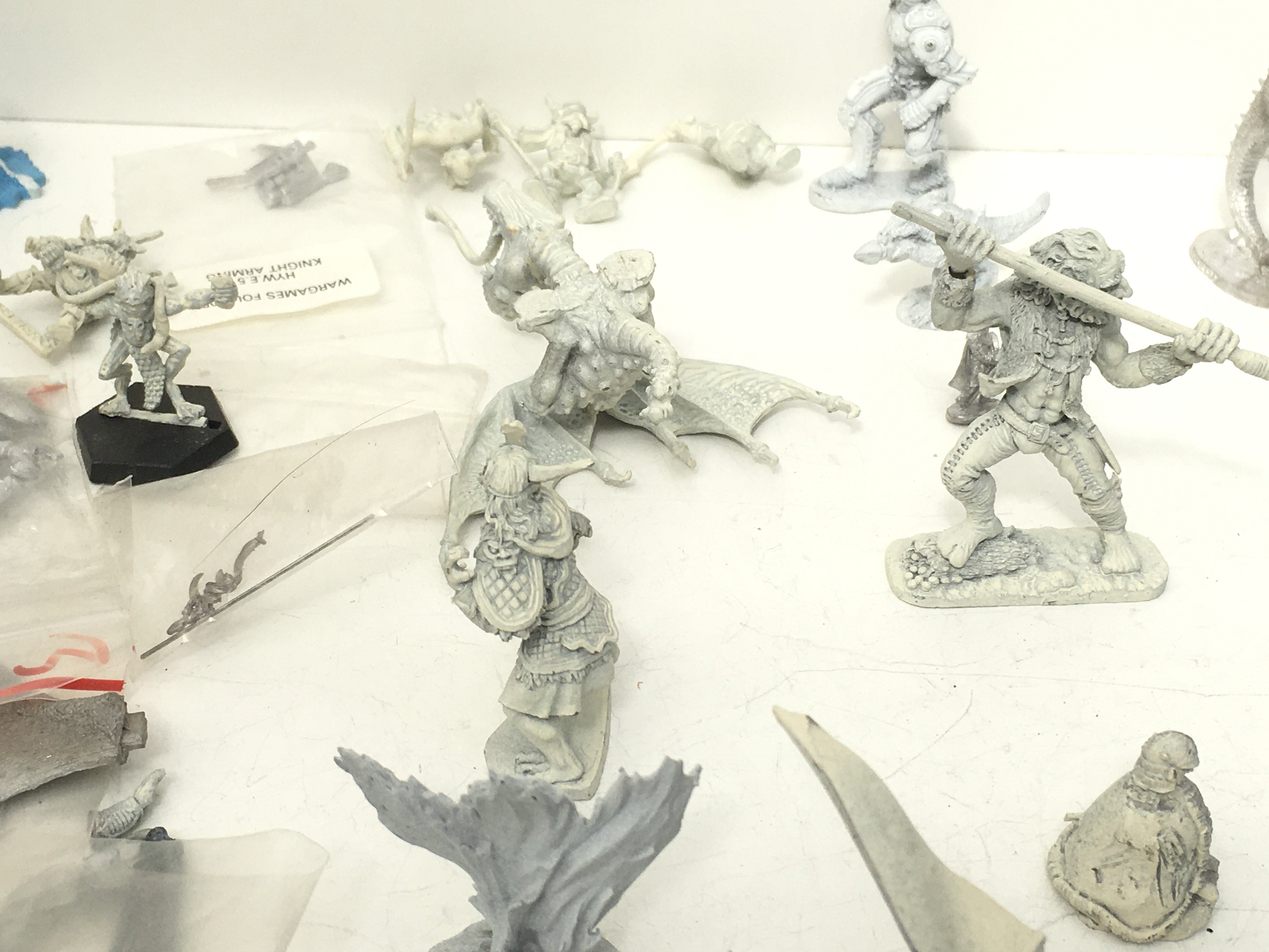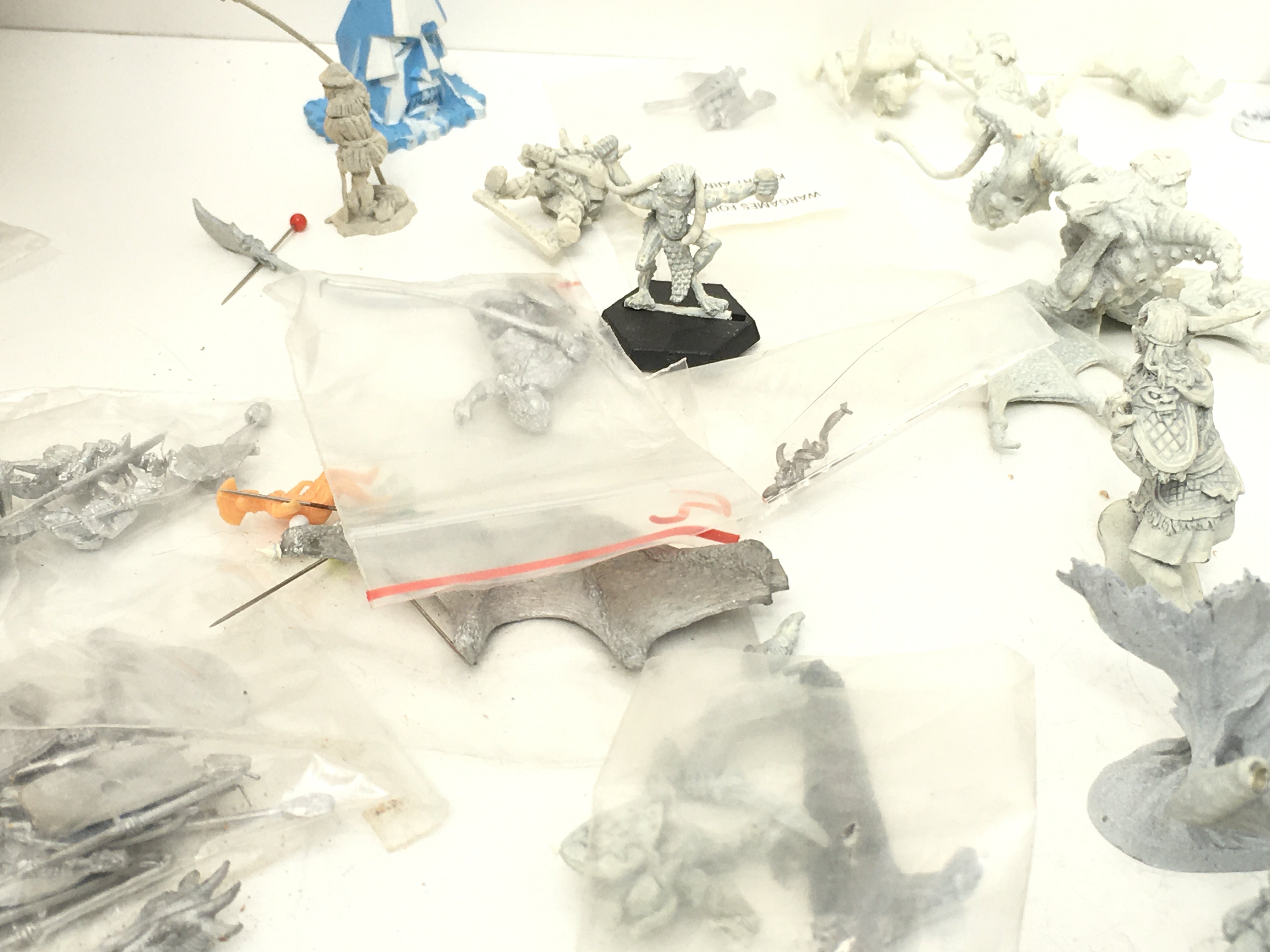 A collection in excess of 50 pieces of metal Warhammer figures and accessories. Mostly unpainted.