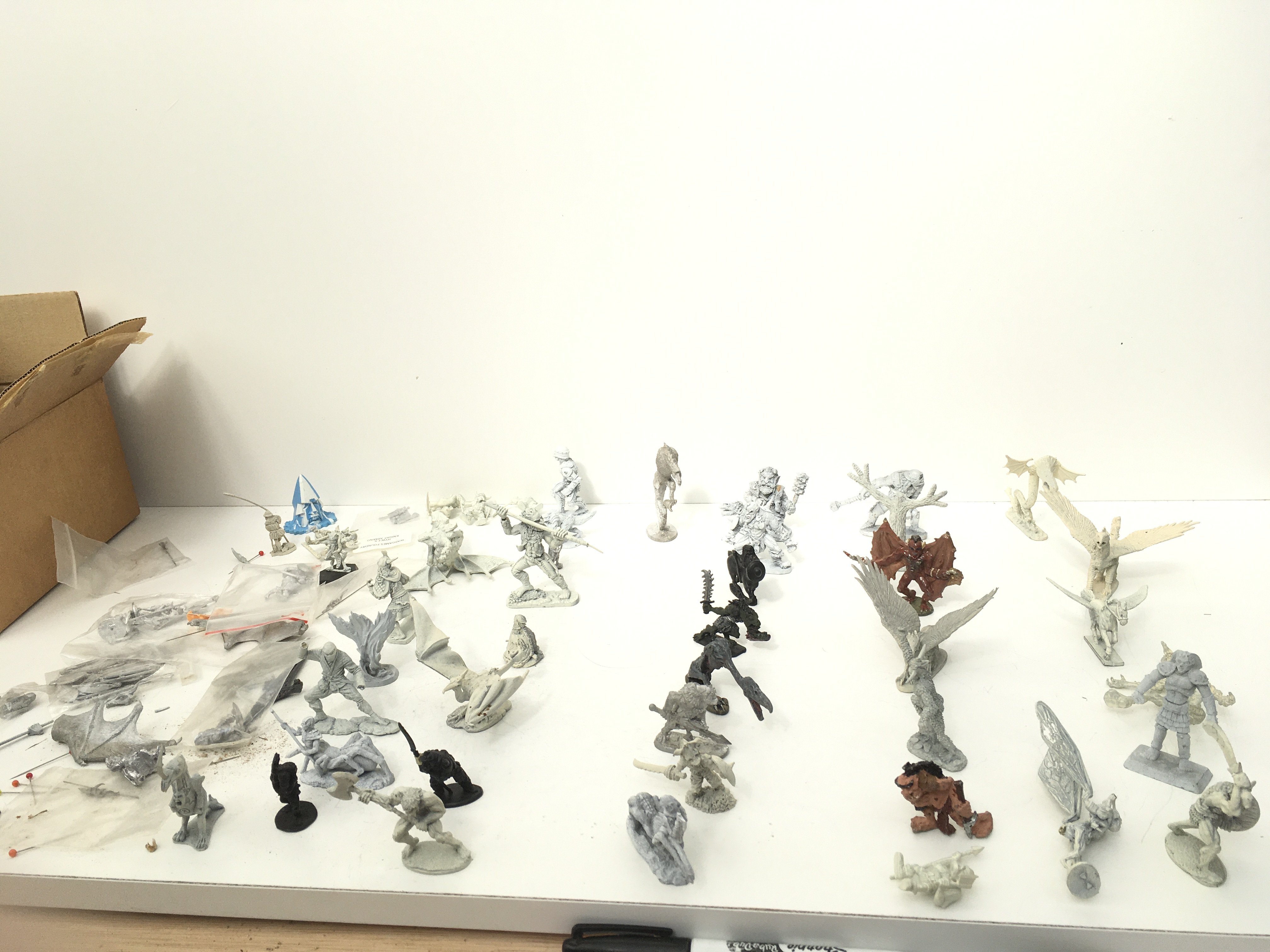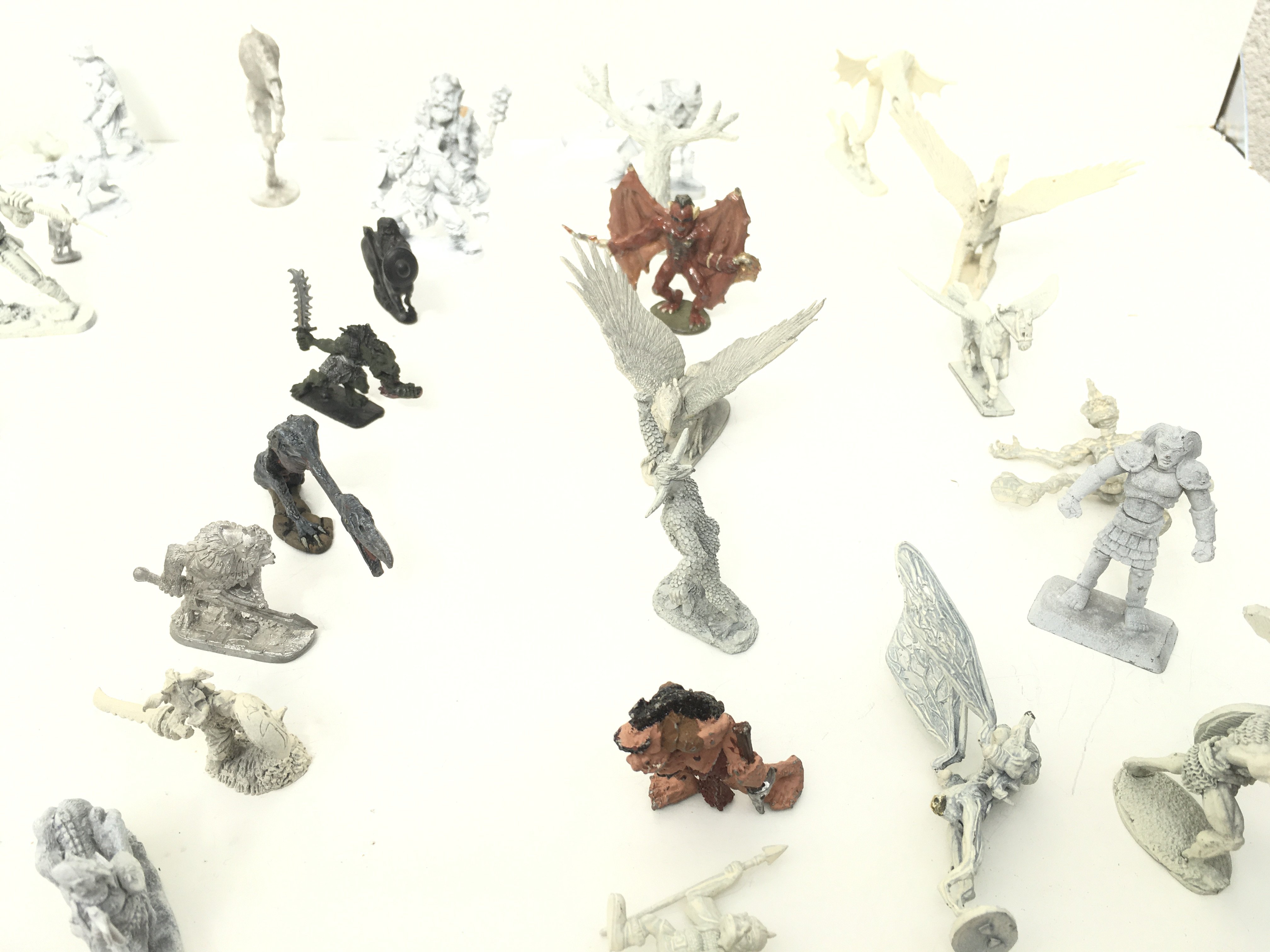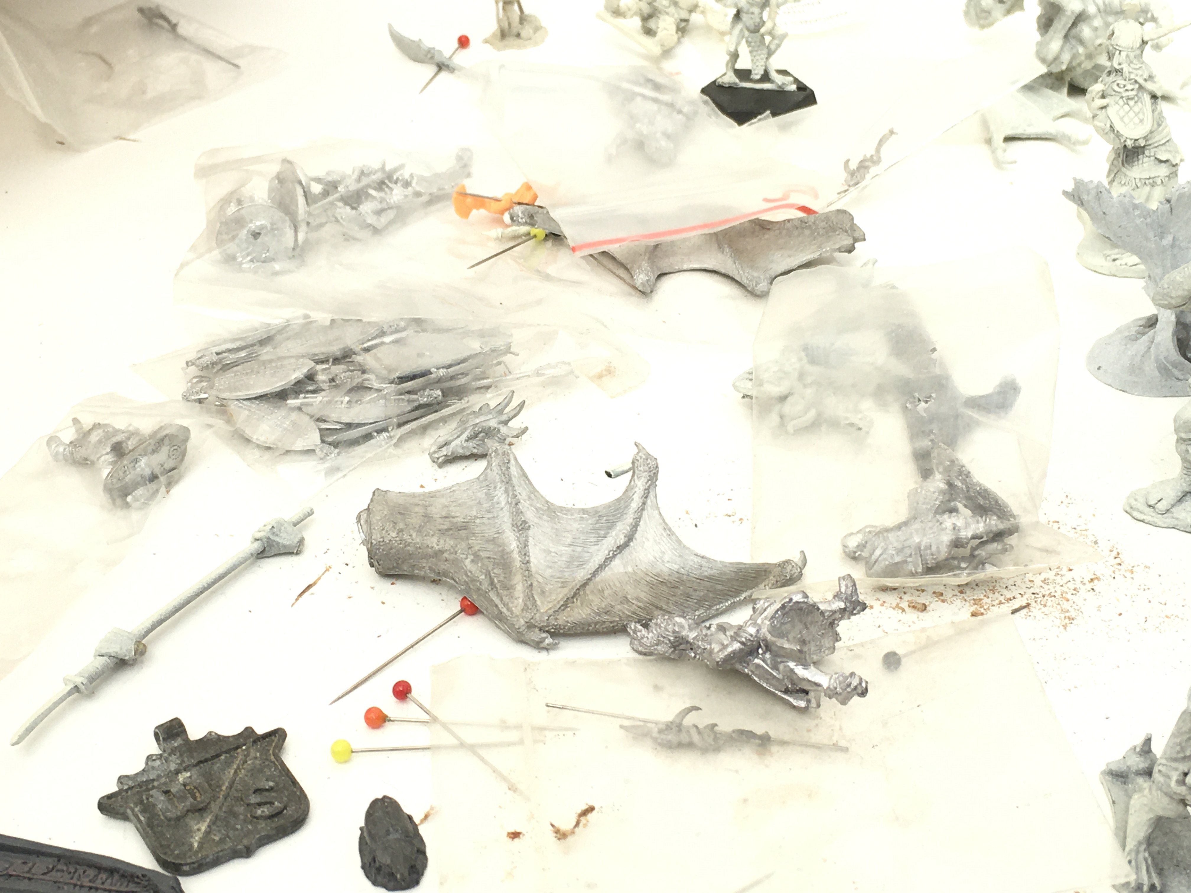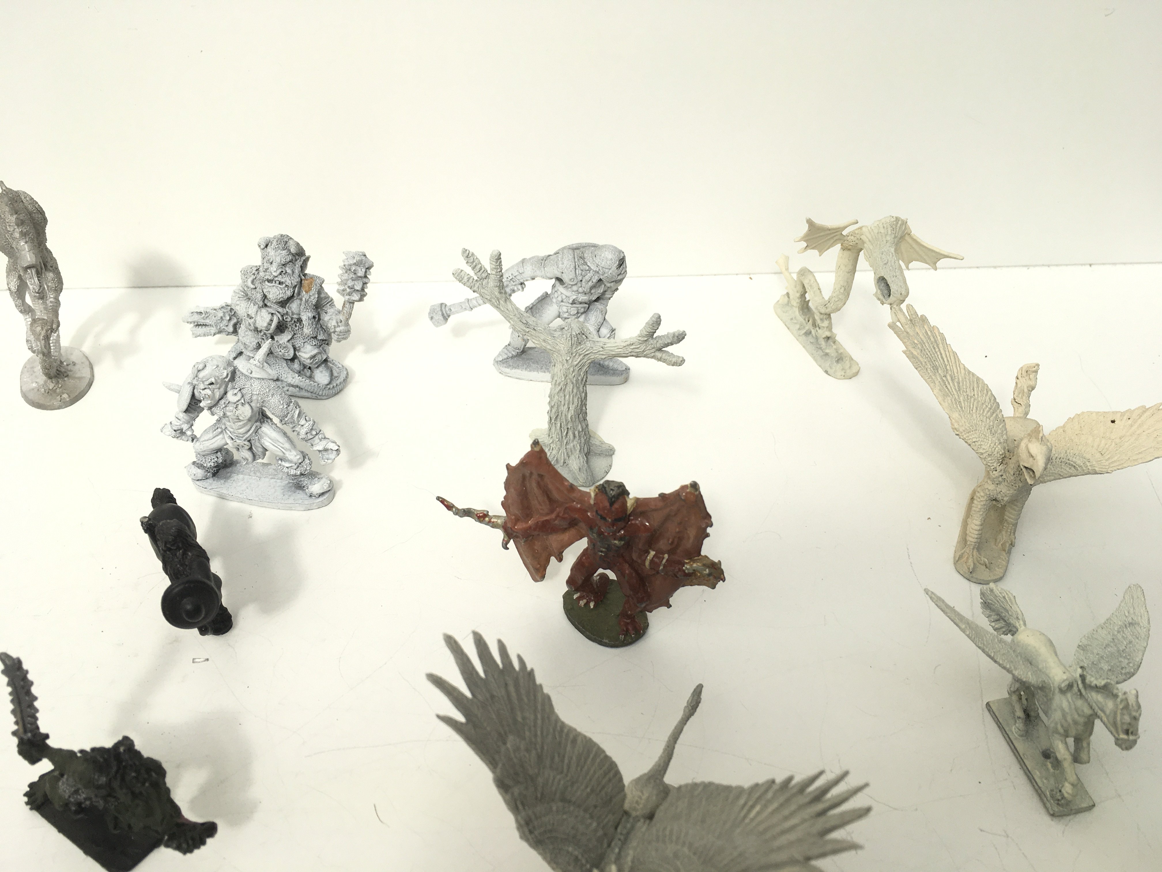 A collection in excess of 50 pieces of metal Warhammer figures and accessories. Mostly unpainted.