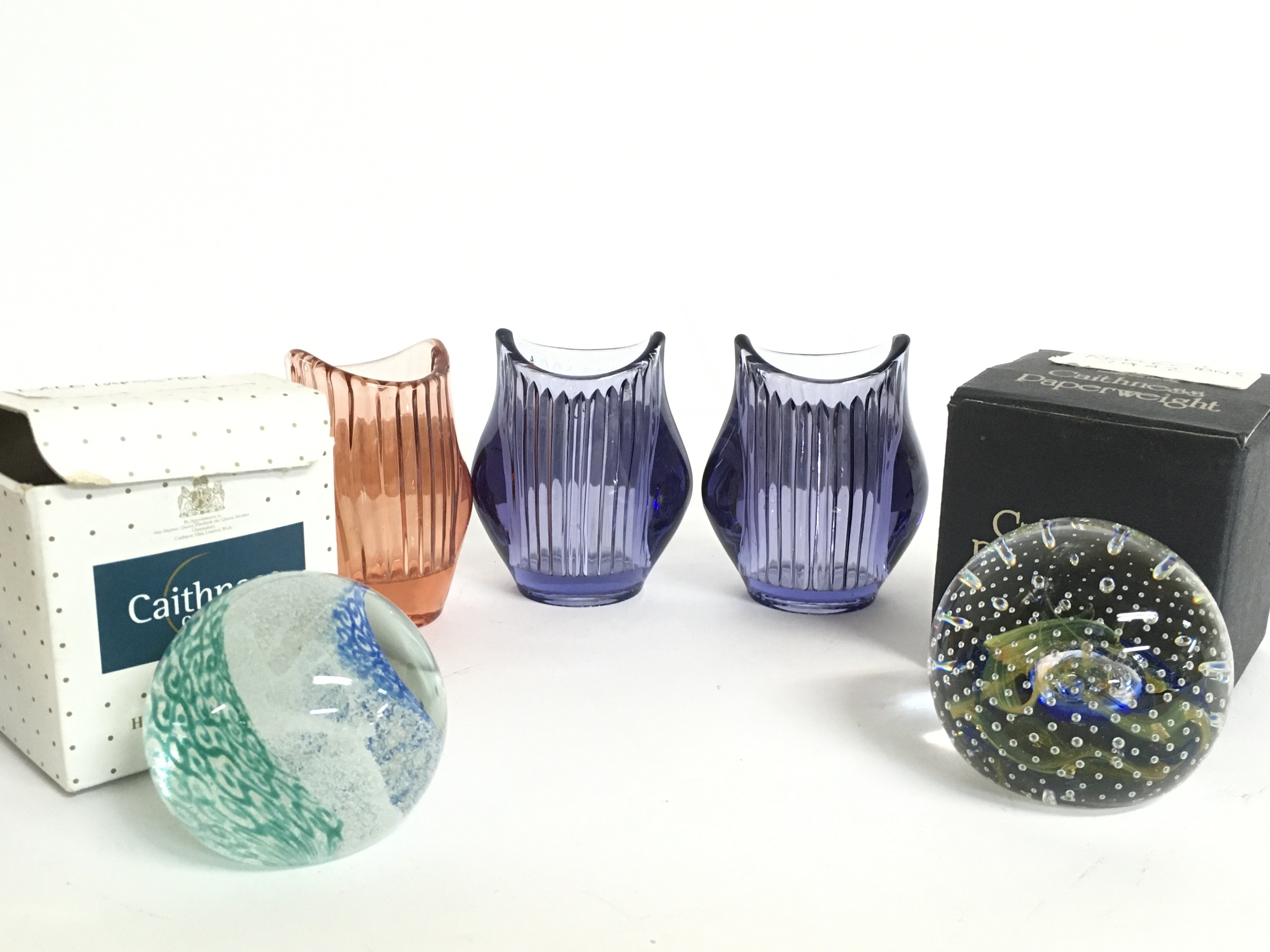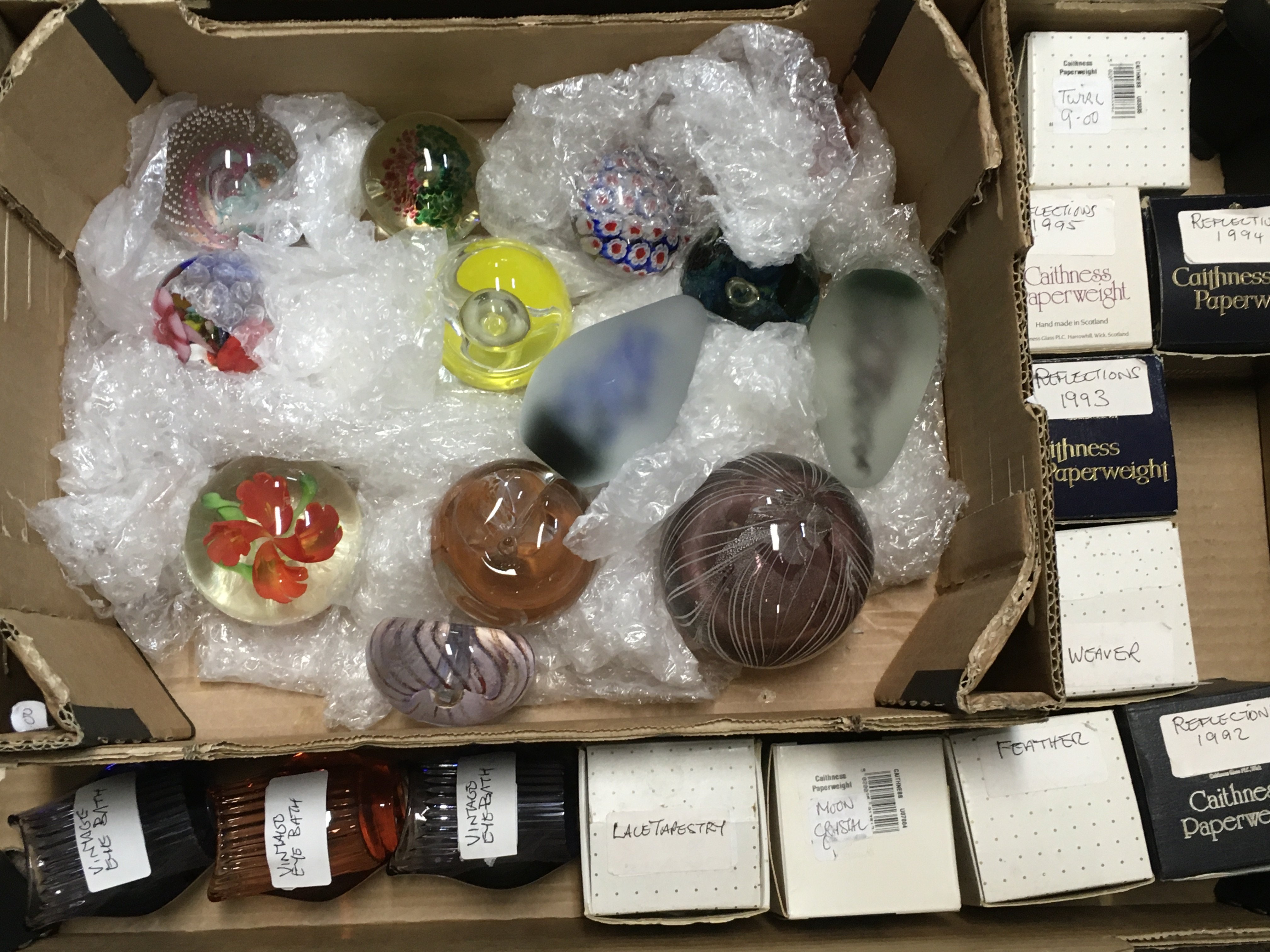 A collection of paperweights, vintage eye baths, Caithness Boxed paperweights. This lot cannot be posted