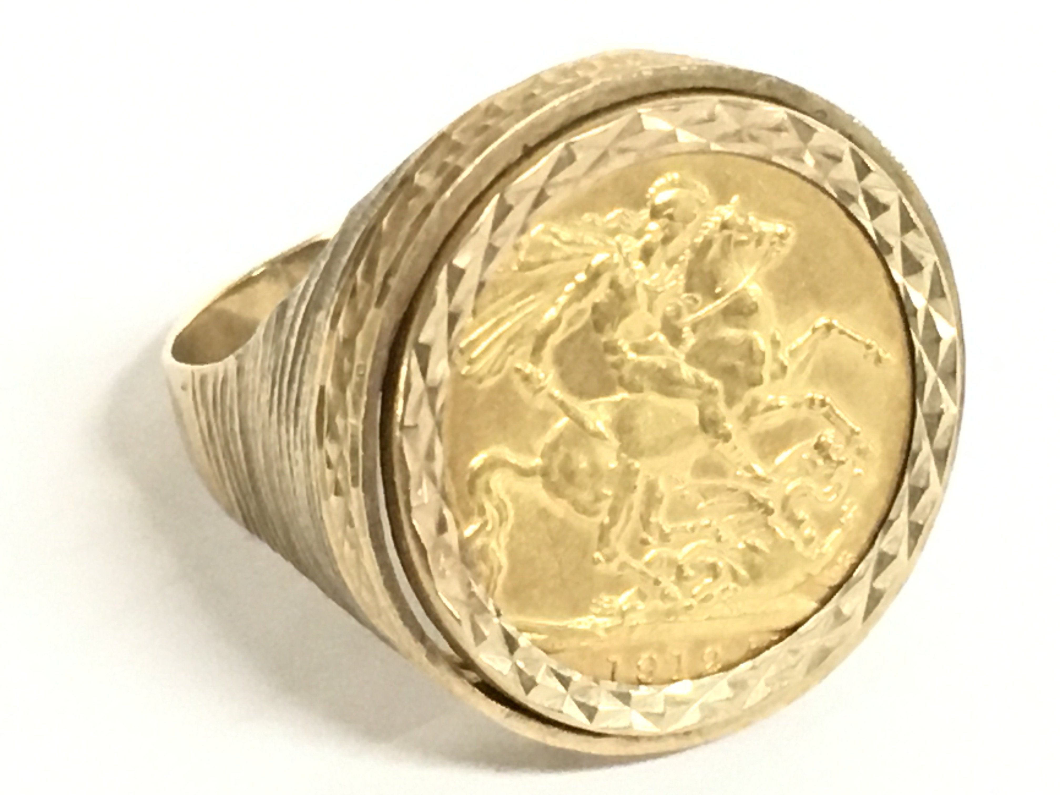 A 1912 full sovereign 9ct gold ring. 14.4g total weight. Postage category A