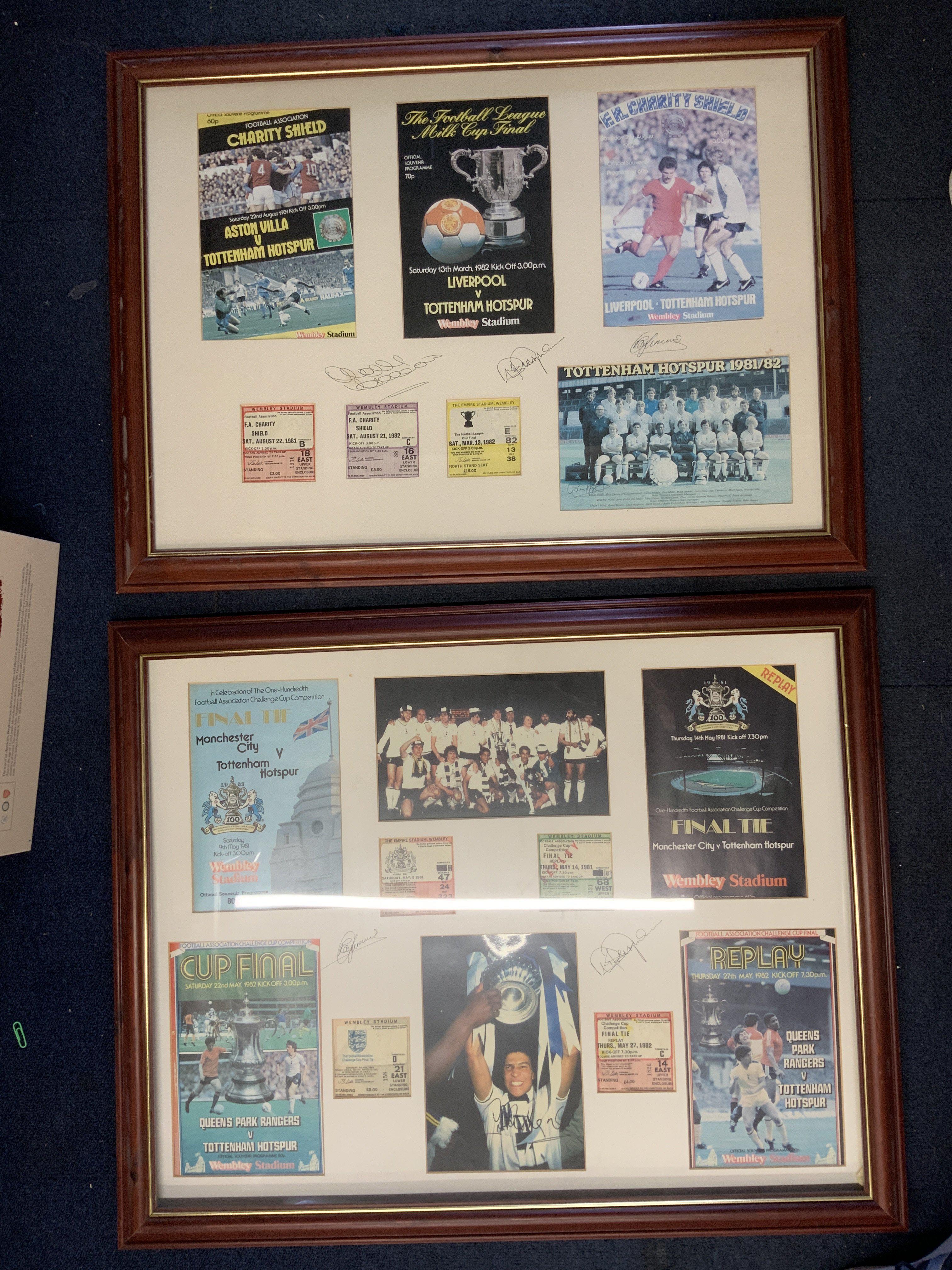 Tottenham 81 + 82 Big Match Signed Framed Displays: Frame one has all 4 cup final + replay tickets and a signed picture of Hughton holding the FA Cup. The board is additionally signed by Clemence and Perryman. Second frame has the two Charity Shield programmes and 82 League Cup final with accompanying tickets and a picture of the squad with cups. The board is signed by Clemence Perryman and Falco. Backs of frames need resealing. 2 frames not for posting.