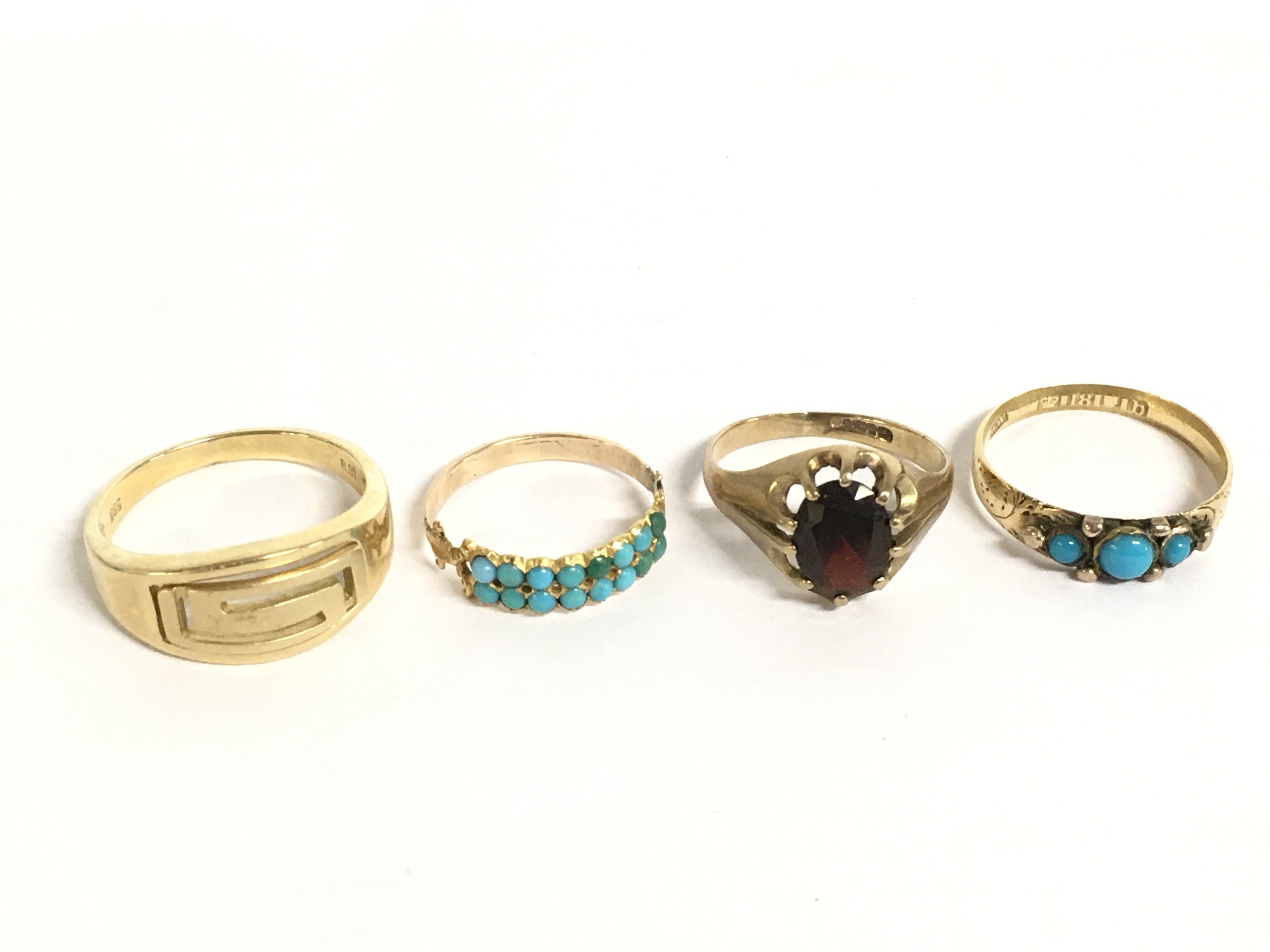 Four gold rings sizes T,L,L/M,P. Some turquoise stone set rings and a Garnet stone set ring.11.2g Postage category A
