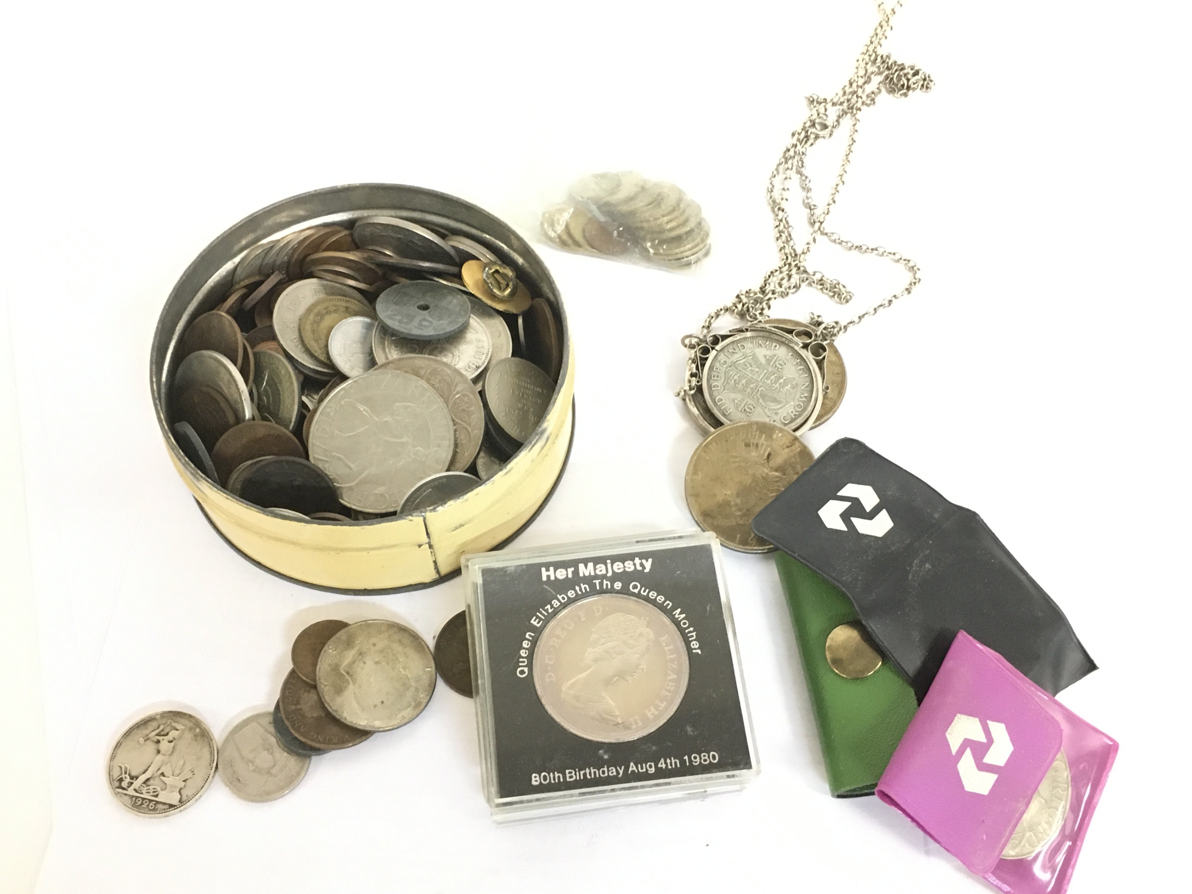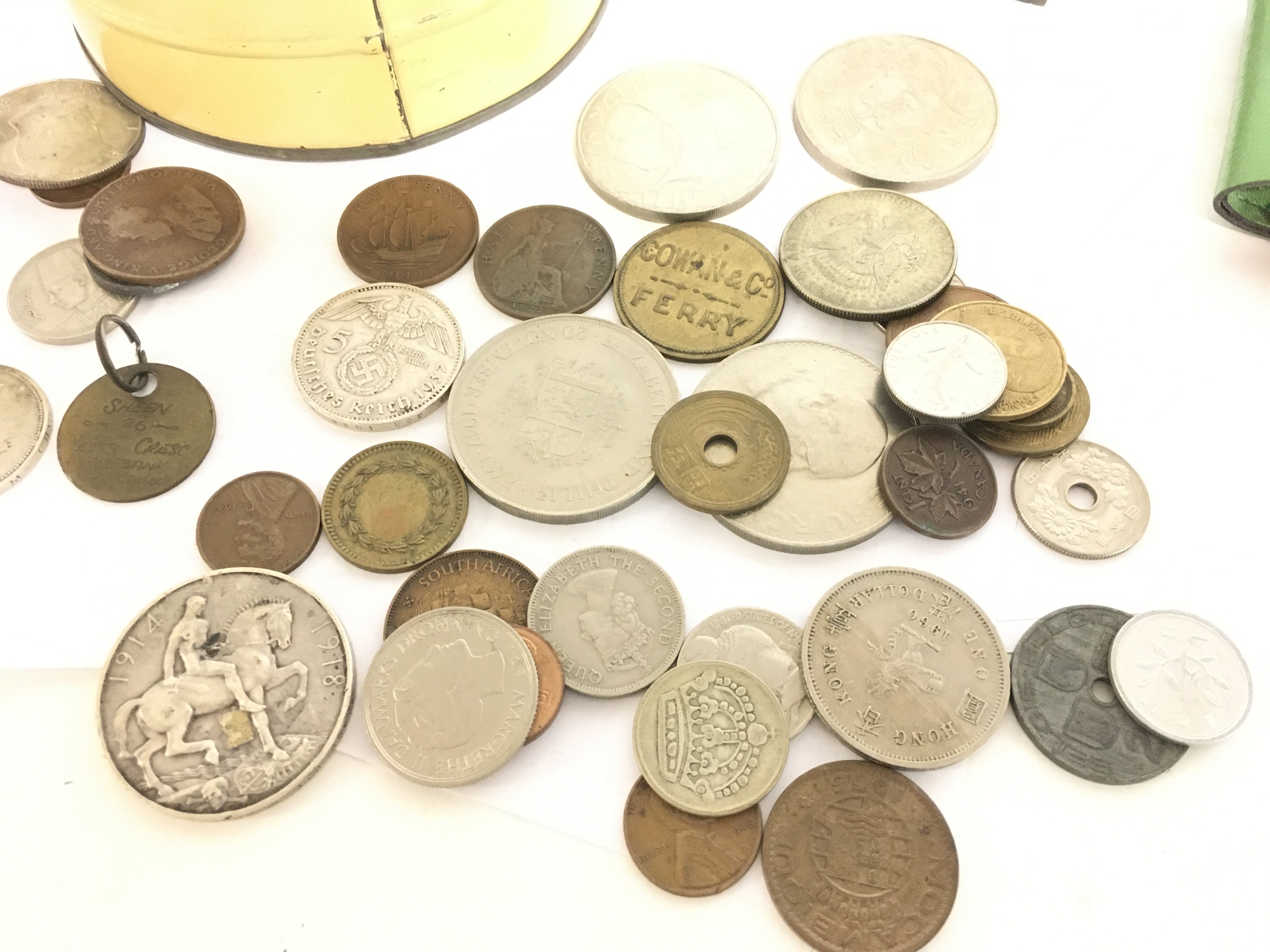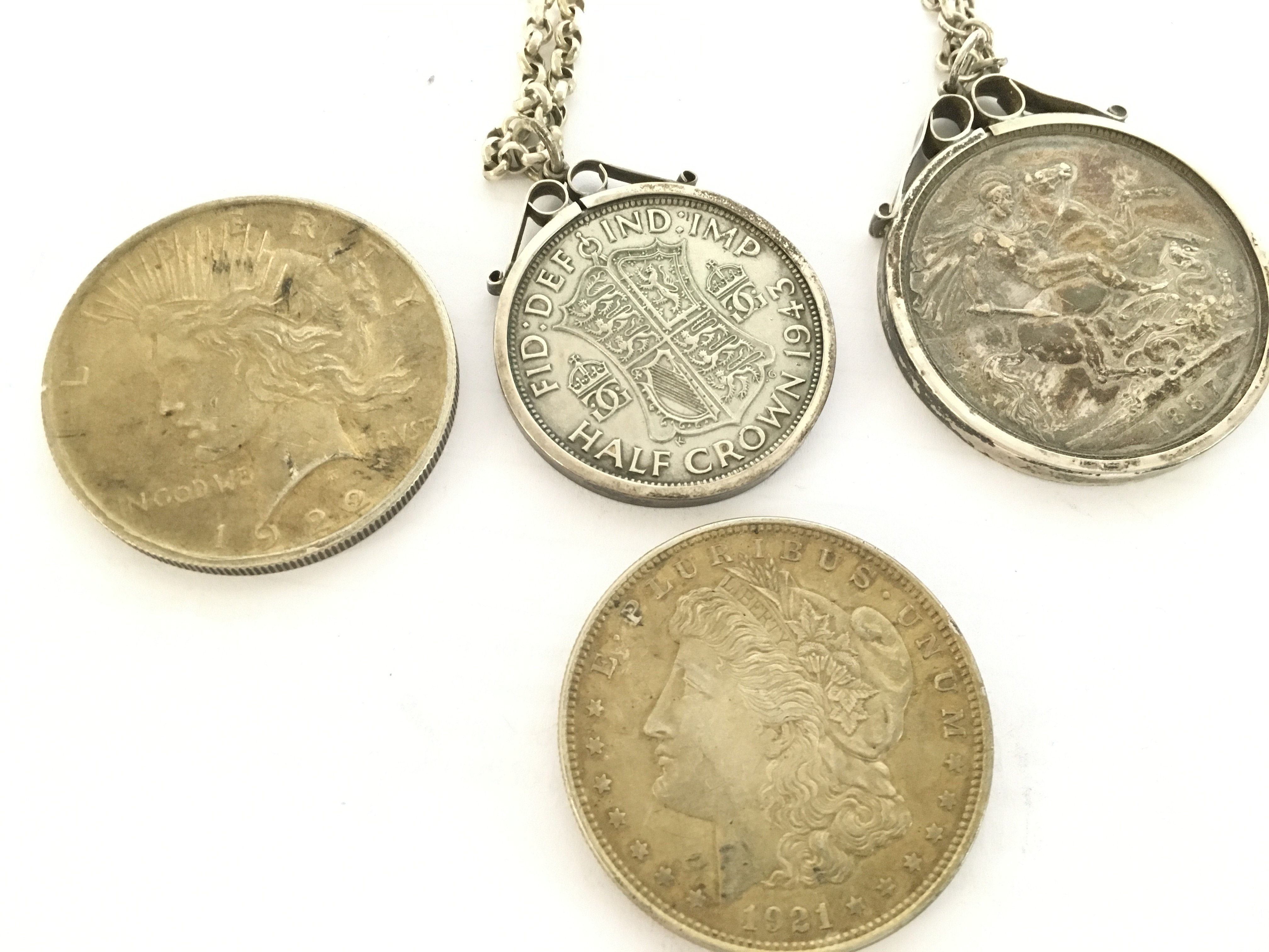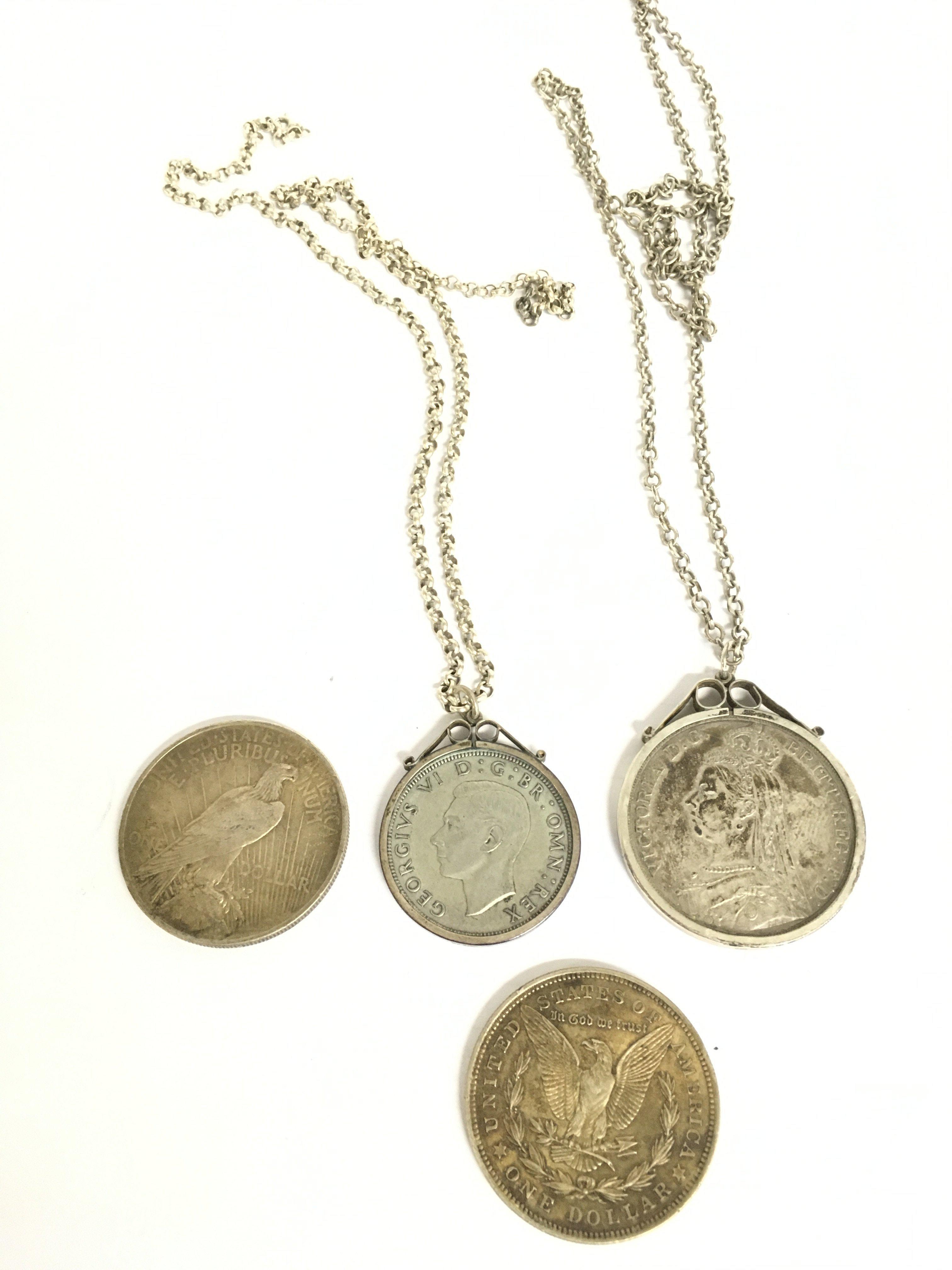 A collection of coins including 1922 one dollar, 1943 half crown, 1921 one dollar, 1887 silver sovereign