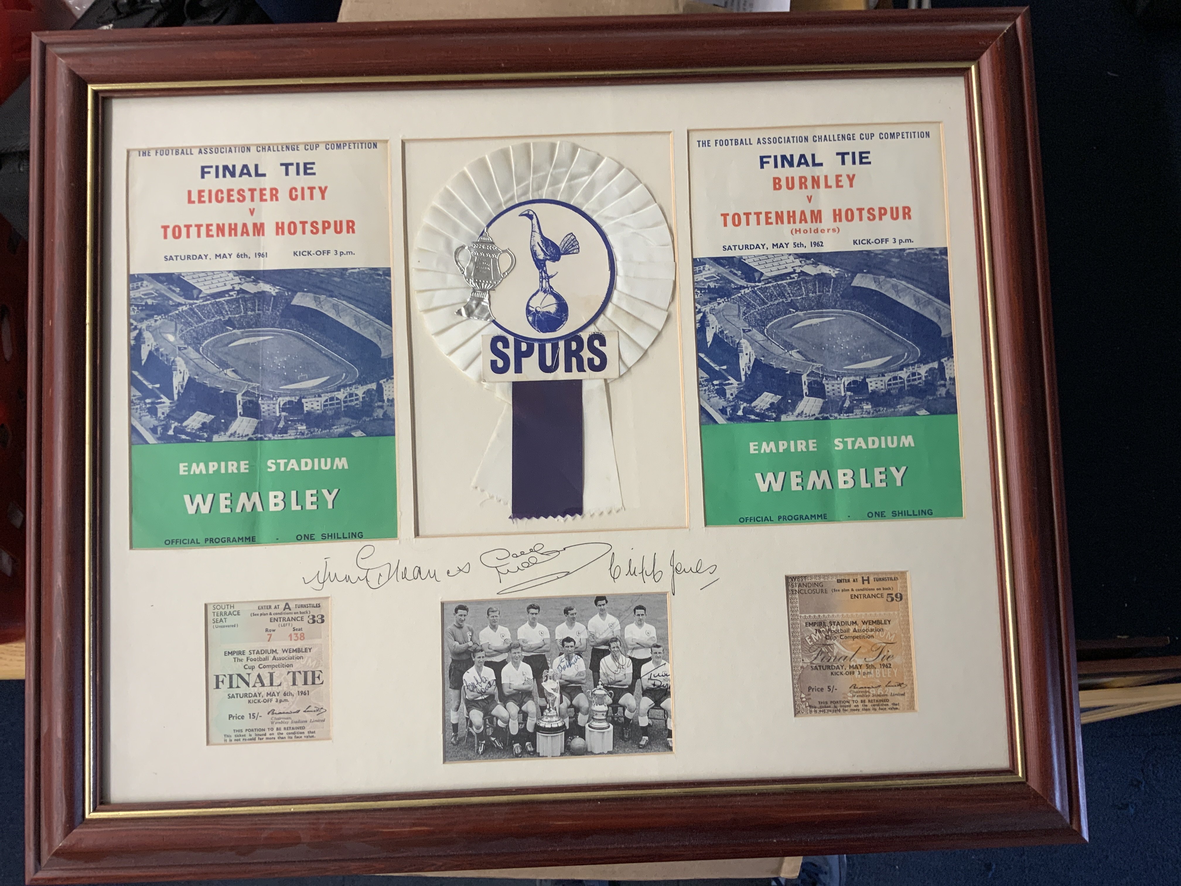Tottenham 1961 + 1962 FA Cup Final Display: Original programmes and tickets to both victorious matches. Original rosette plus a team group signed by 5 and the mounting board signed by a further 3.