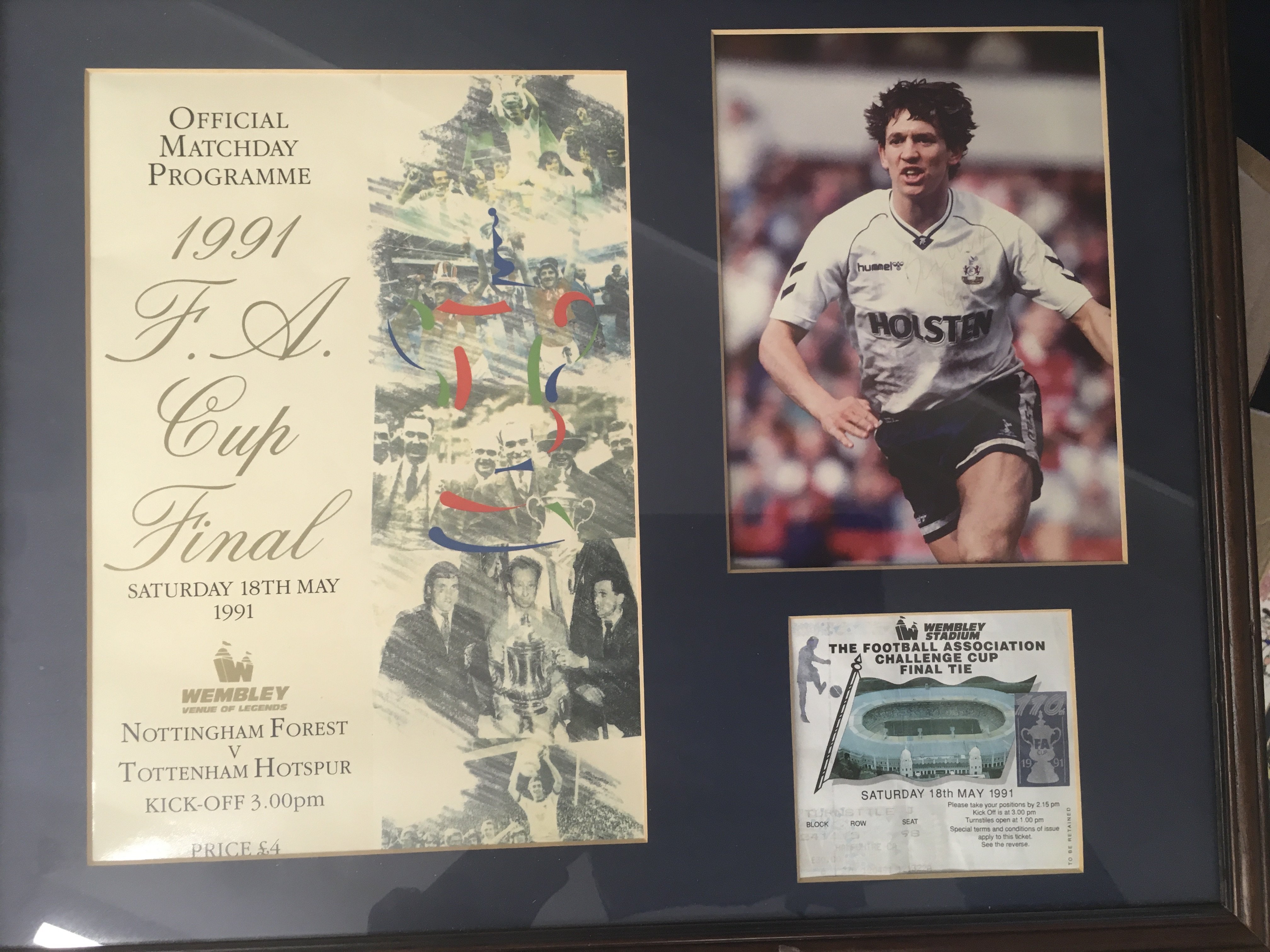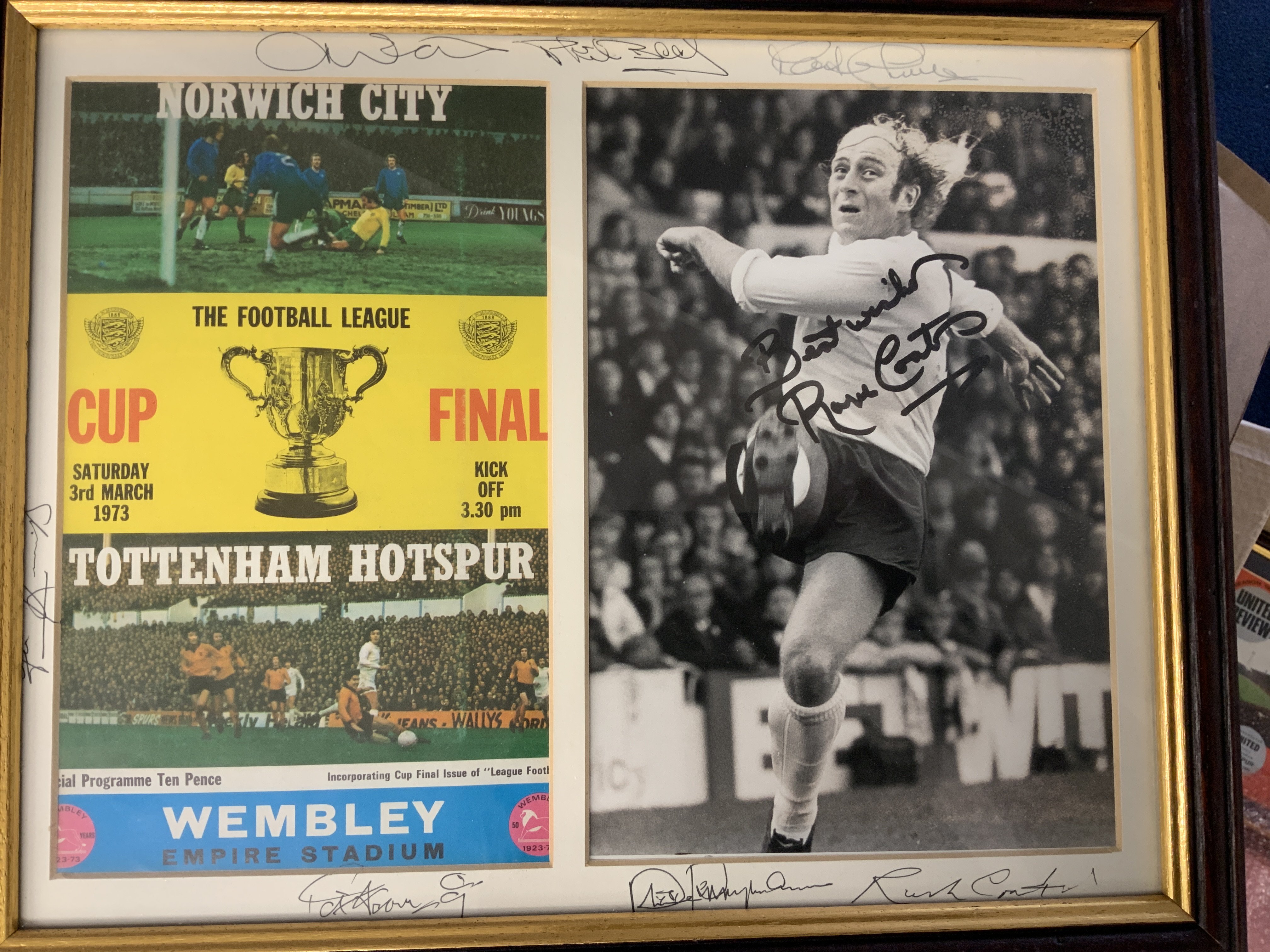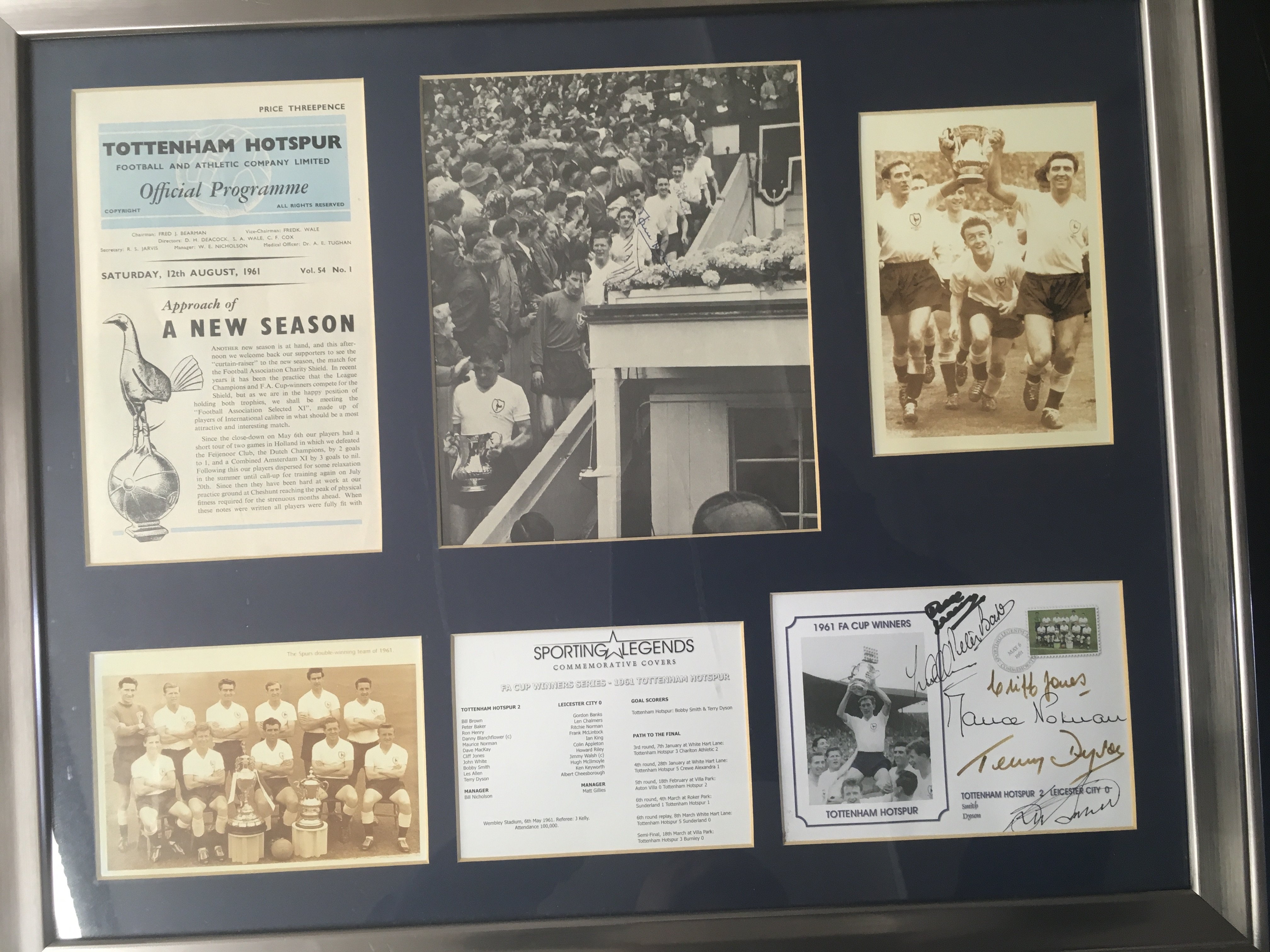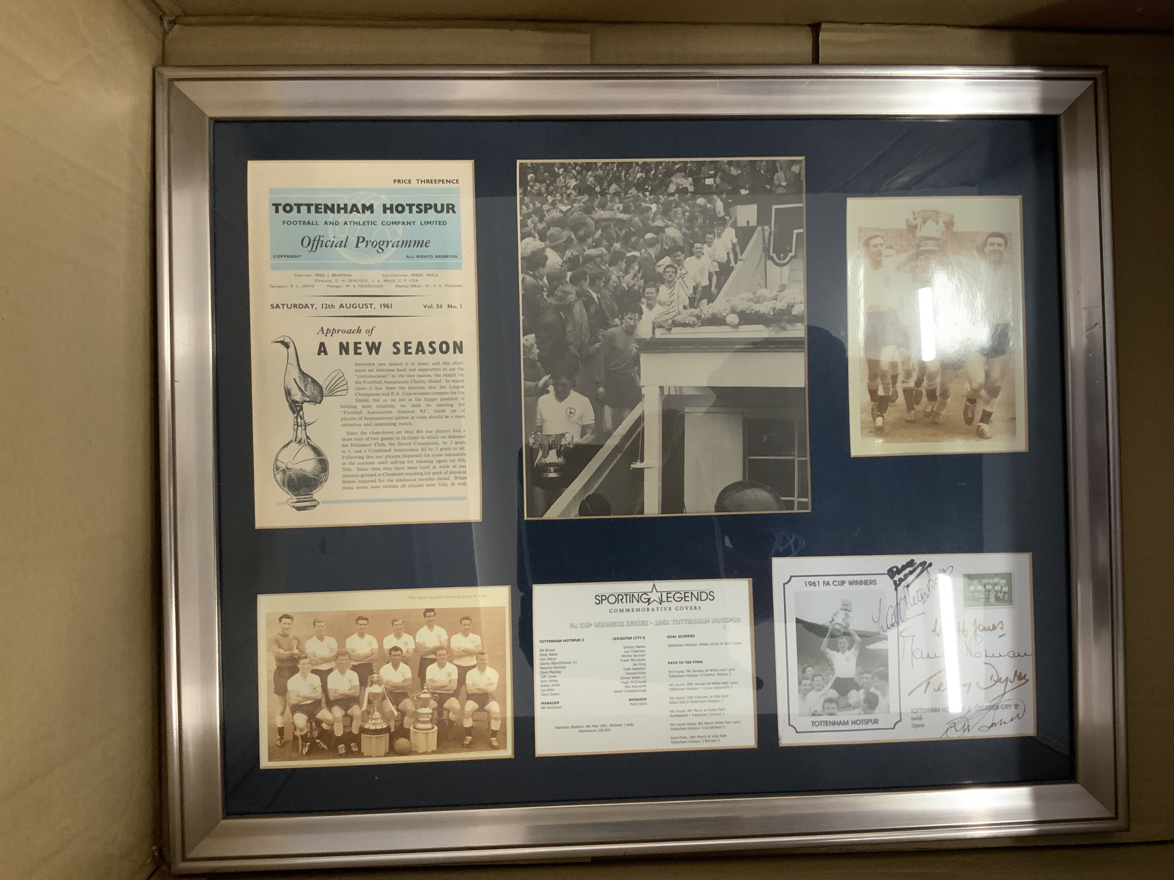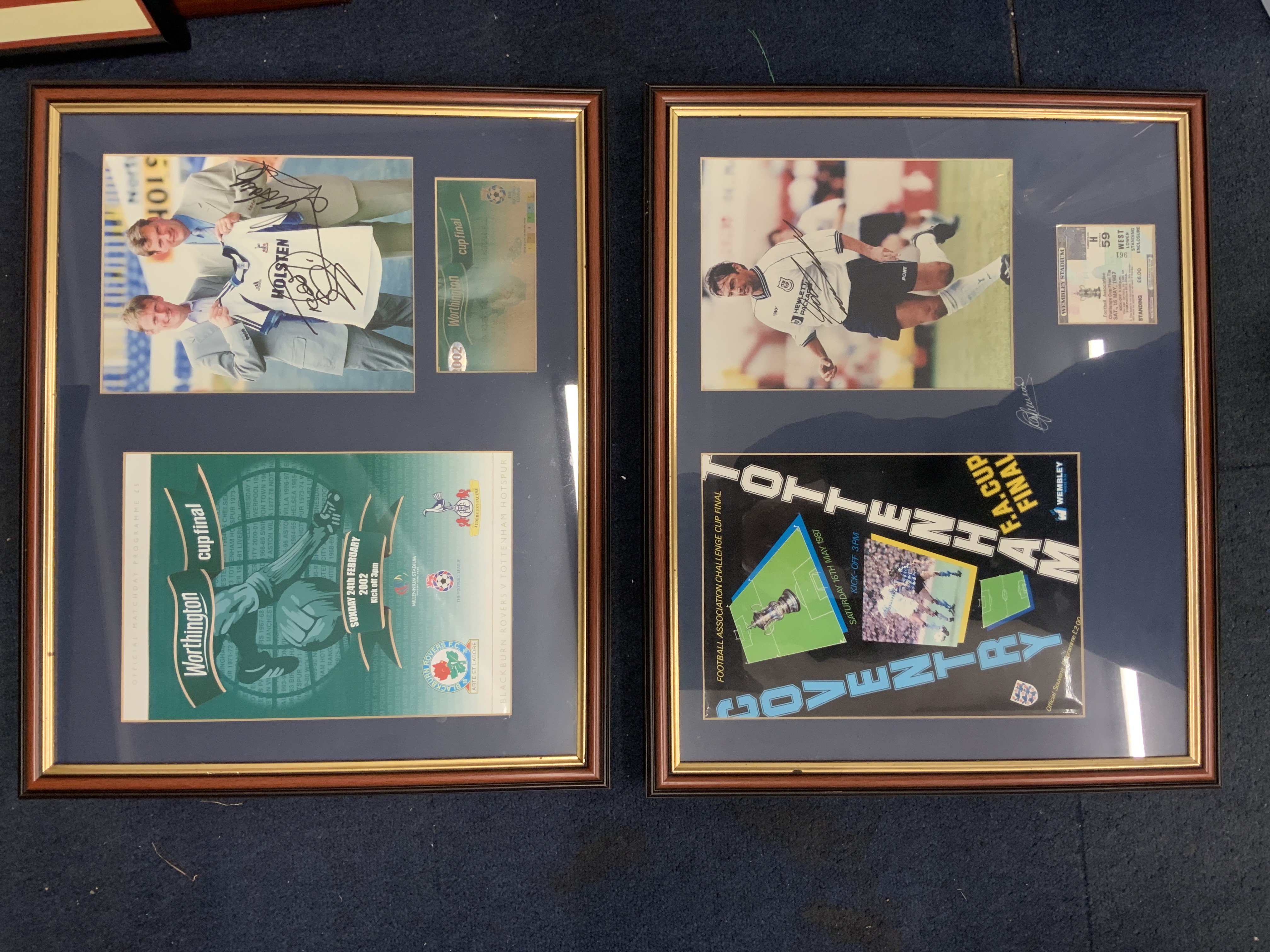 Tottenham Big Match Signed Framed Displays: Just about everything covered in these nice displays of famous moments in their history. 1961 has 9 autographs, 1963 slight fading signed by 3, 1991 FA Cup Final with original programme + ticket, 1974 UEFA Cup final x 5, Two different 1999 Worthington Cup one fully signed, 1967 Charity Shield x 4, 1971 League Cup Final x 5, 1967 FA Cup x 7, 1973 League Cup Final x 8, 1972 UEFA Cup final x 9. Other displays with original ticket and programme include 1991 Charity Shield, 2002 Worthington Cup and 1991 FA Cup Final. Nice lot.