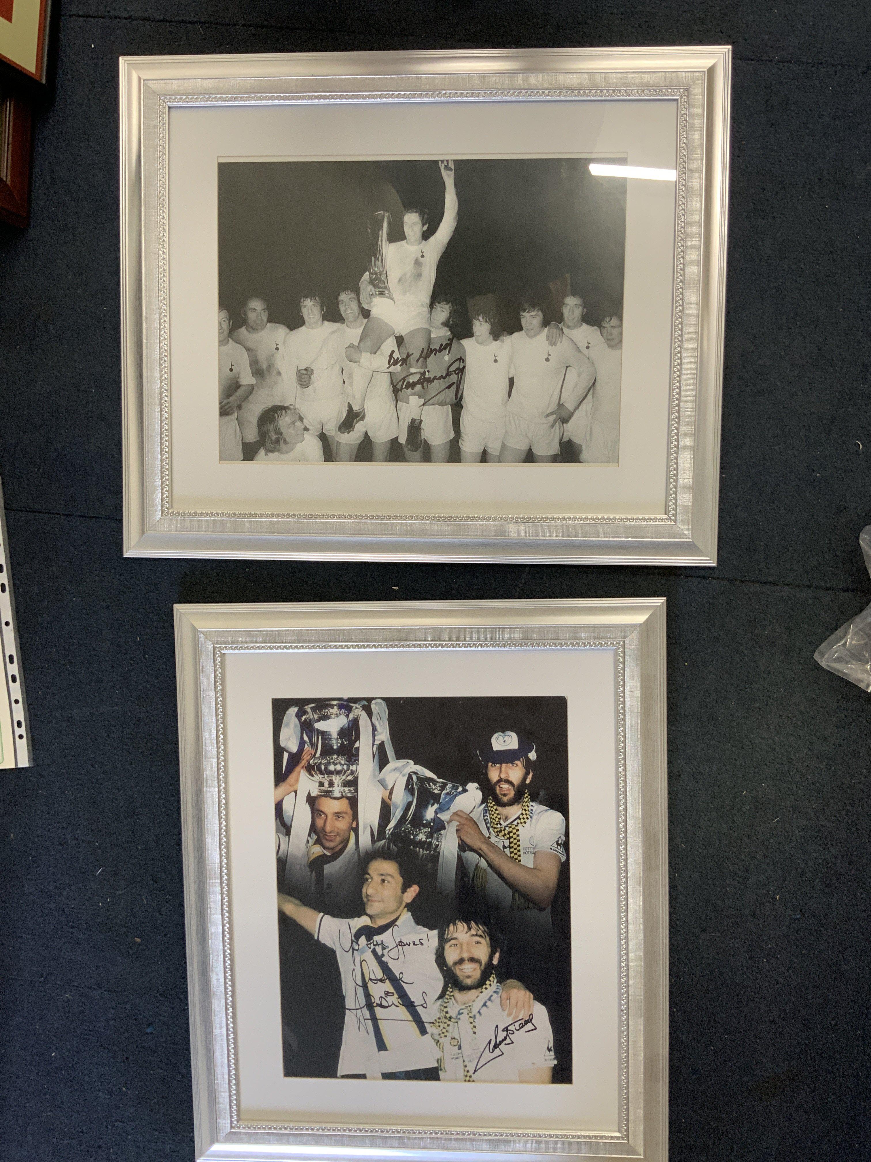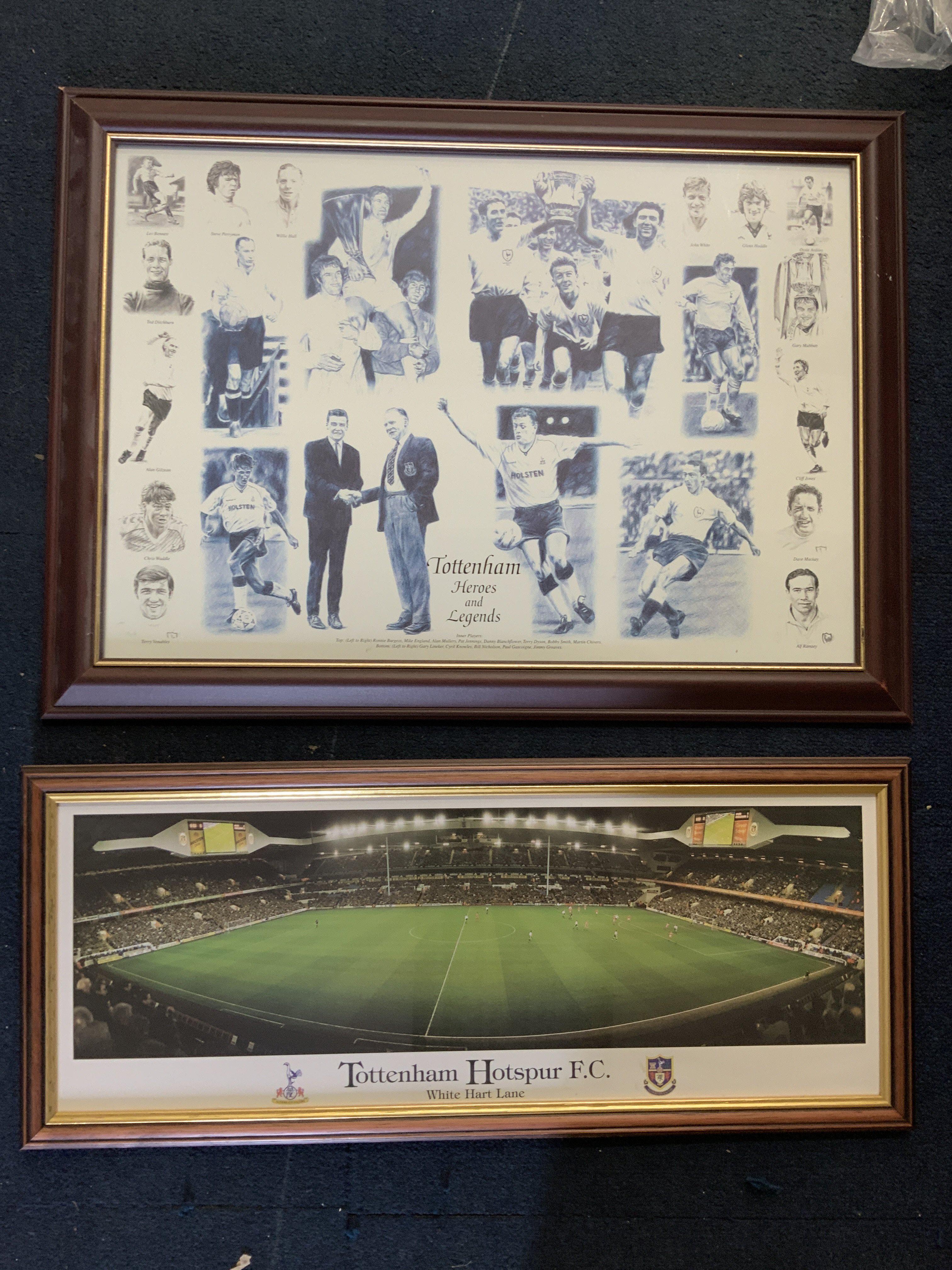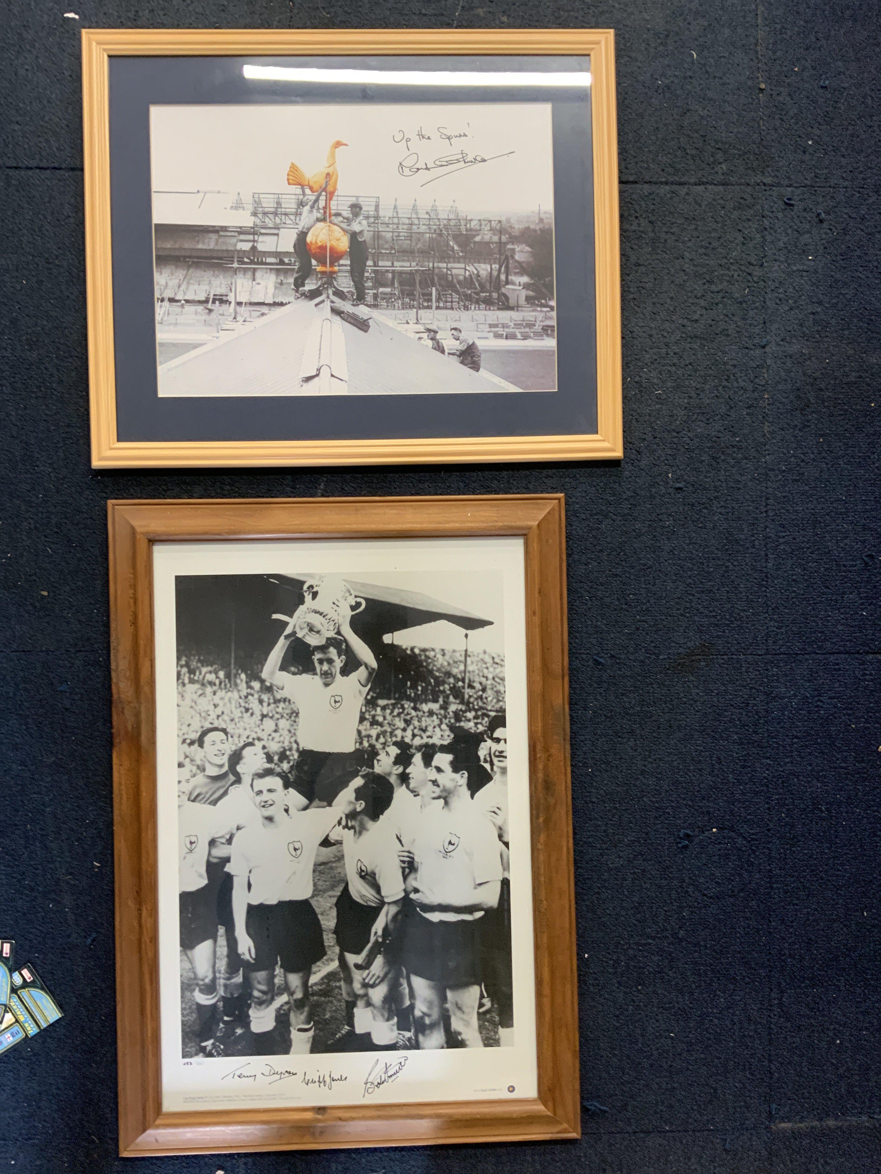 Tottenham Signed Framed Football Prints: Ltd edition print of Dyson Jones and Smith, Ardiles and Villa, Pat Jennings plus a lovely picture of the Cockerel on White Hart Lane signed by Chivers. C/W 2 other unsigned prints and a random Southend print. All framed and not for posting. (7)