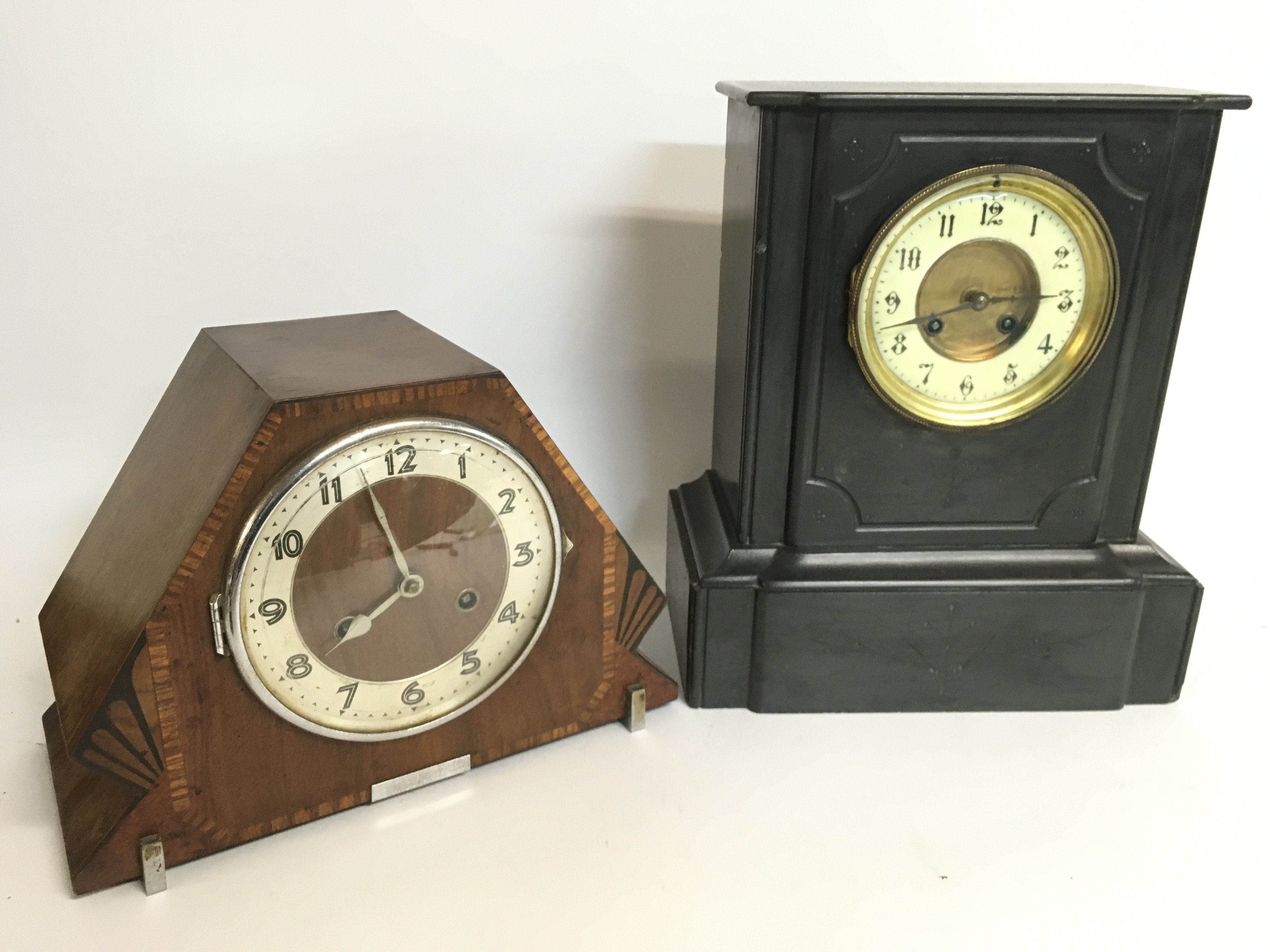 Mantle clocks including a slate clock and a wooden clock with inlaid design