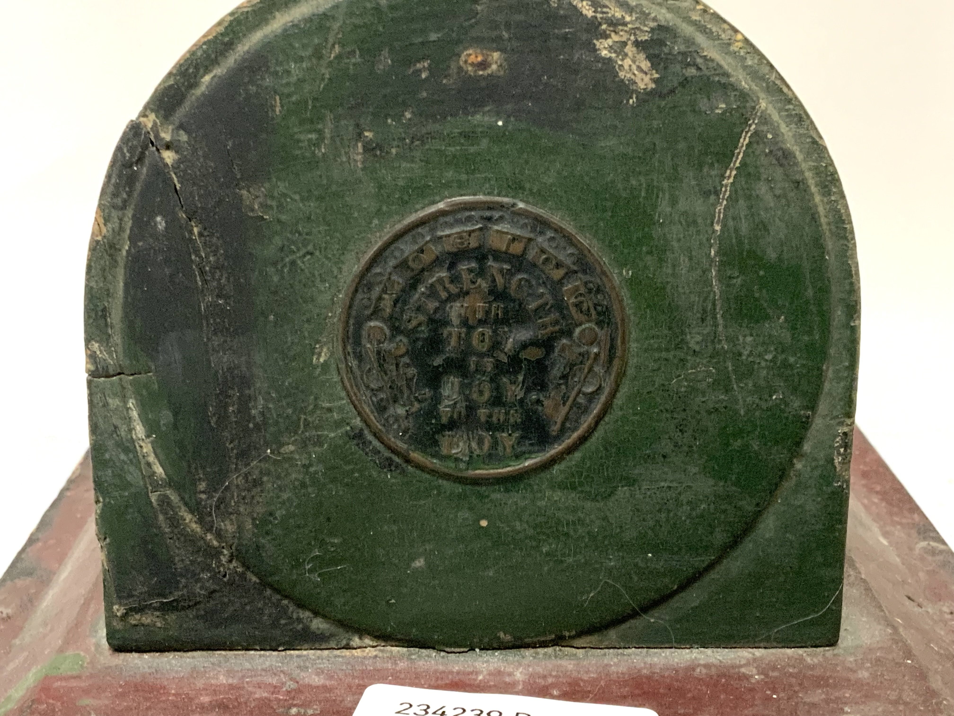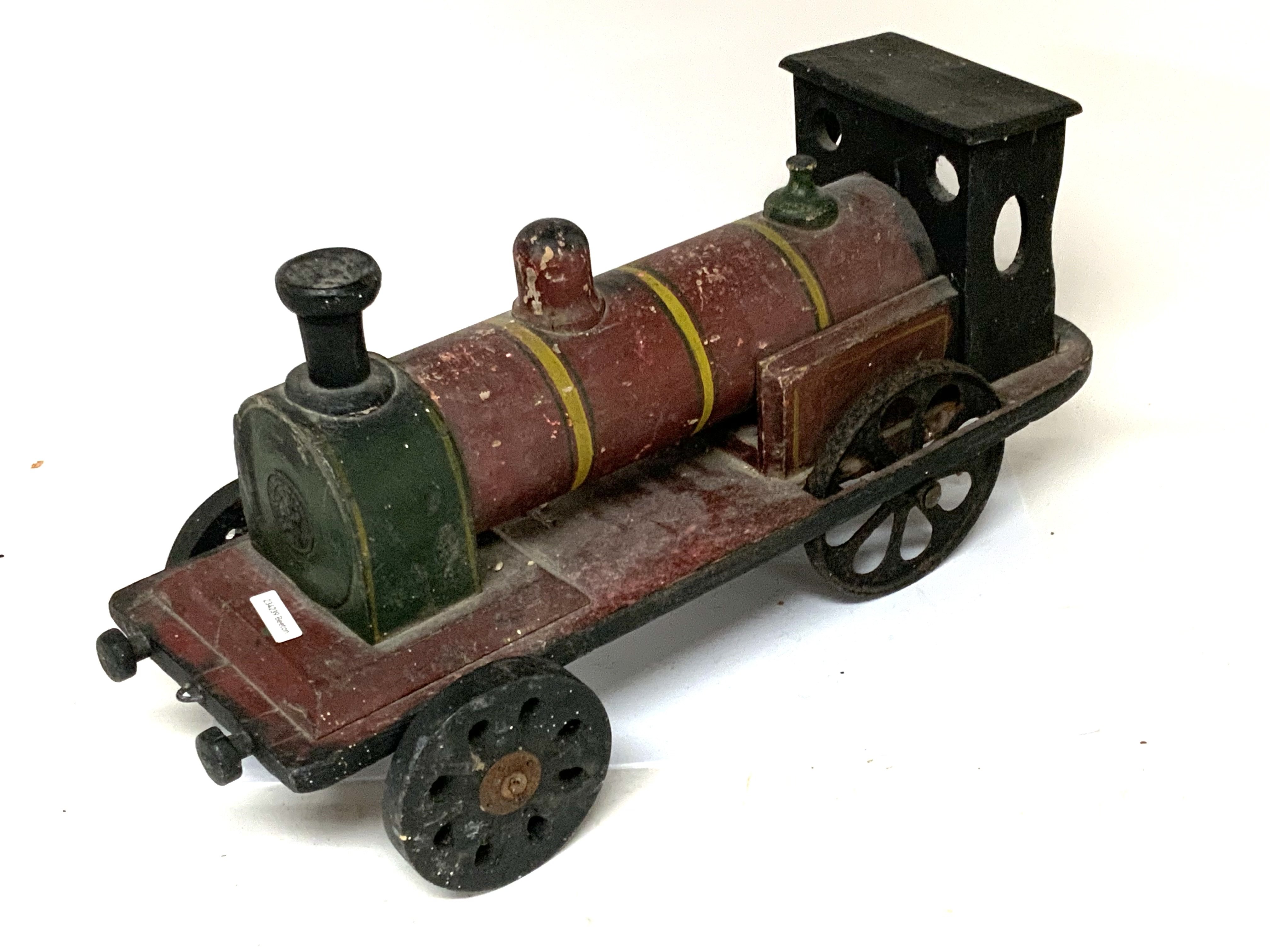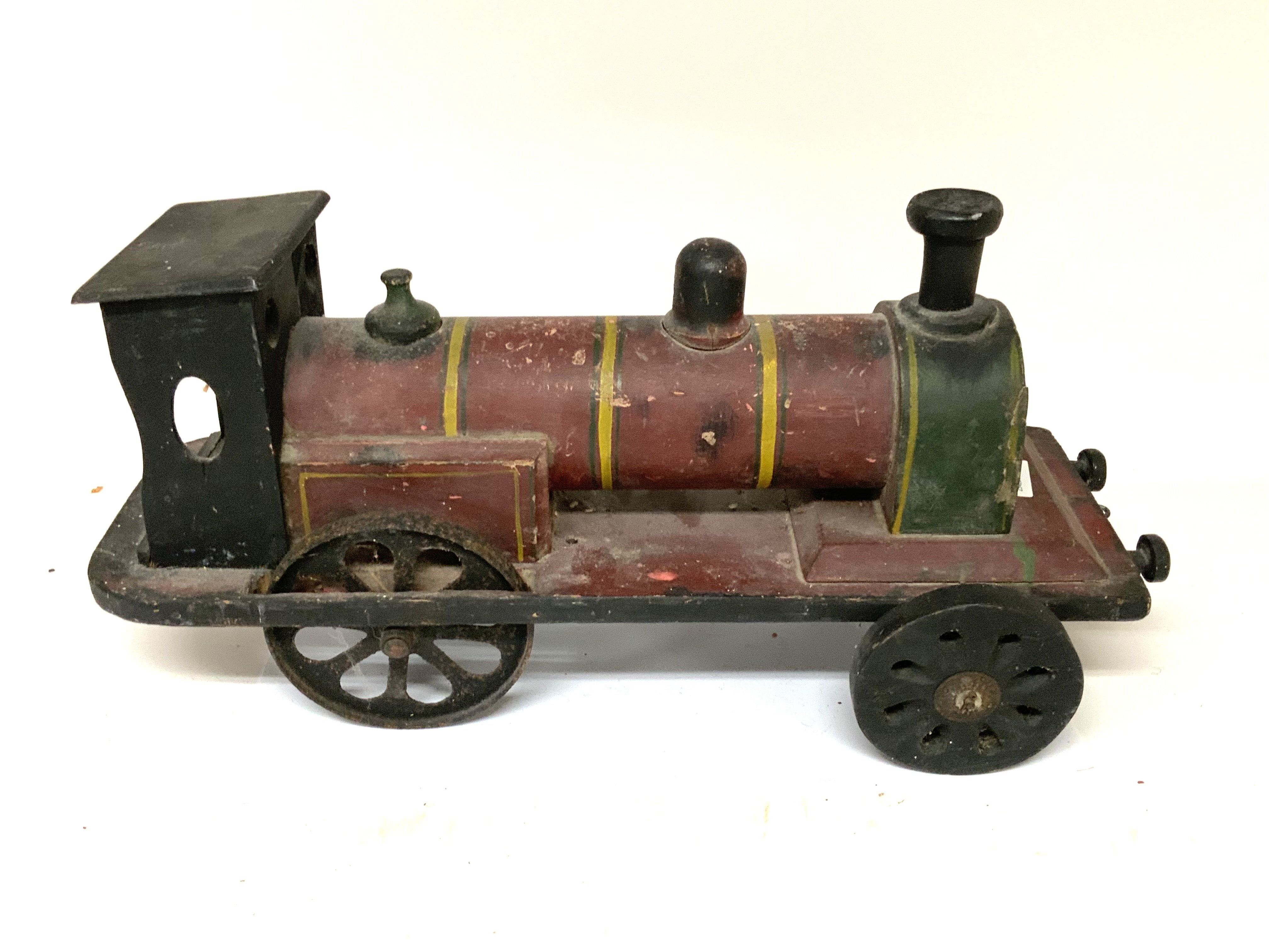 A Vintage Wooden model toy steam train. Pressed brass panel to front stamped JOYBOY, strength in the toy is Joy in the Toy. Overall length 53cm. Playworn condition. (C)