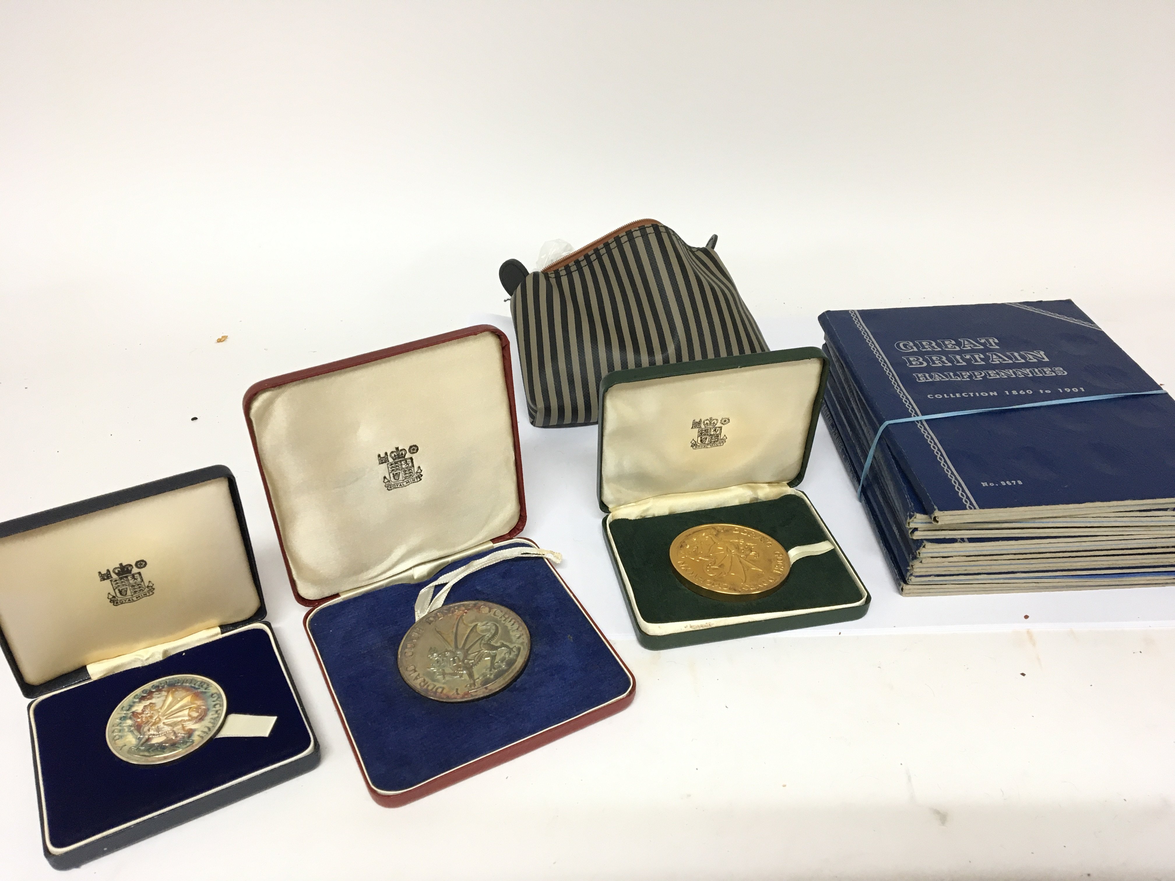Two silver and one gilded Royal Commemorative Royal Mint medallions Prince Charles investiture and a quantity of Great Britain blue penny and bronze coin collectors albums and a bag of loose used circulated coinage.