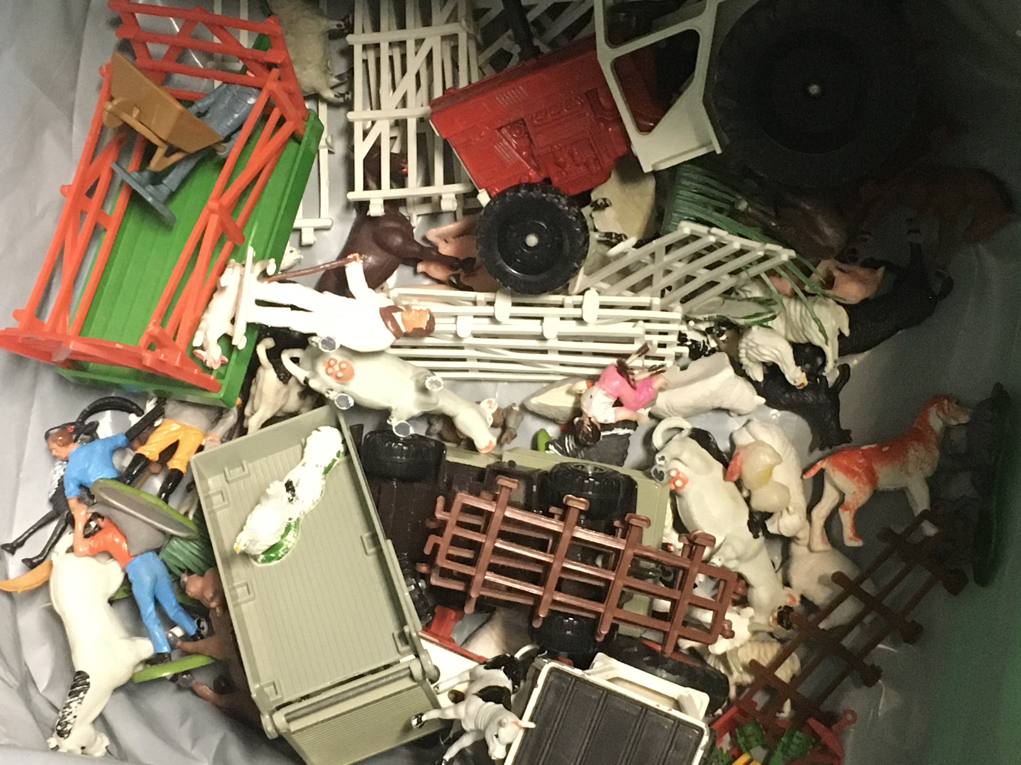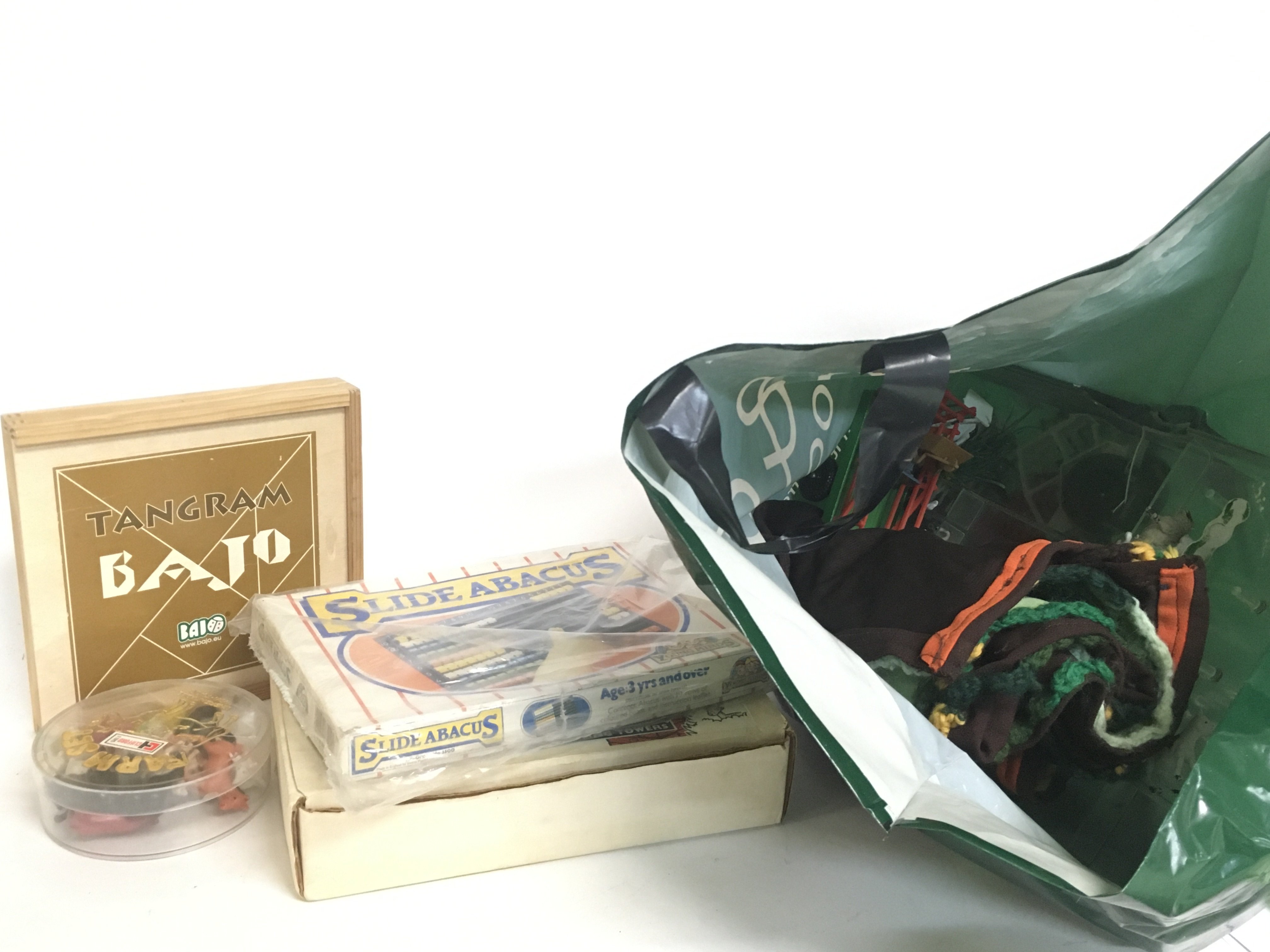 A collection of vintage boxed games including Slide Abacus, Timba, Tangram Bajo, Playworn farm animals and tractors. Postage category C