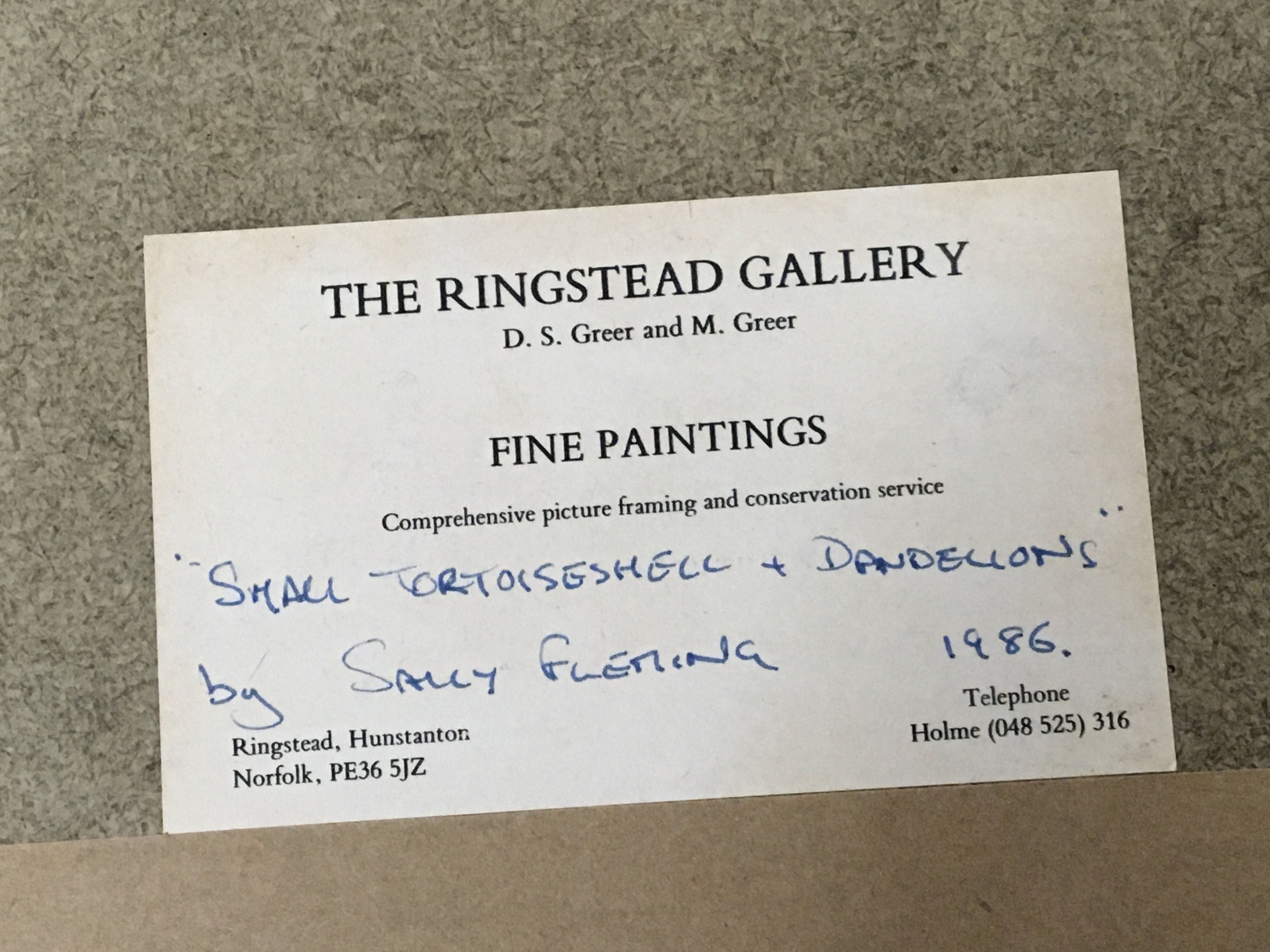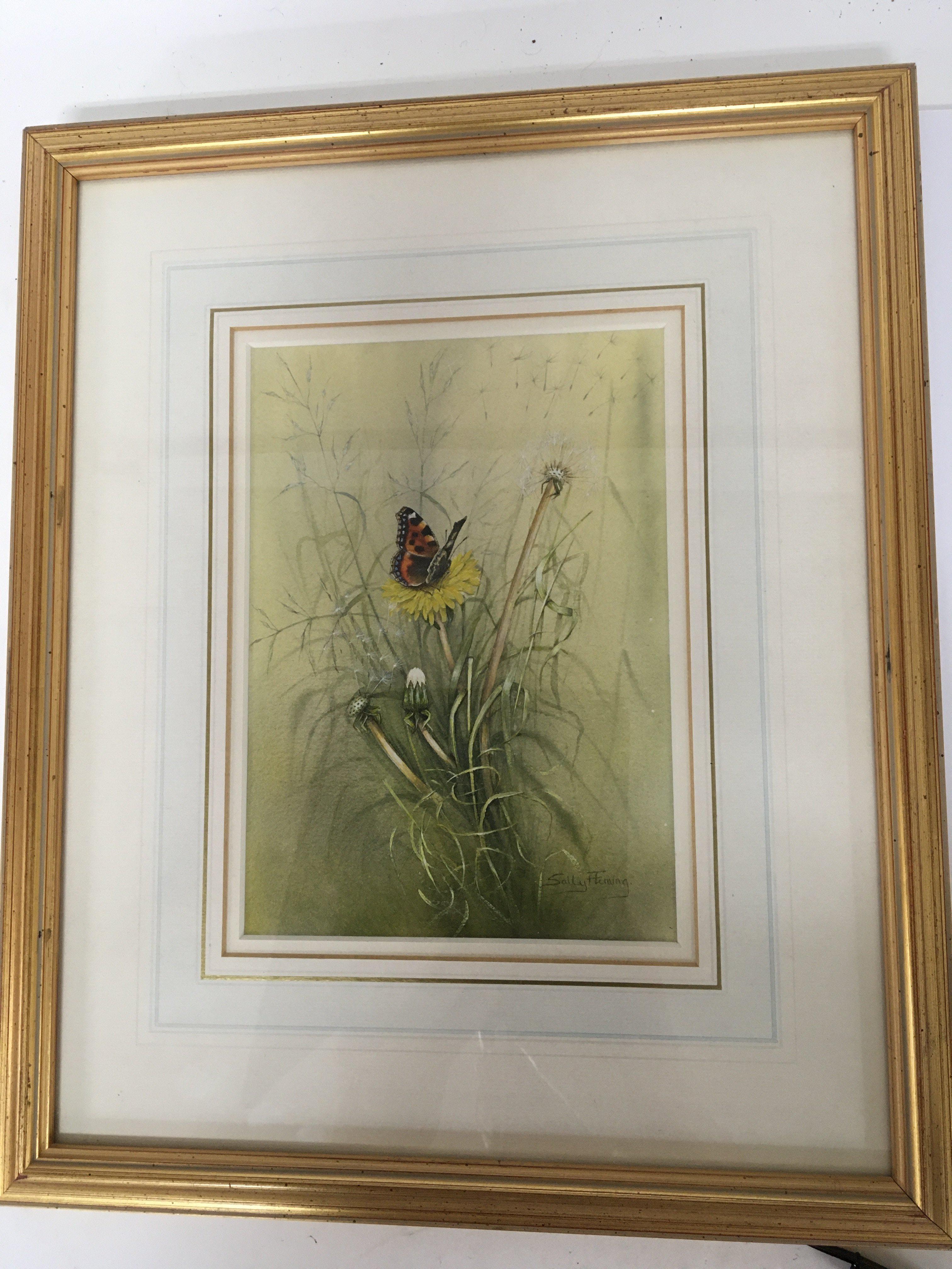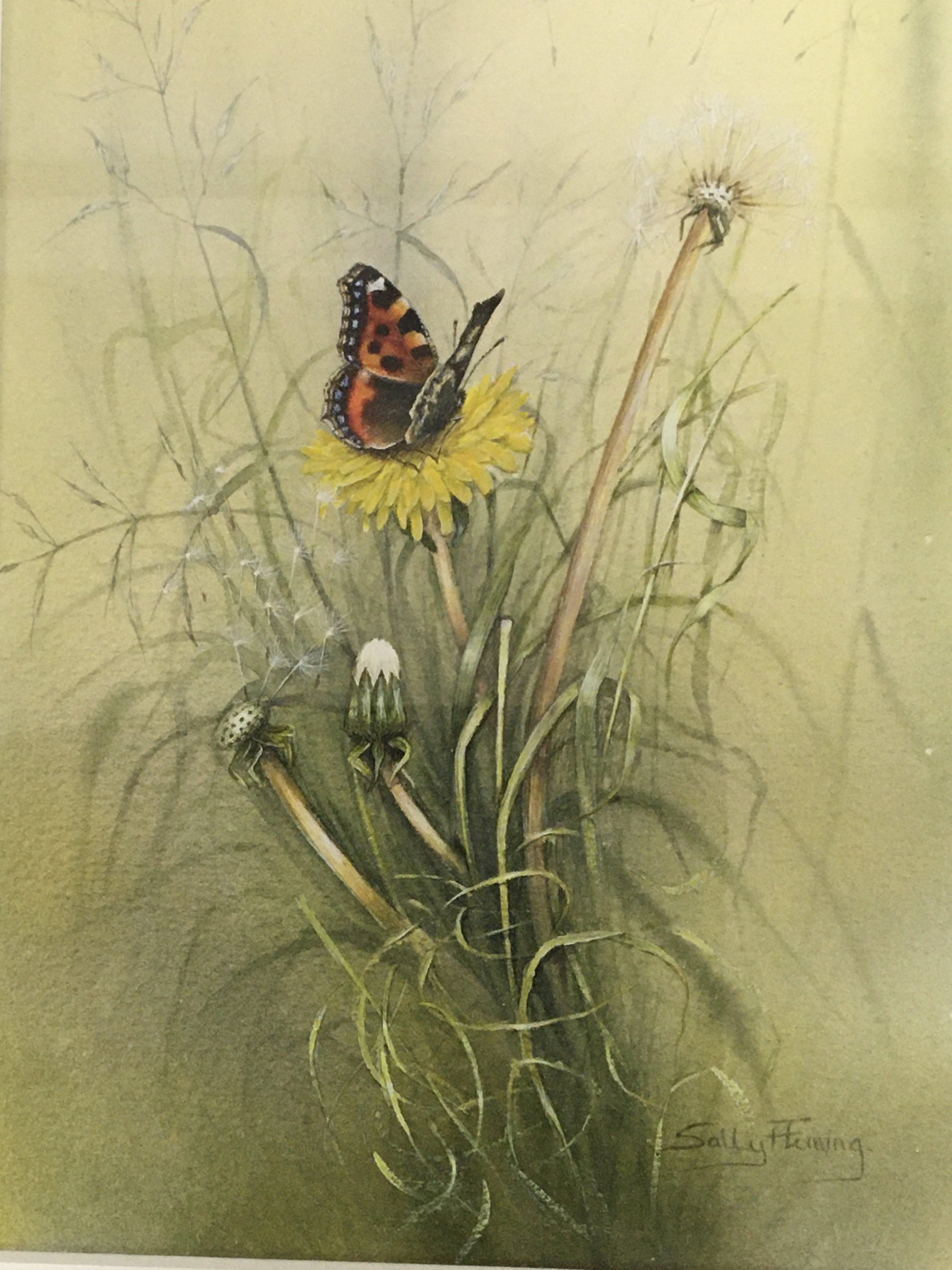 A Quality framed watercolour study of a butterfly by Sally Fleming the watercolour entitled Small Tortoiseshell and Dandelion. 1986. The reverse with Gallery label very good condition. 35x42cm