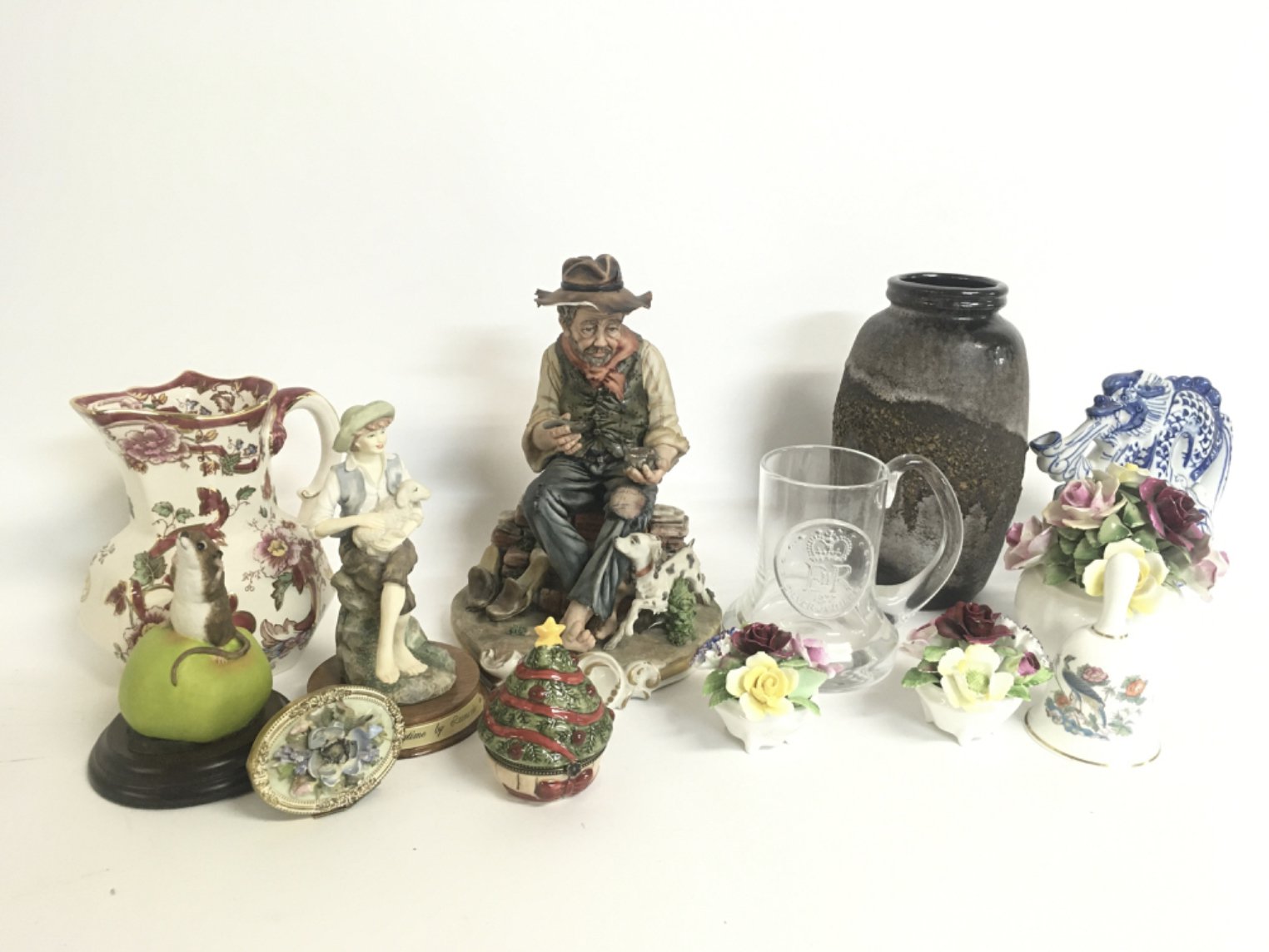 A collection of assorted ceramics including a Wedgwood bell, Royal Doulton posy vases, German art vase etc