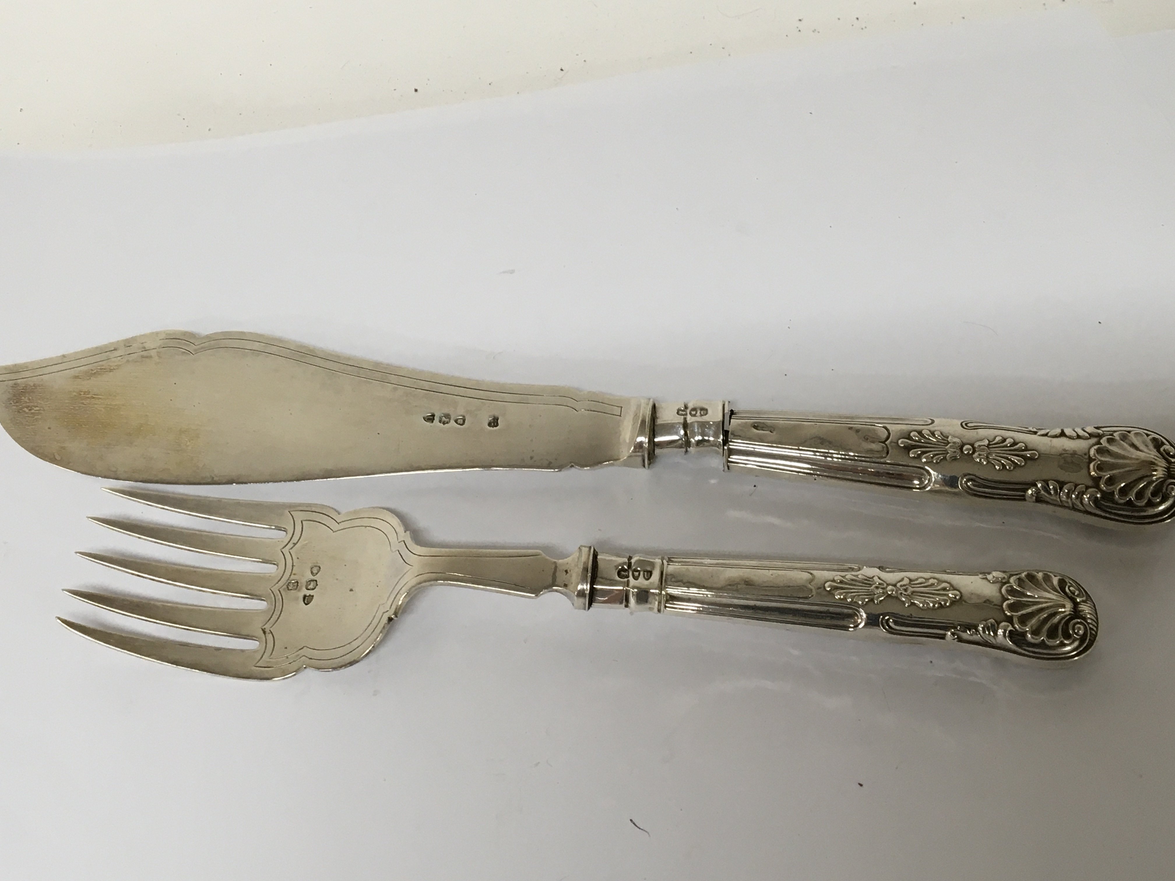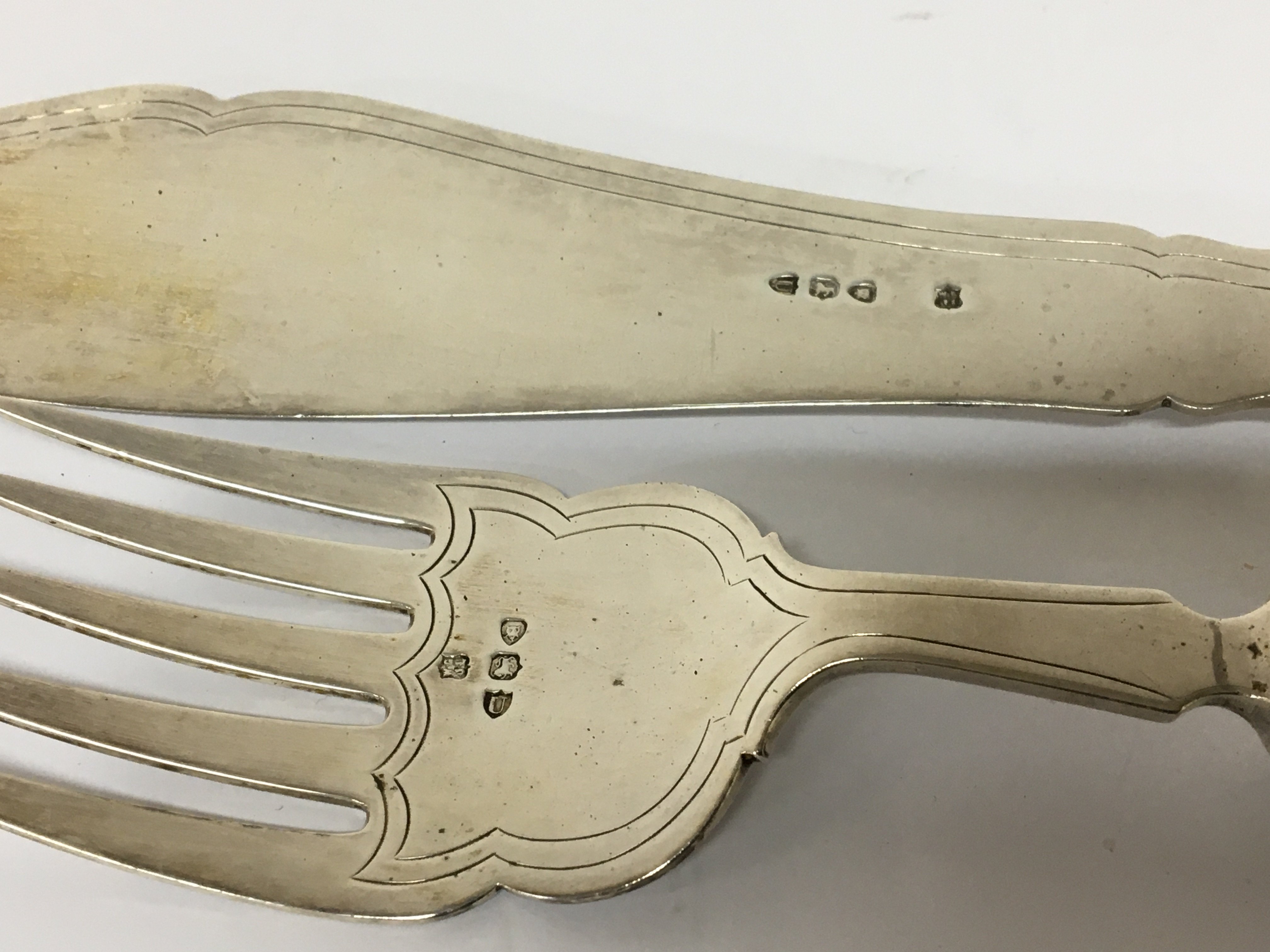 A silver fish slice a d folk with silver blade a d loaded silver handles.London hallmarks weight 300g all in.