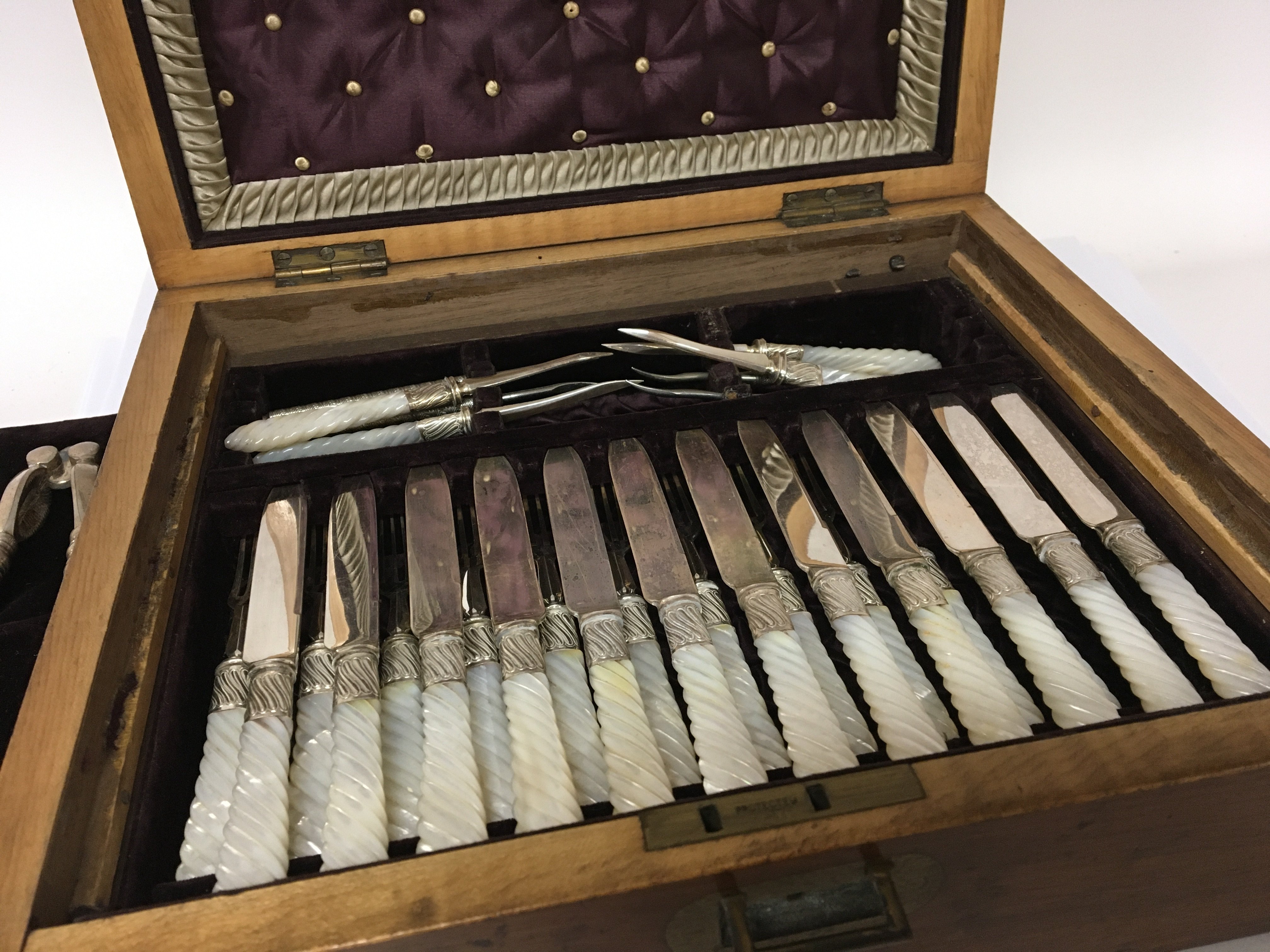 A Quality cased Edwardian silver plated and mother of pearl handled nut and fruit set twelve knifes and folks serving implements in a well fitted interior.