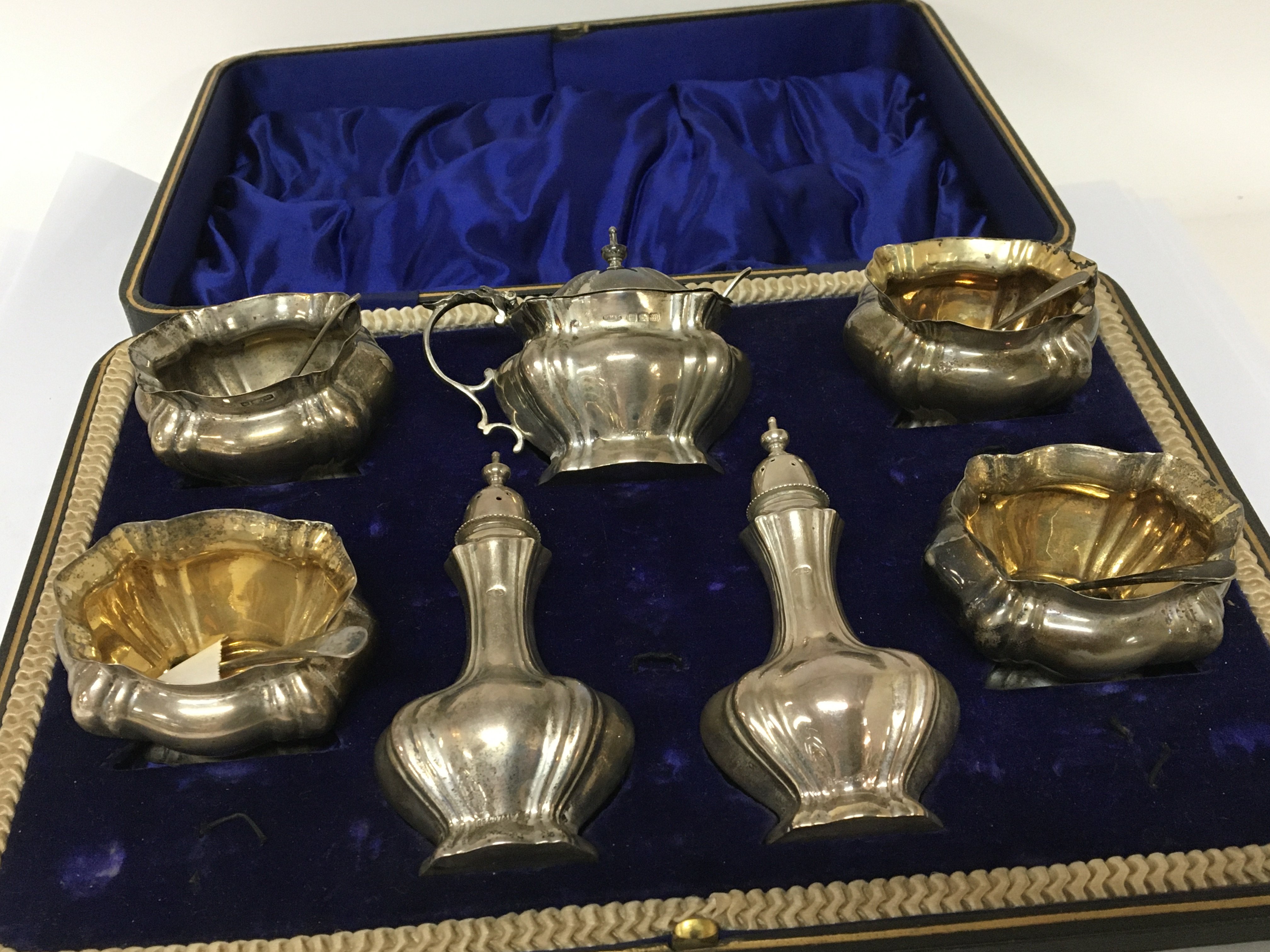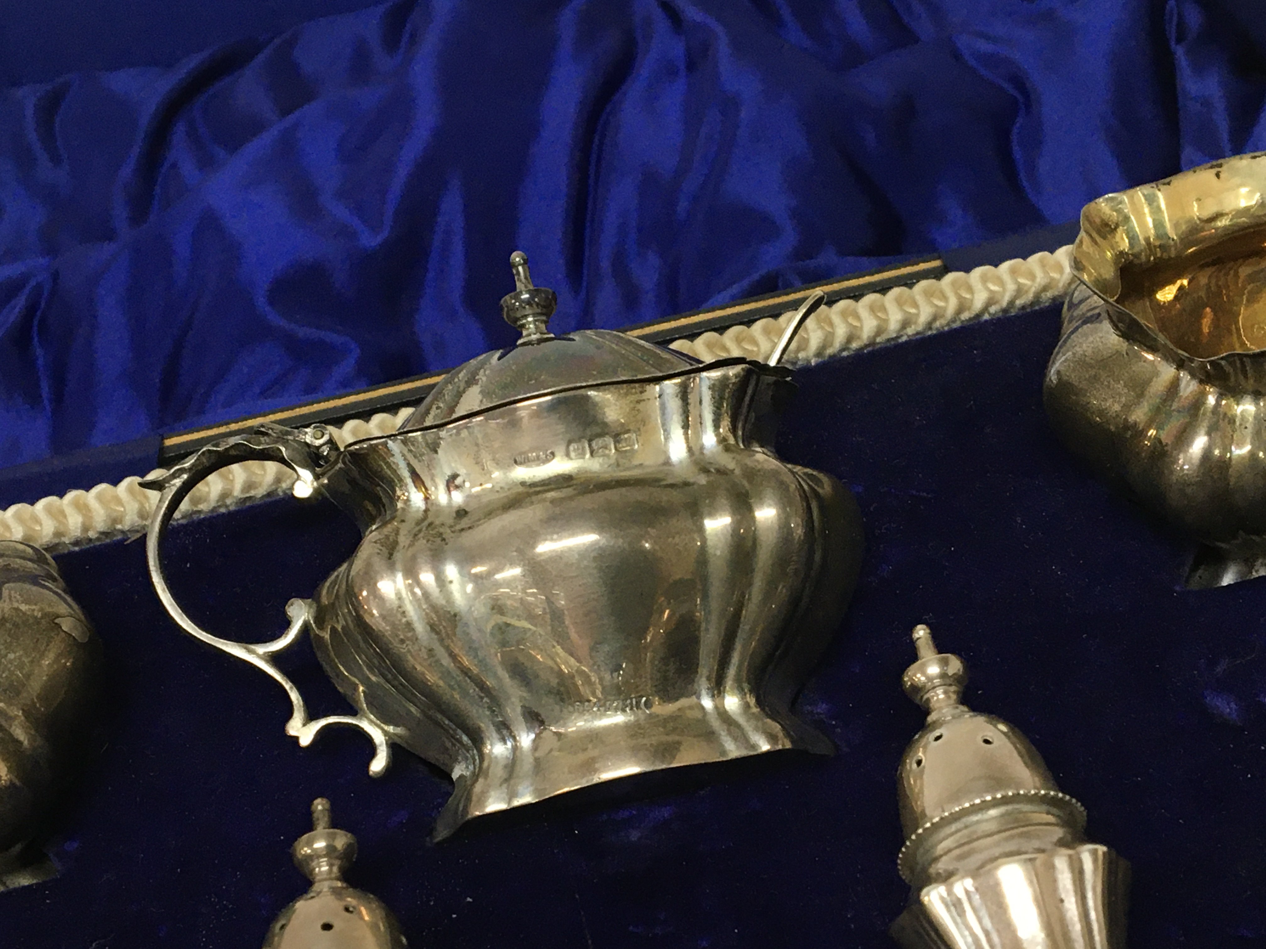 A case containing a silver condiment set a set of four salt cellars mustard pot and pepper pots Sheffield 1904 hallmarks.