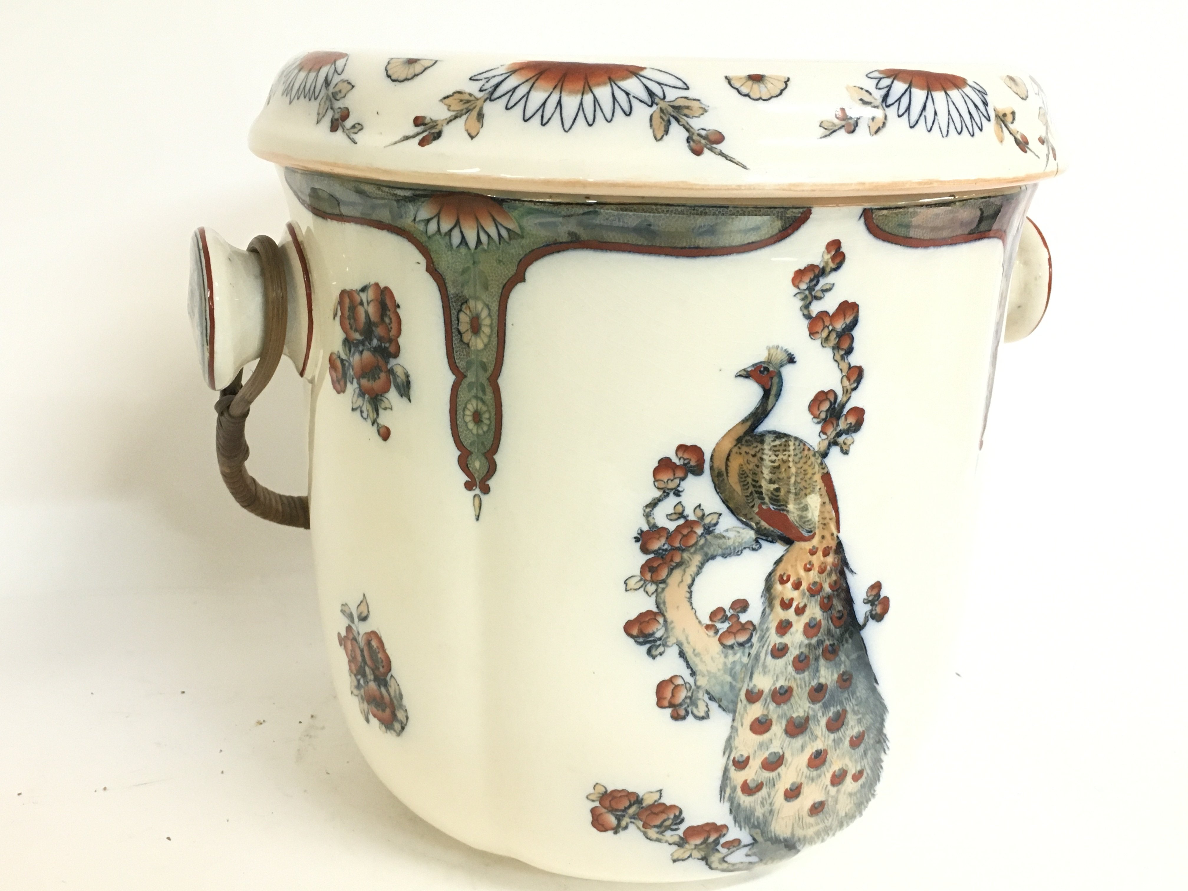 A large Victorian ceramic pail decorated with peacocks 18.5 tall 33cm wide. This lot cannot be posted