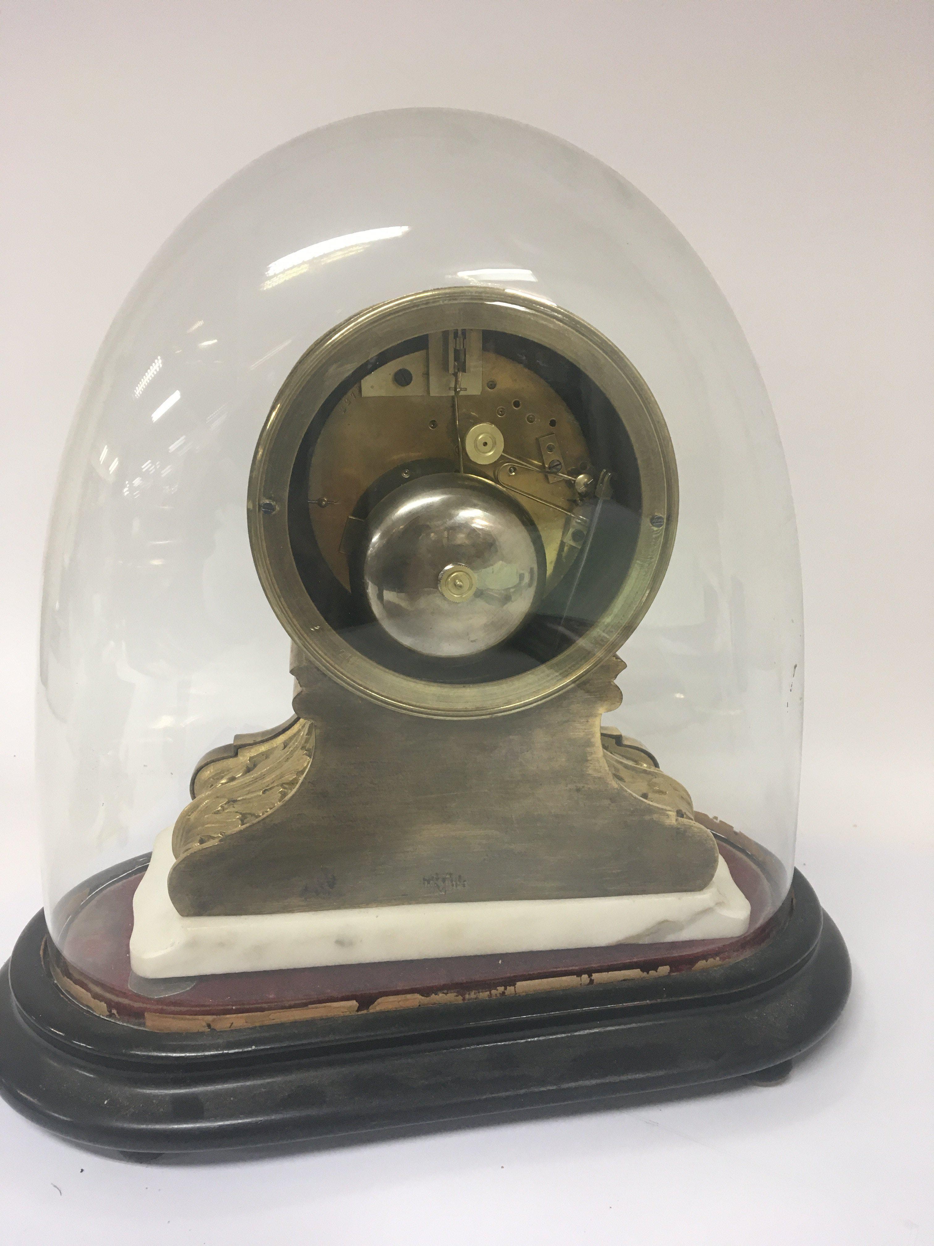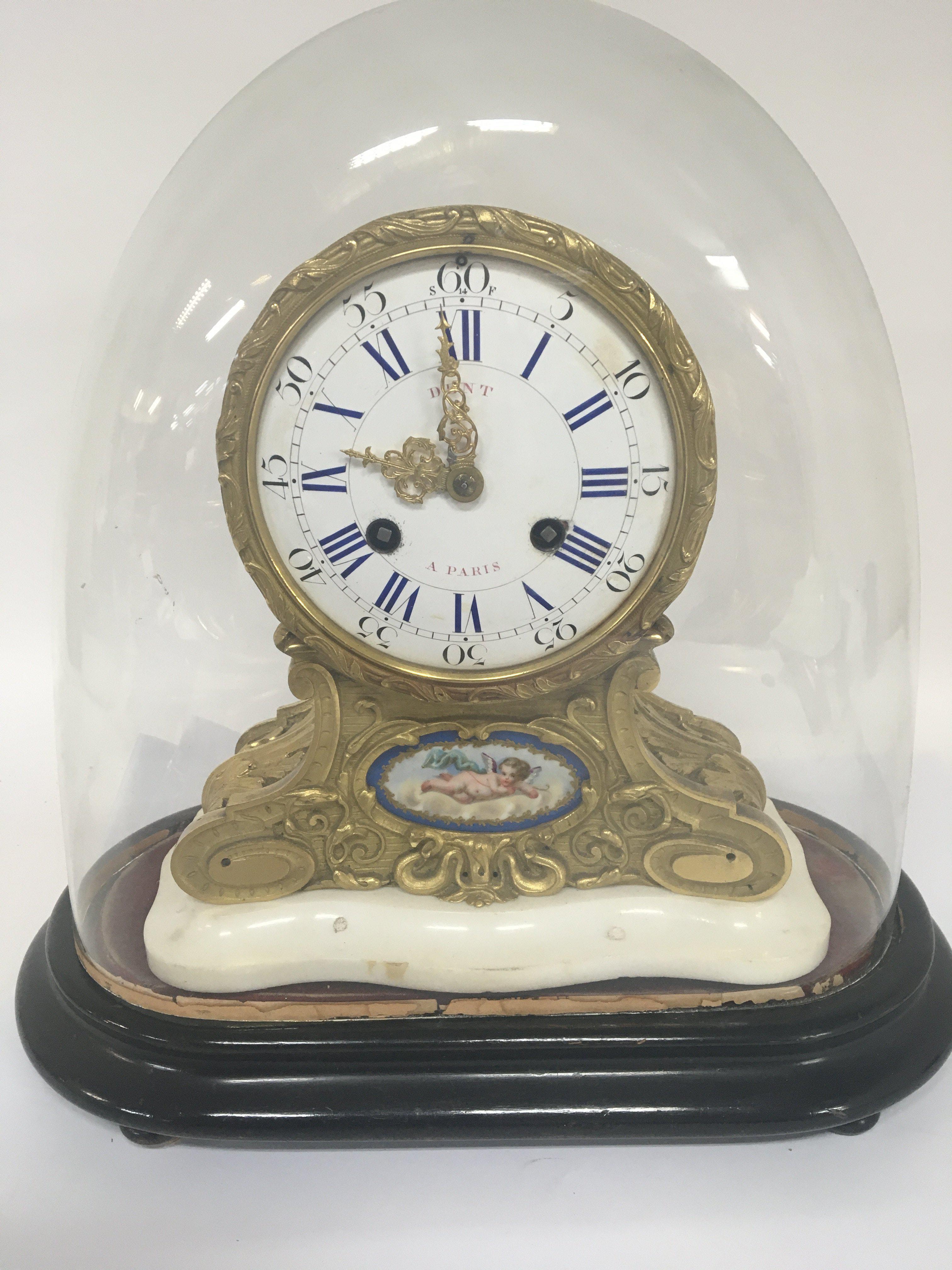A French late 19th Century clock under a glass dome with an enamel dial with inscription Dent A Paris. With Sevres style hand painted plaque. With pendulum ans striking on a bell Height including dome 37cm.