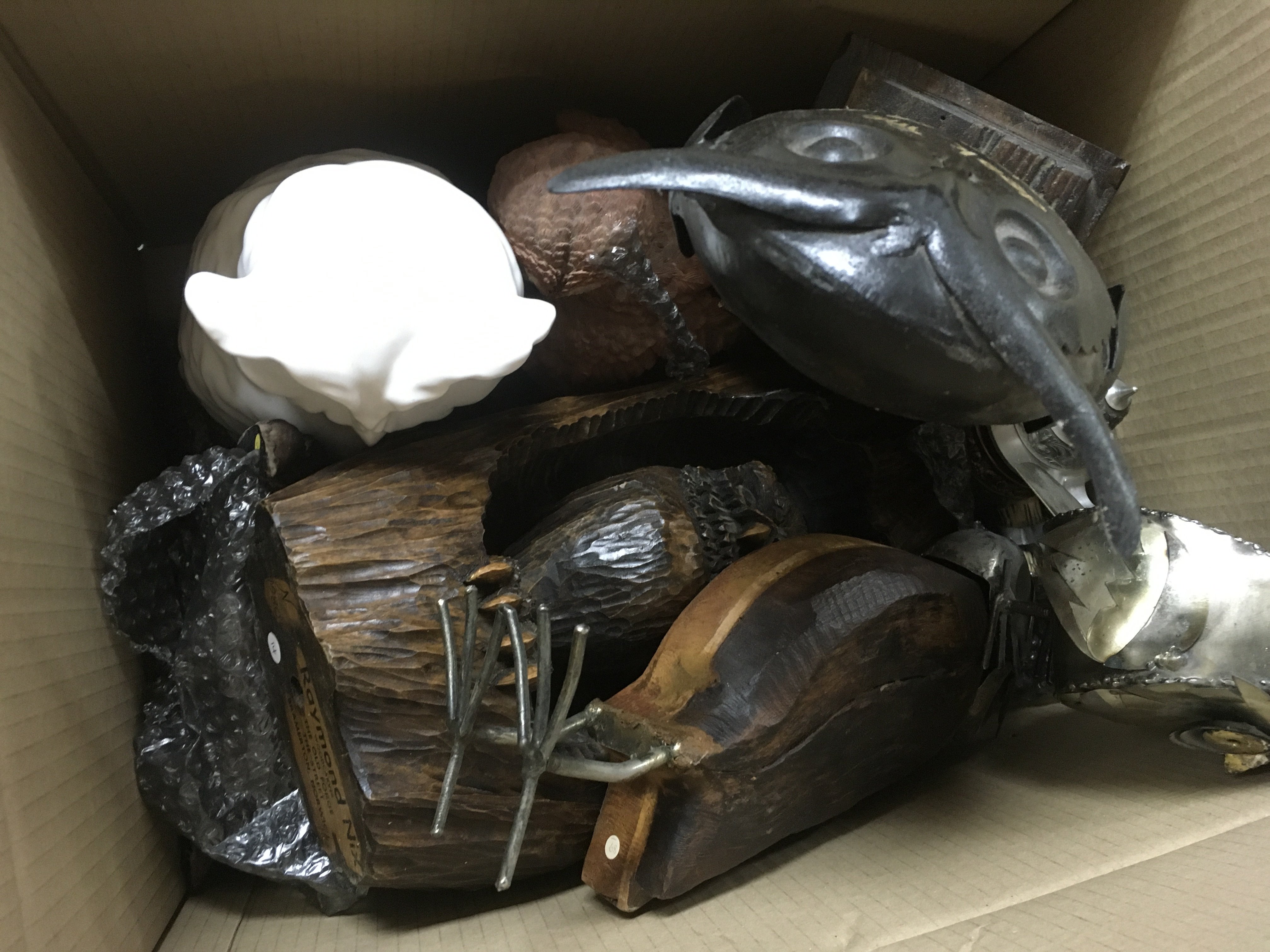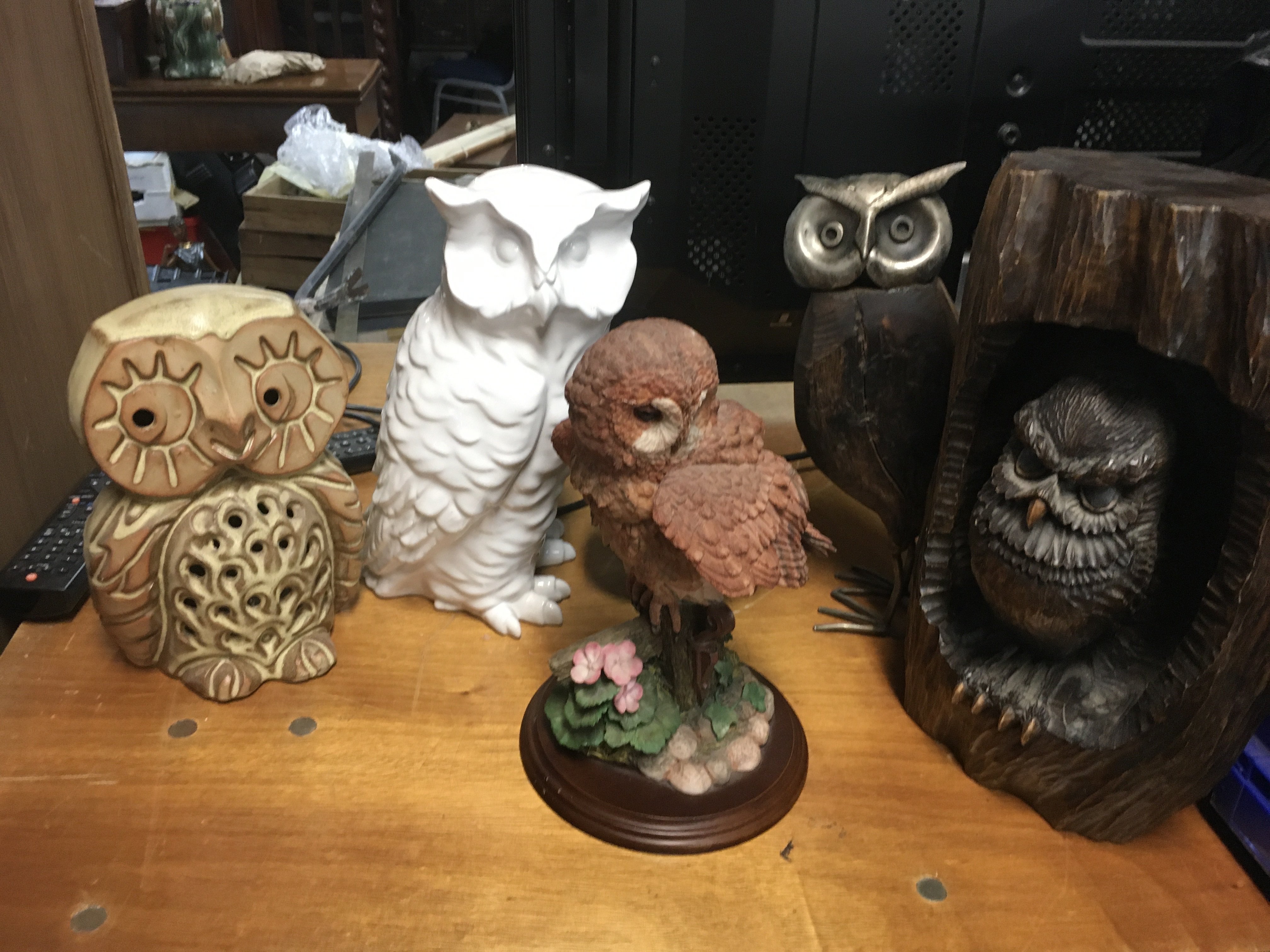 A collection of large owl figures including ceramic, wooden and other examples. This lot cannot be posted