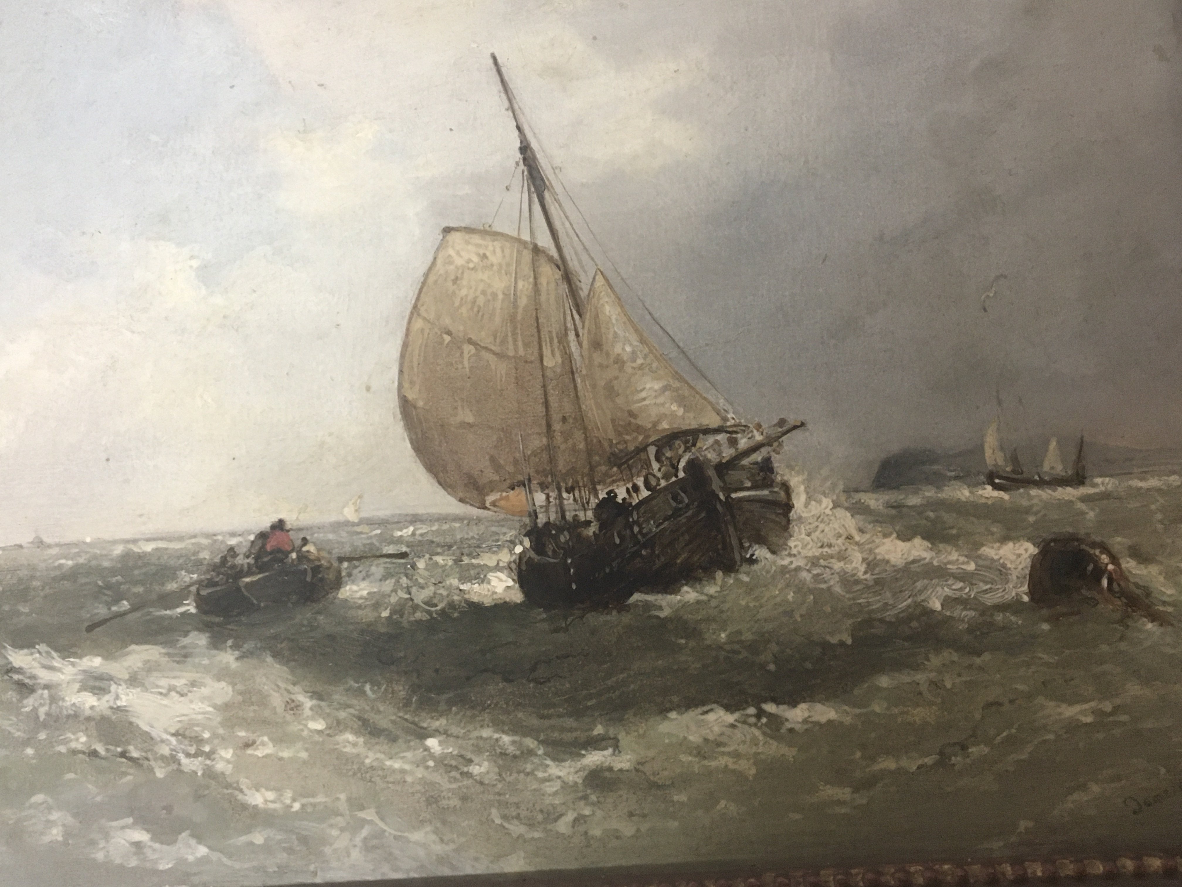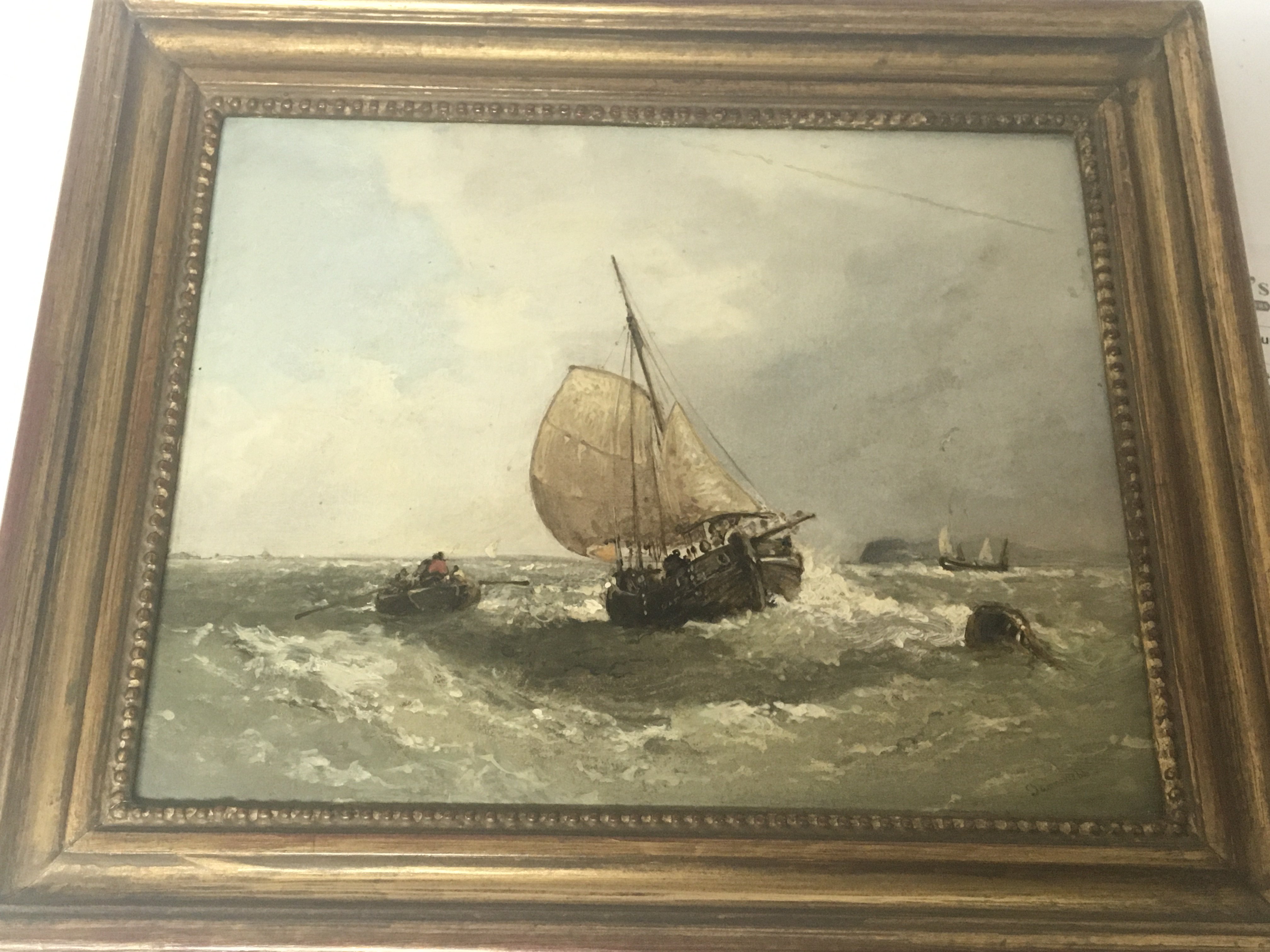 A framed 19th century oil painting on canvas study of fishing boats. Signed James Webb attributed the reverse with P Polak gallery label. 36cm x30cm