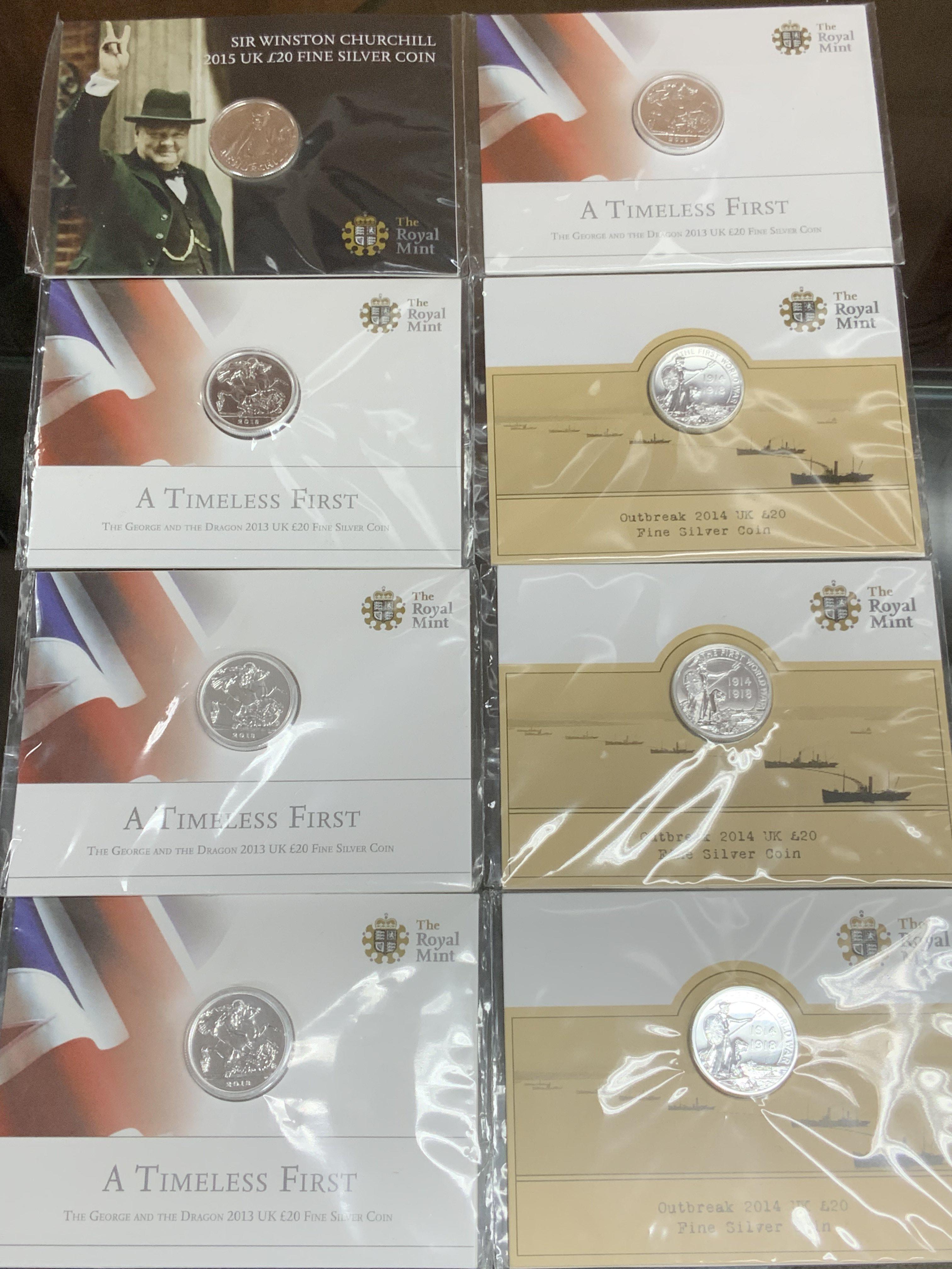 3 Royal Mint 2014 £20 fine silver coins, 4 Royal Mint Timeless First 2013 George and the dragon fine silver £20 coins, Royal Mint Sir Winston Churchill 2015 £20 fine silver coin.
