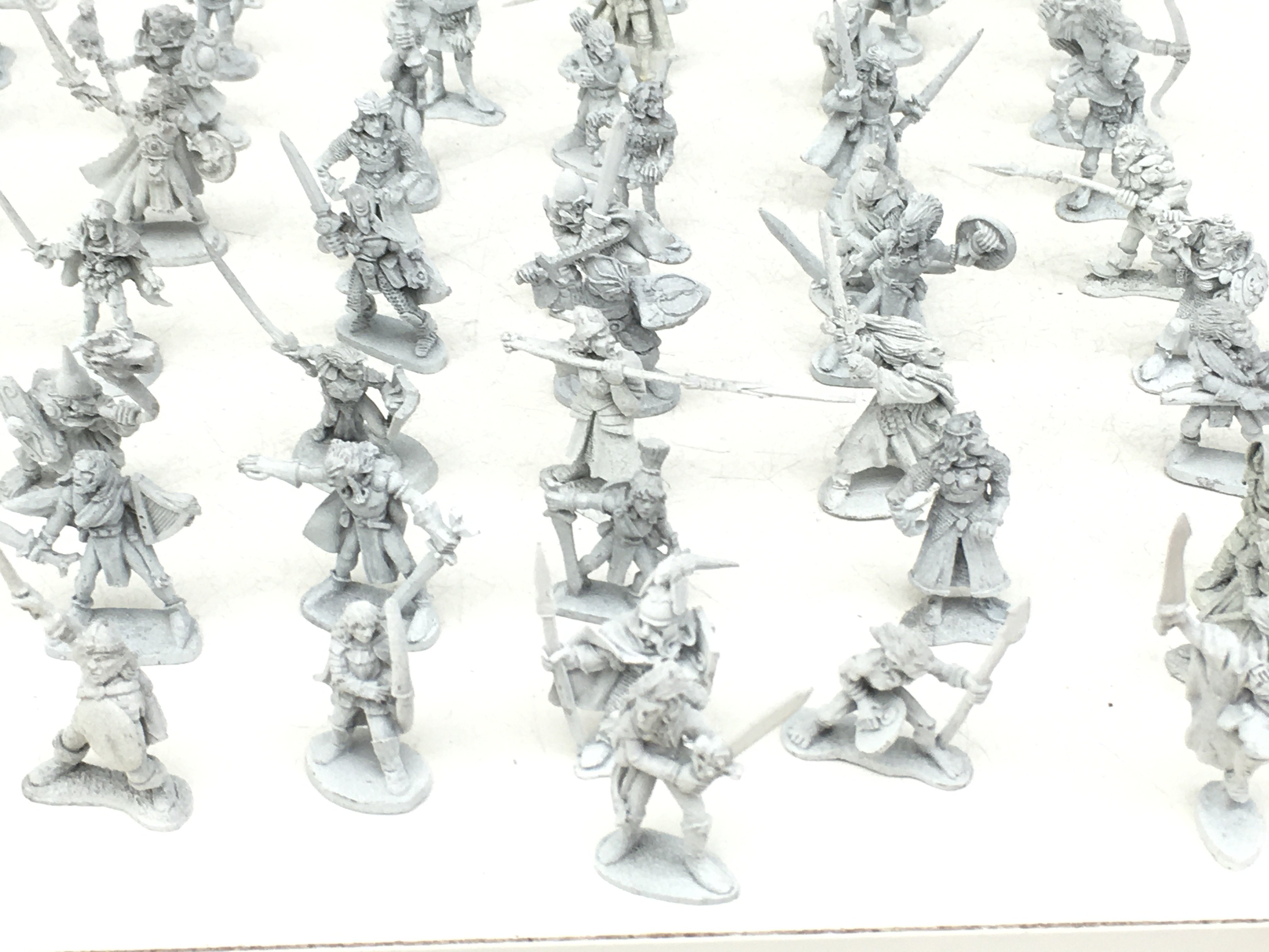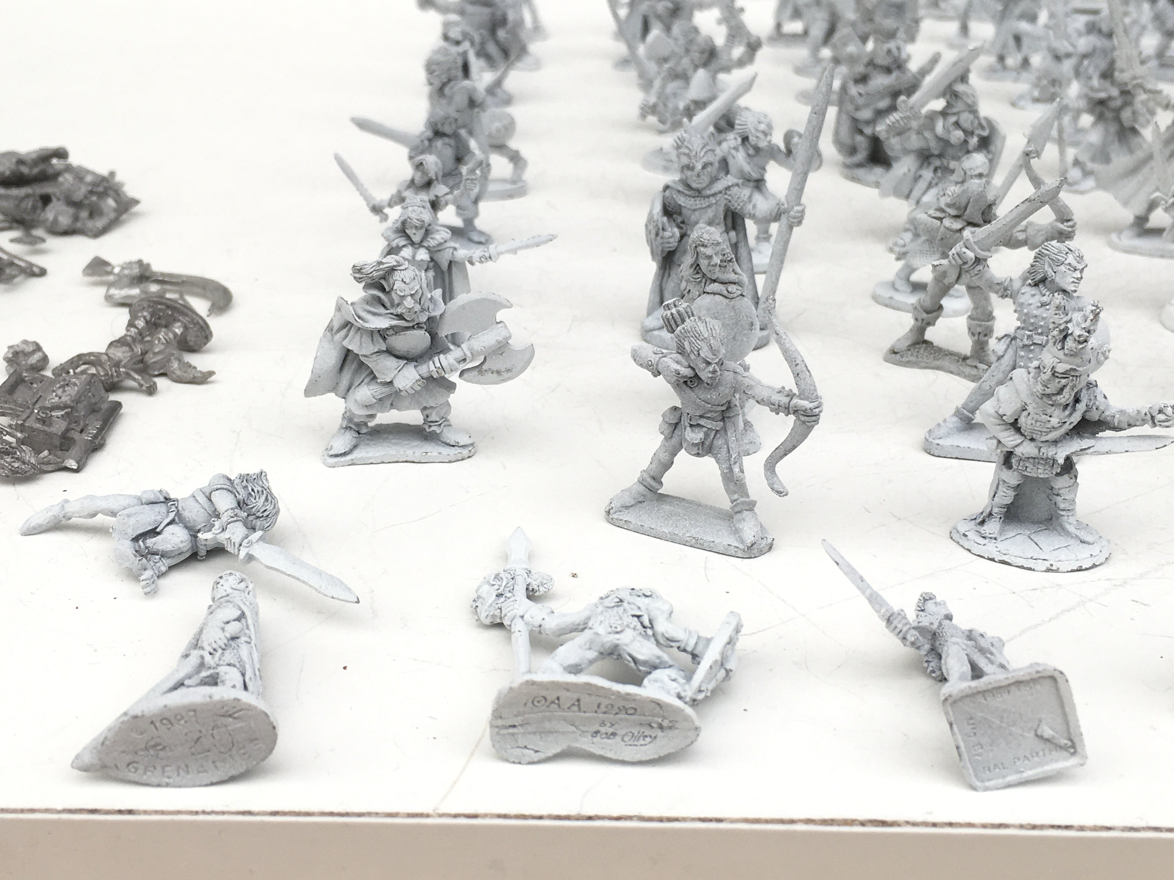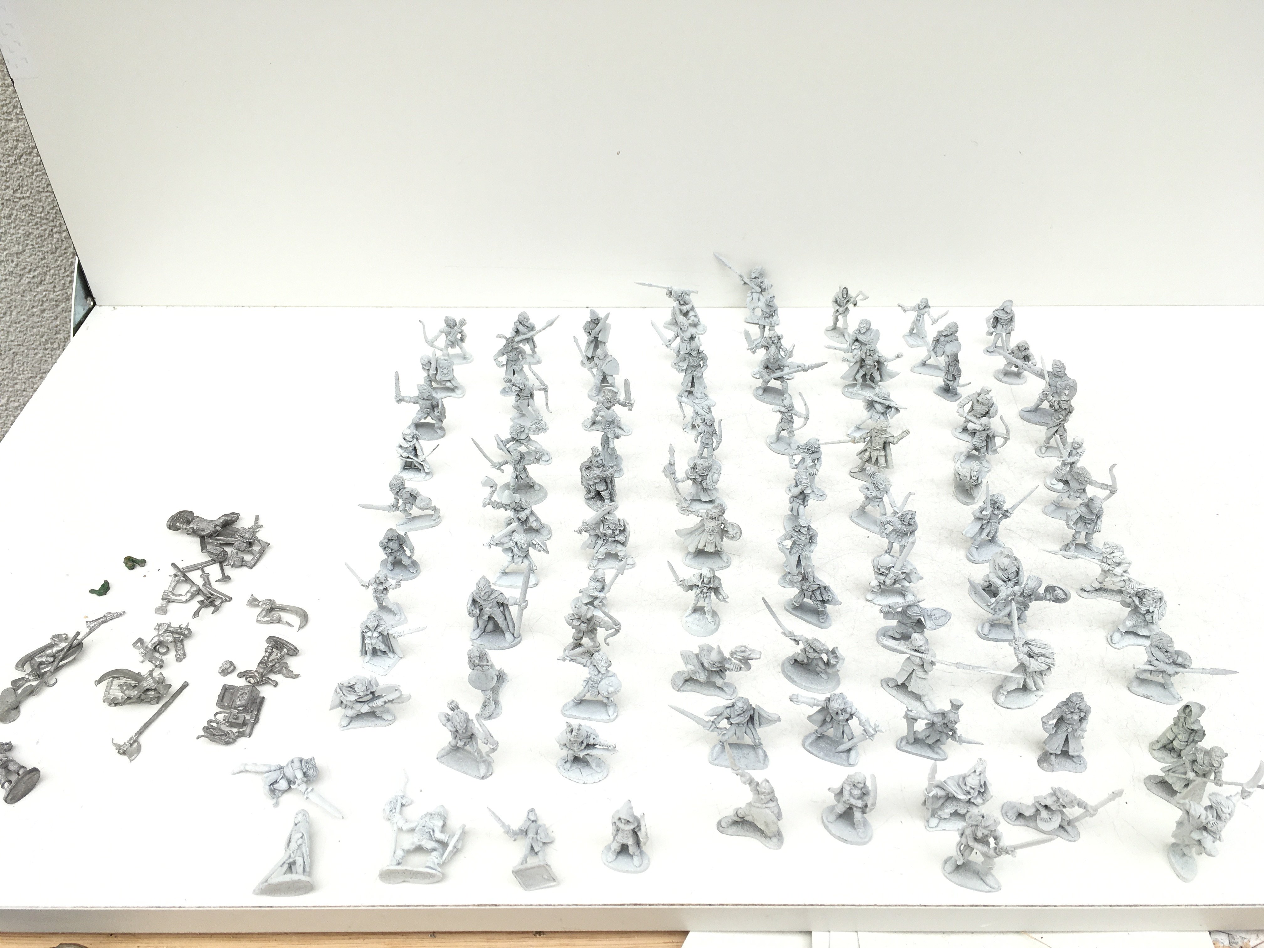 A box containing in excess of 100 metal figures and accessories from a Warhammer collection all are unpainted.