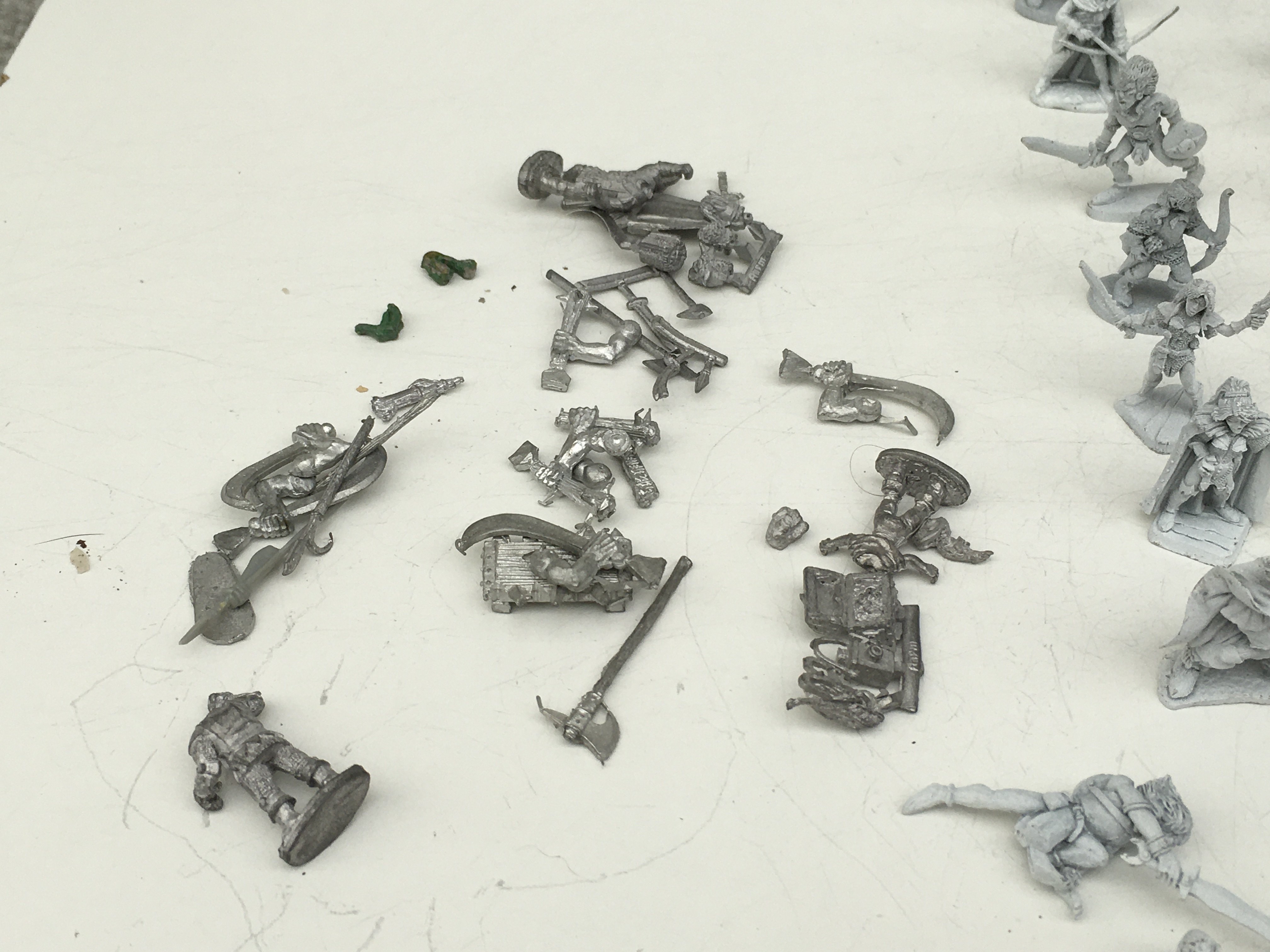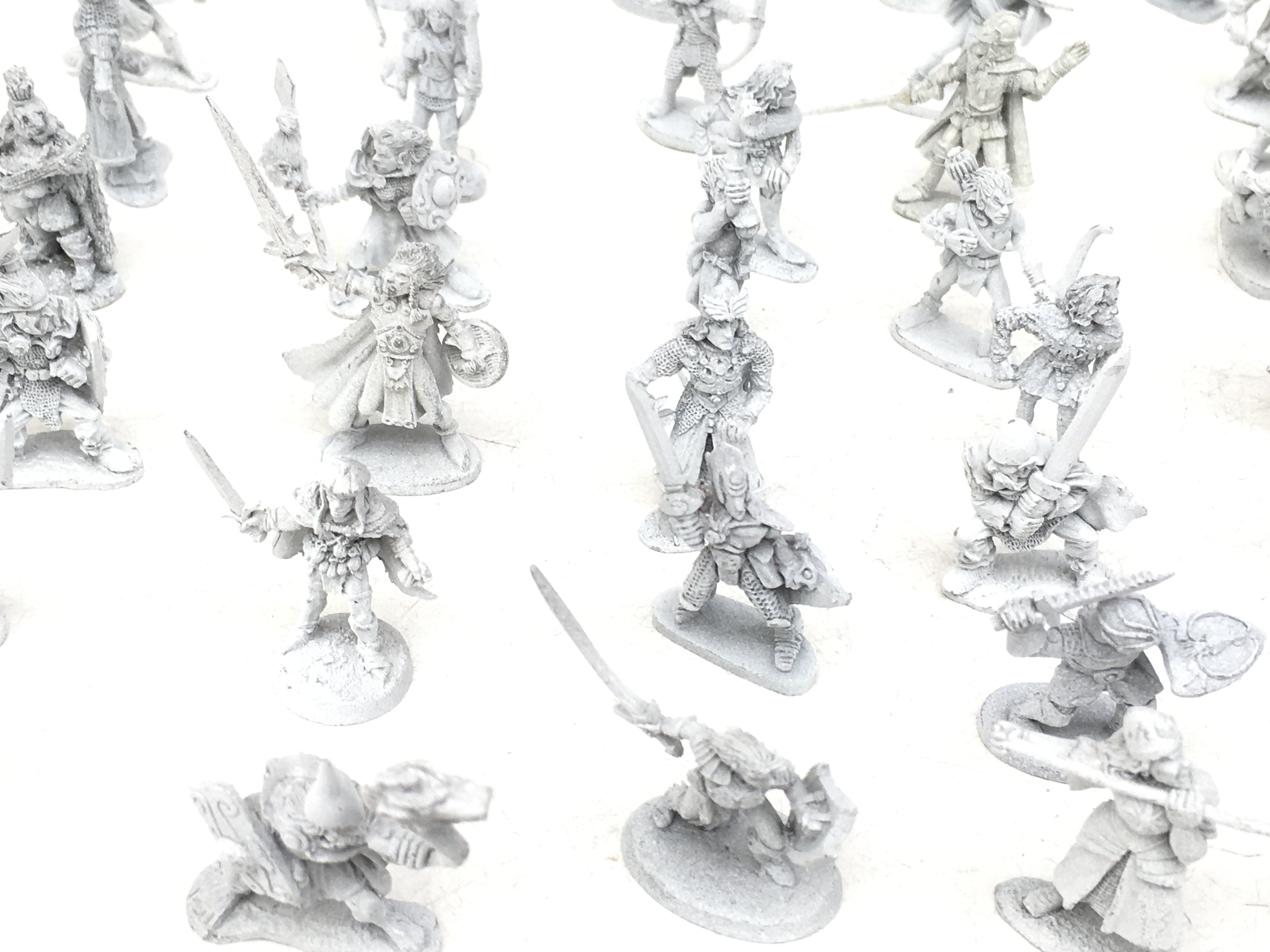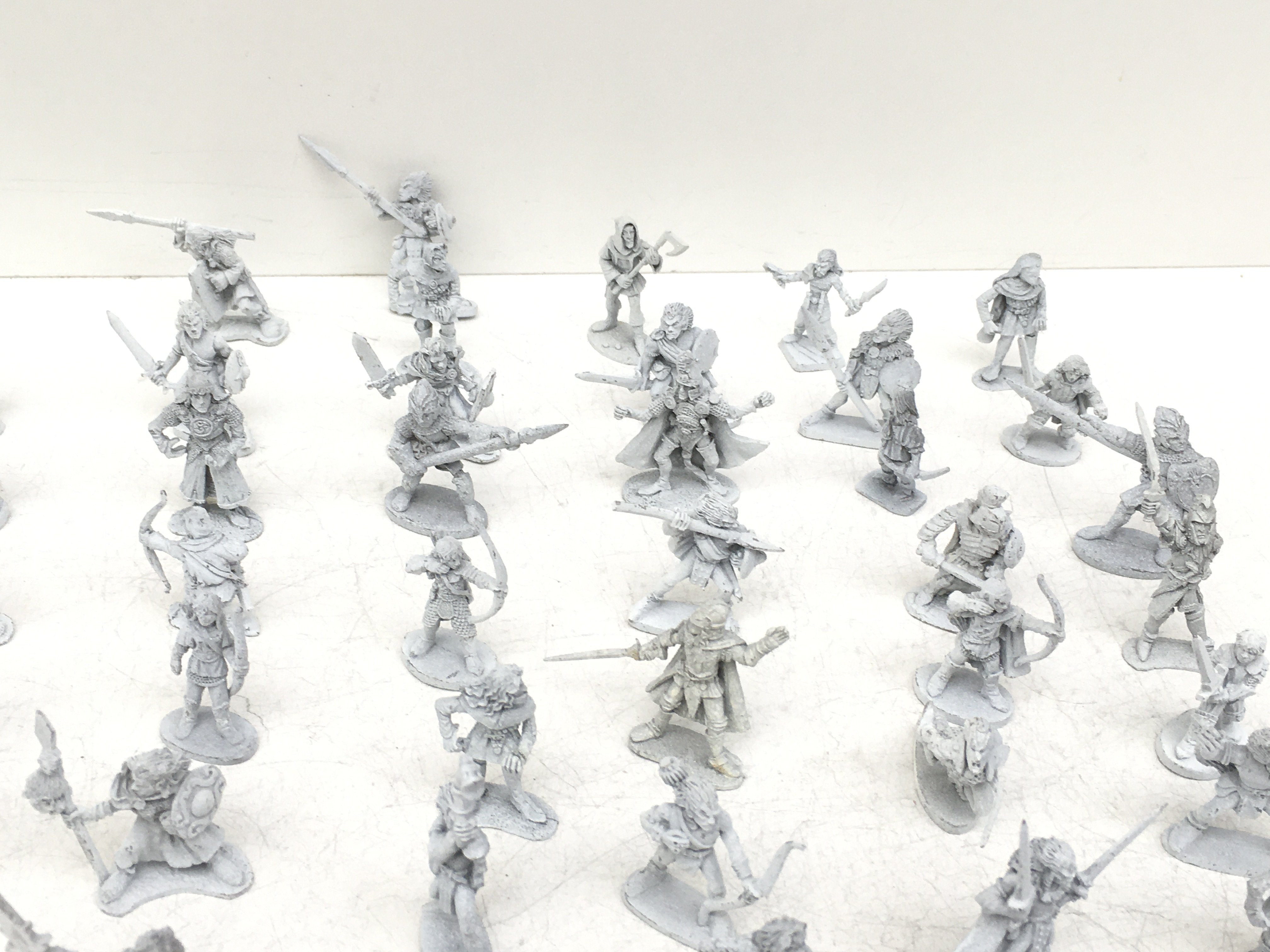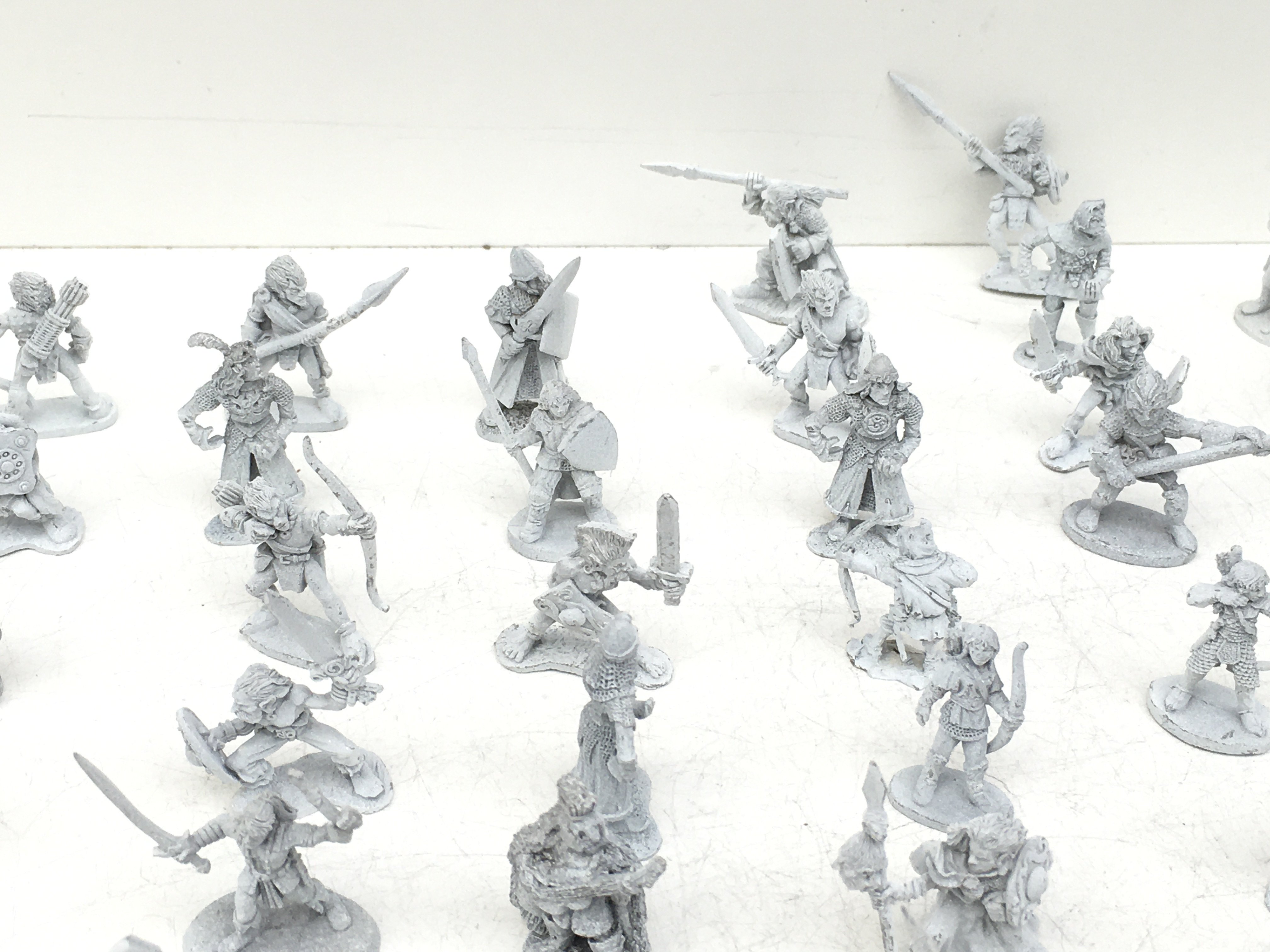 A box containing in excess of 100 metal figures and accessories from a Warhammer collection all are unpainted.