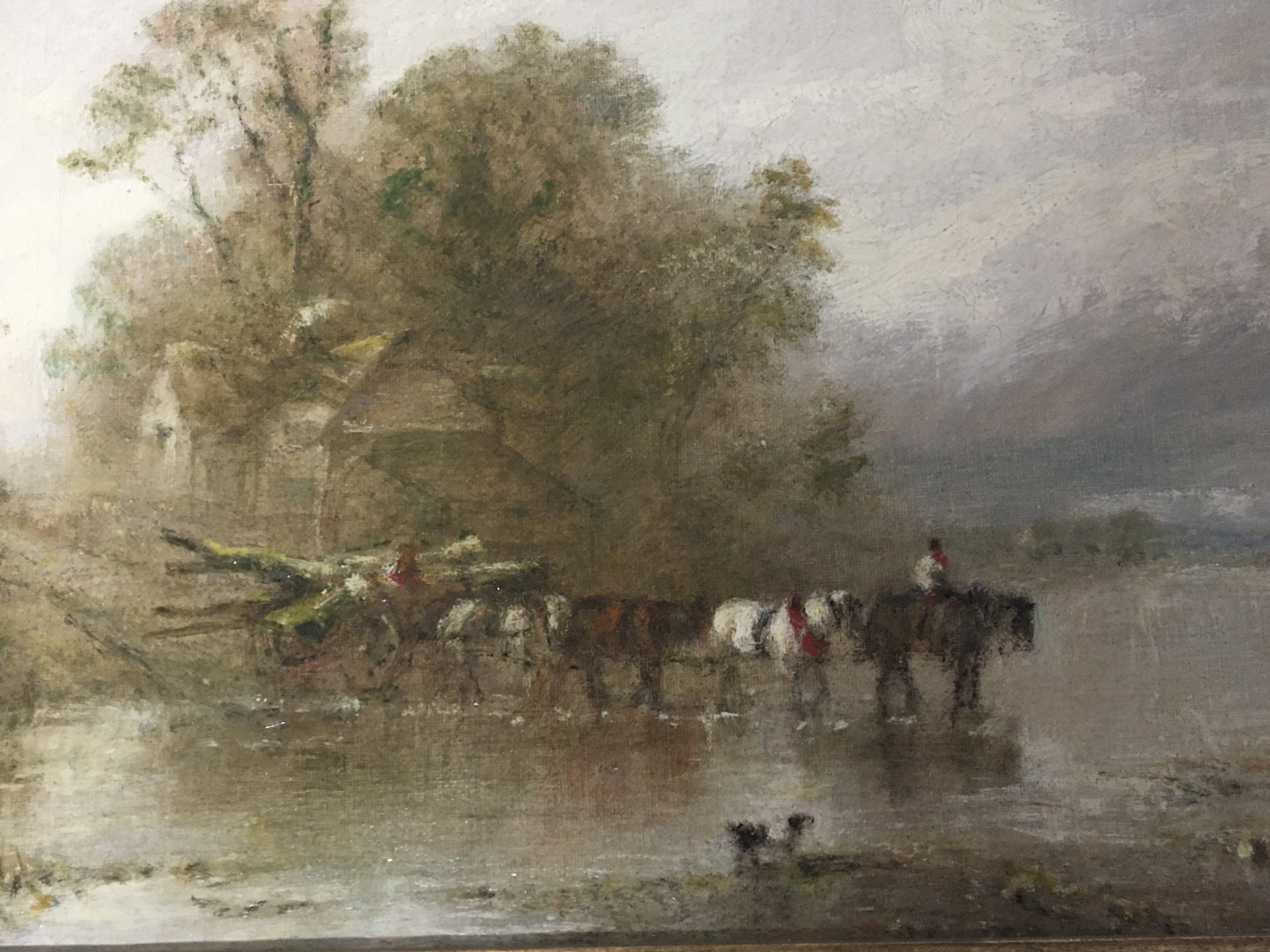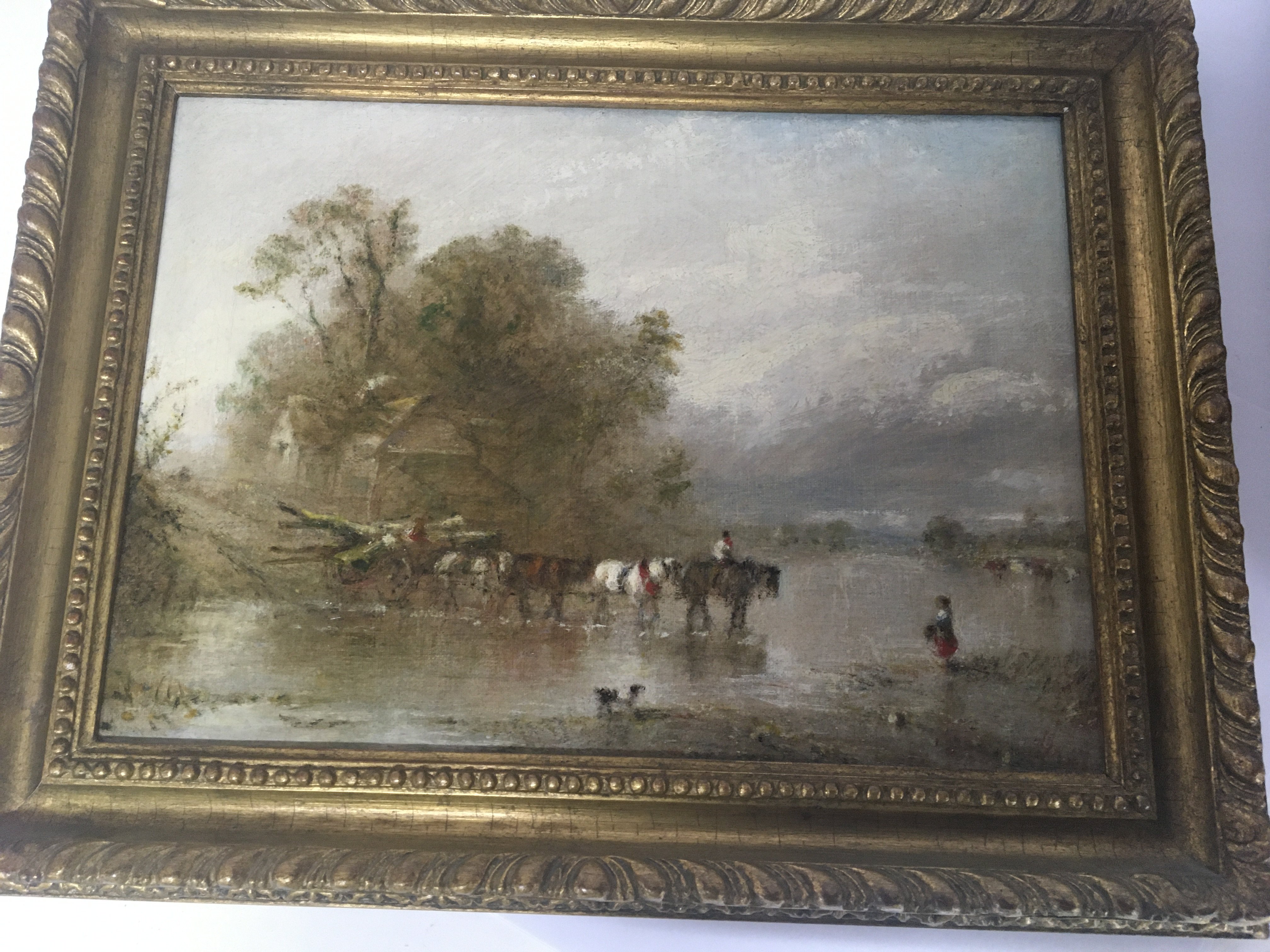 A 19th Century oil painting study of a horse drawn cart crossing a river. Unattributed. 35x44cm