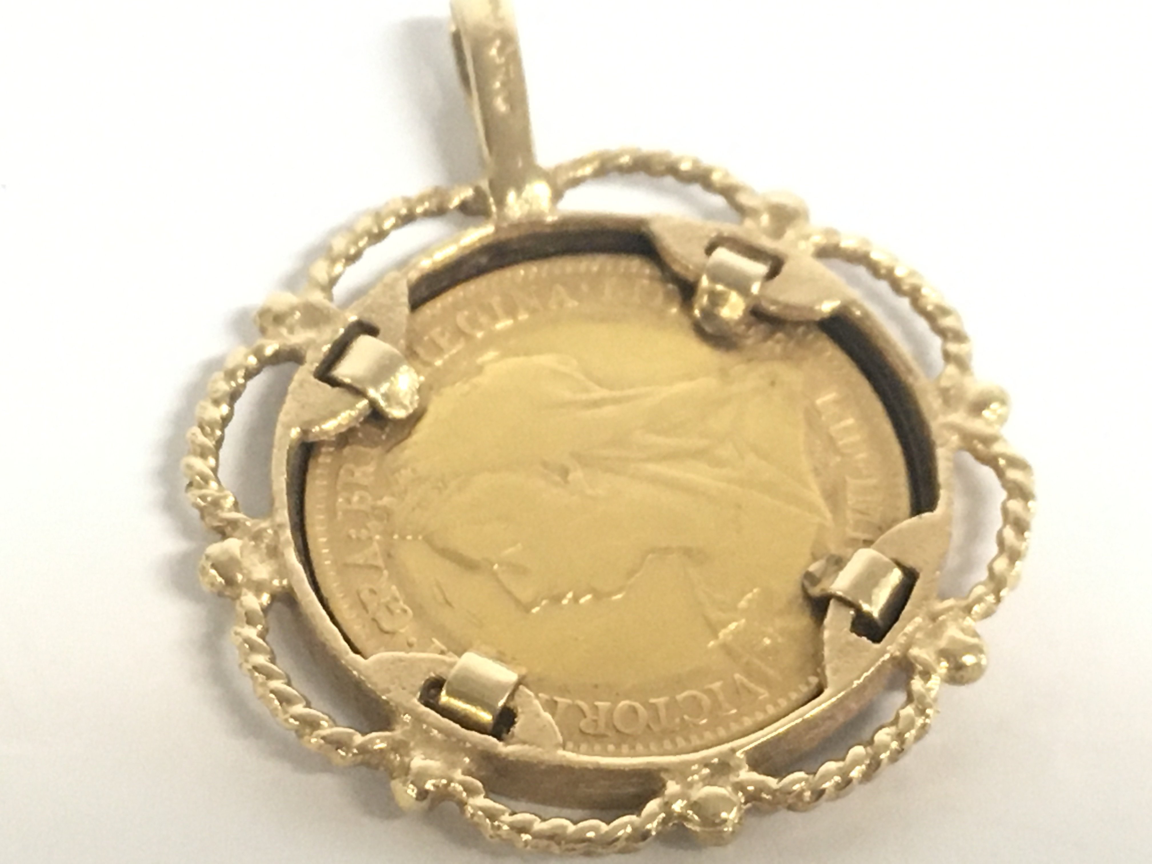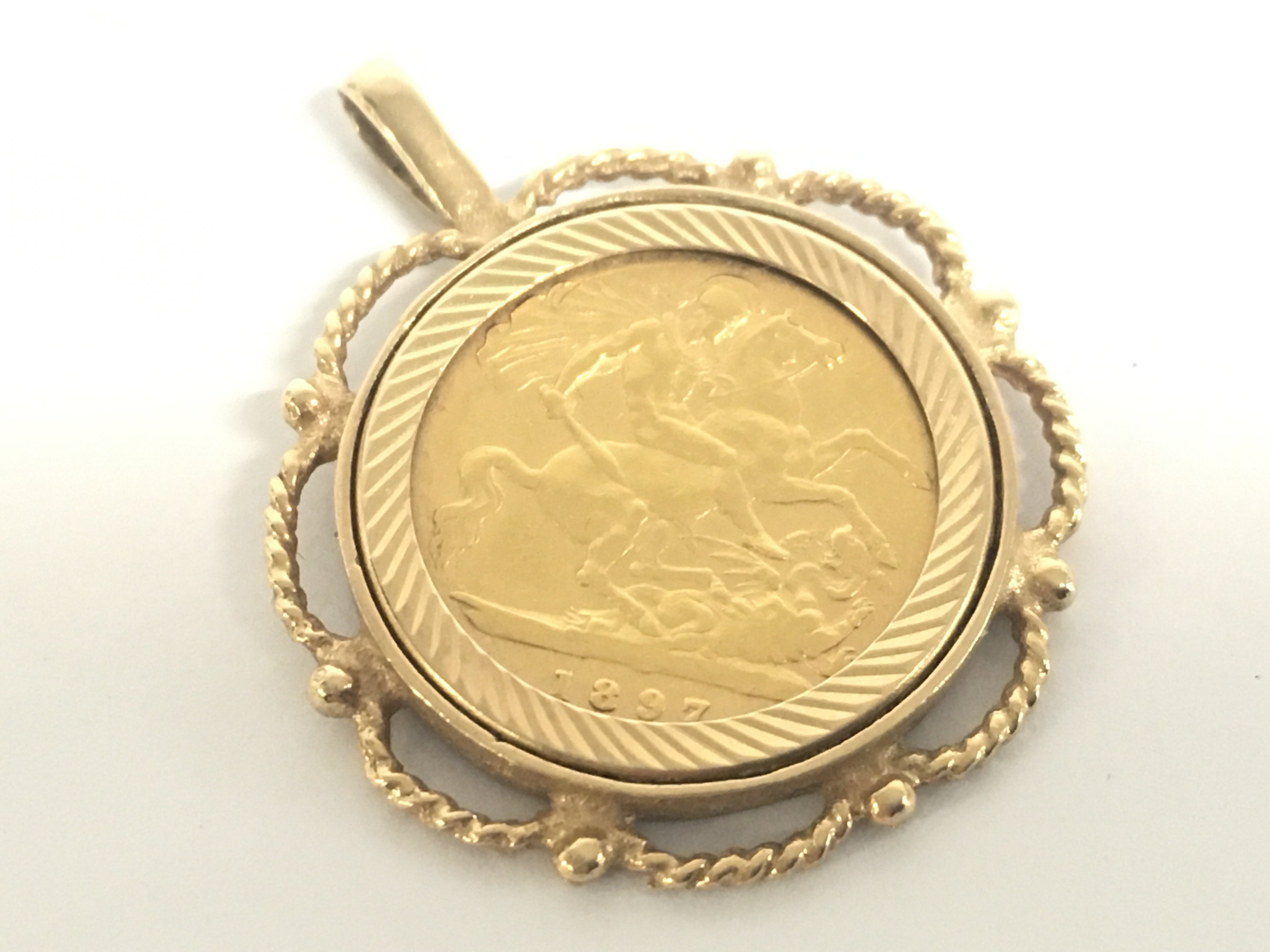 A 9ct gold mounted 1897 Half Sovereign. Total weight 6.8g. Postage category A