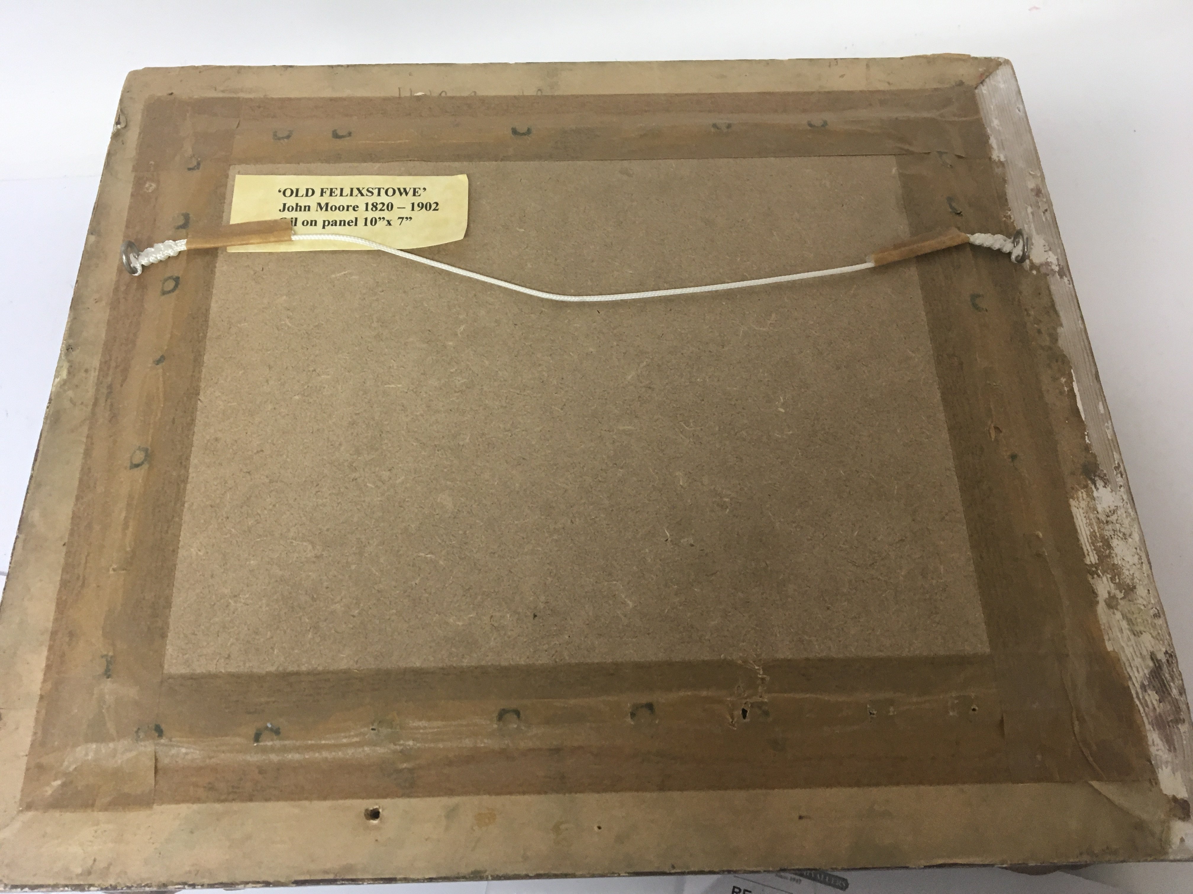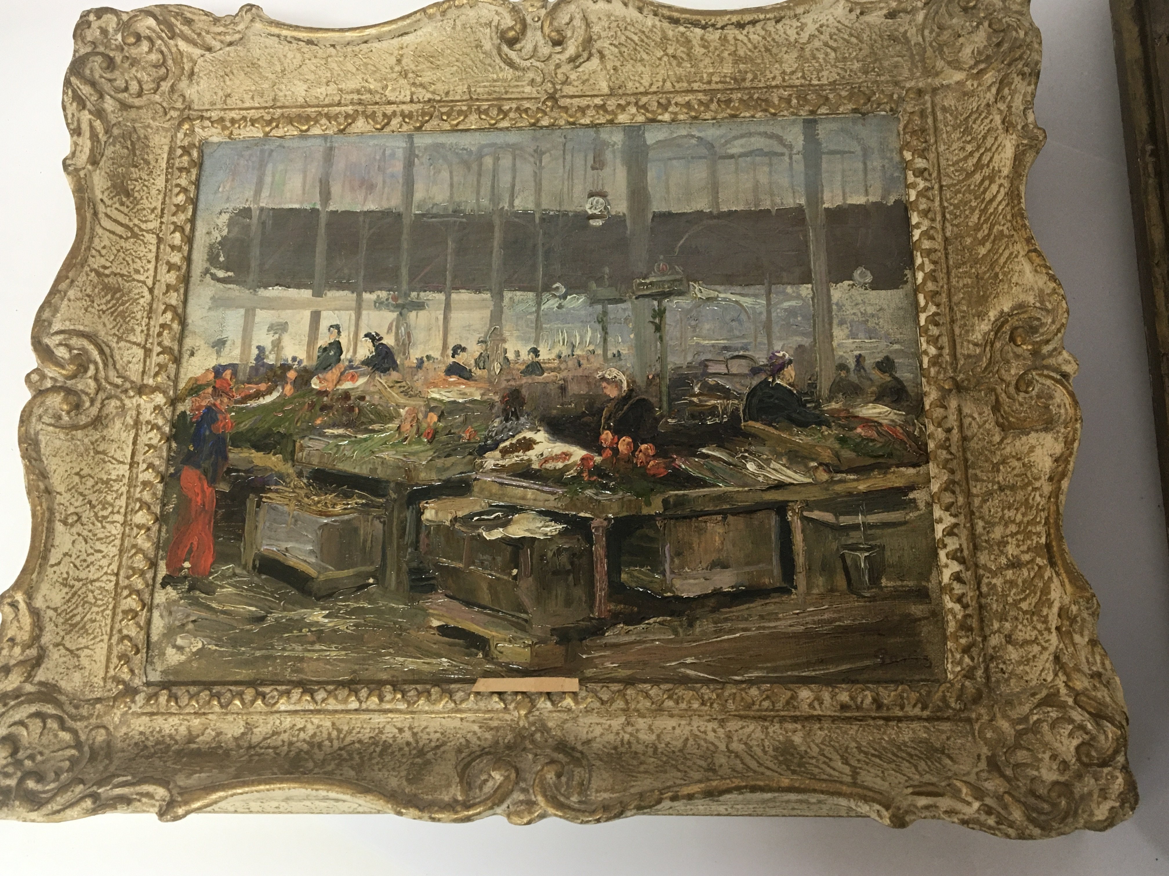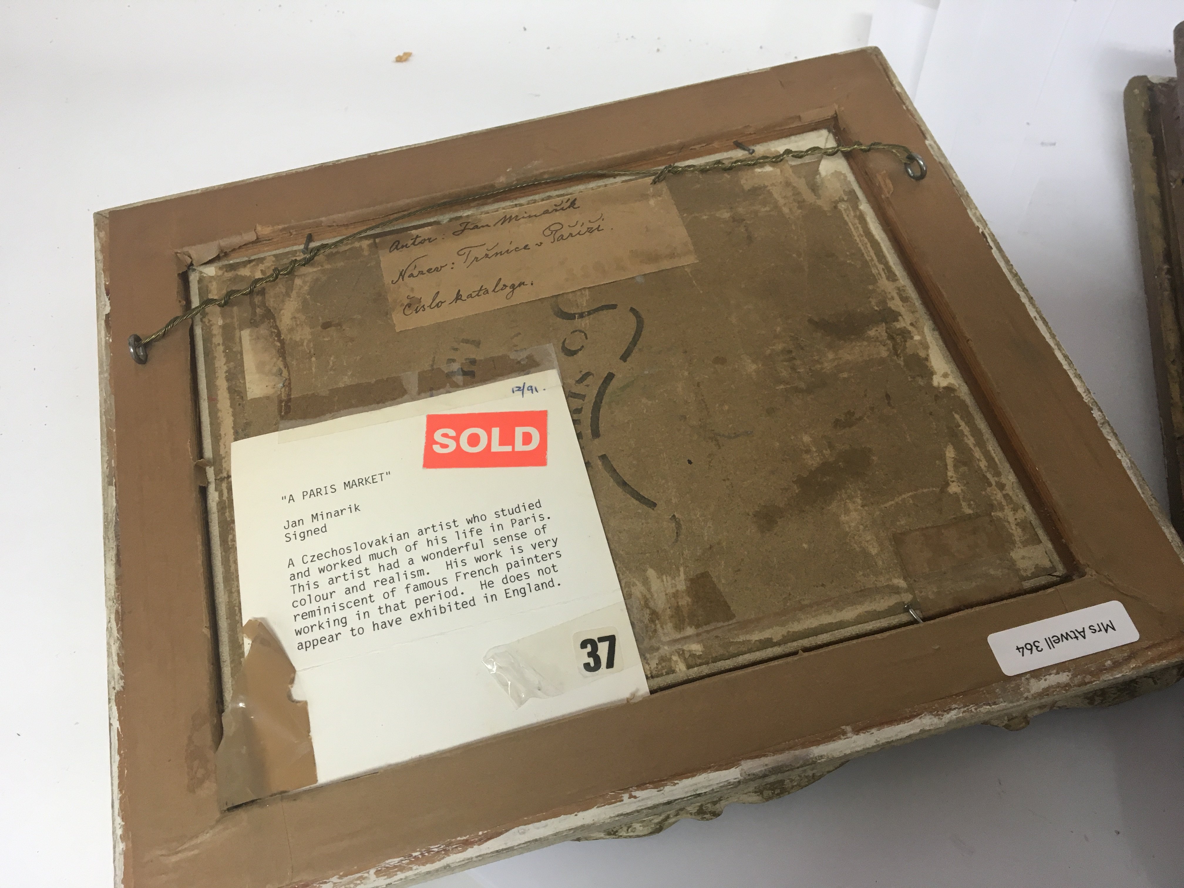 A framed oil painting on board a French street market signed lower right Jan Minarik. The reverse with applied label 30x25cm and one other oil painting in the style of John Moore a beach scene with figures Old Felixstowe.36x30cm (2)