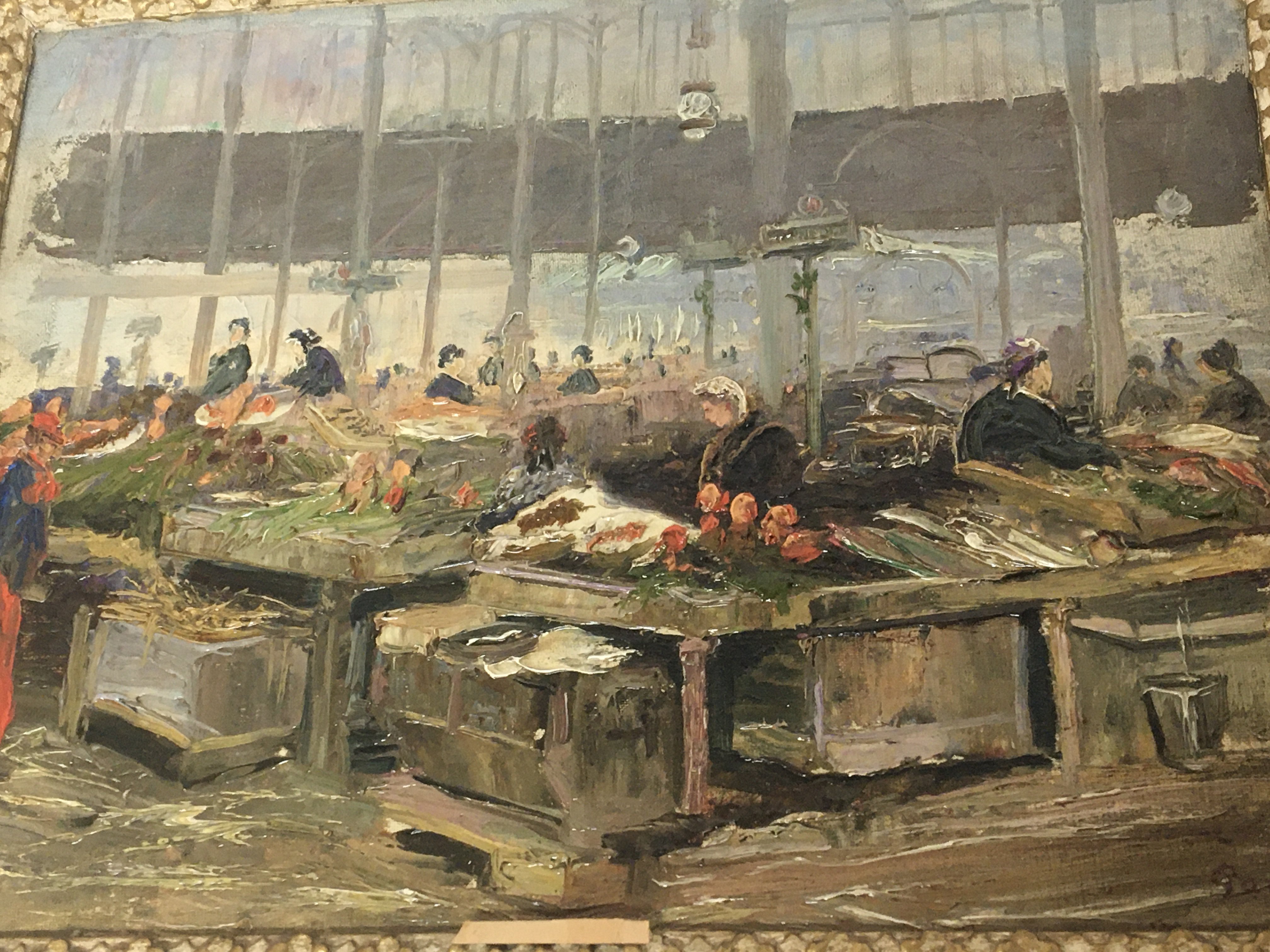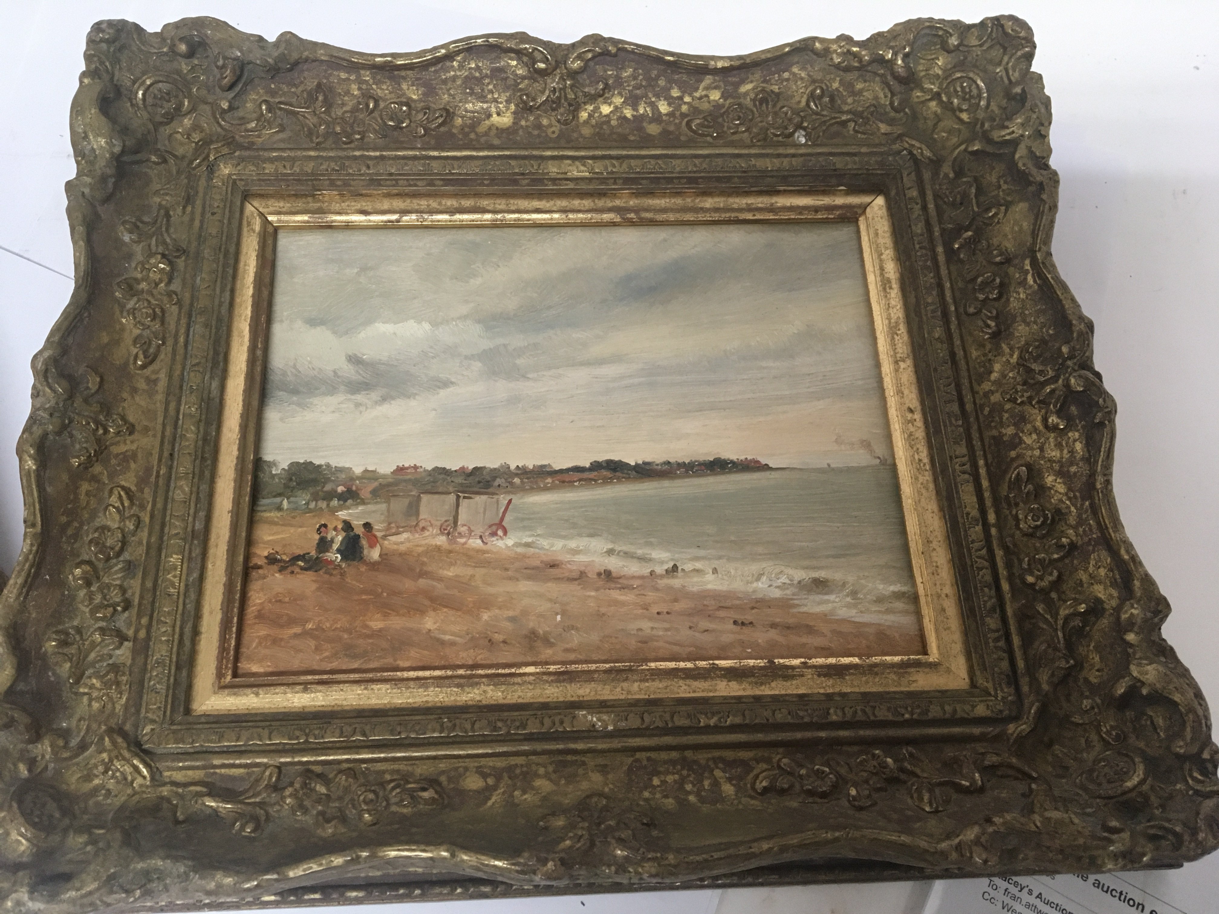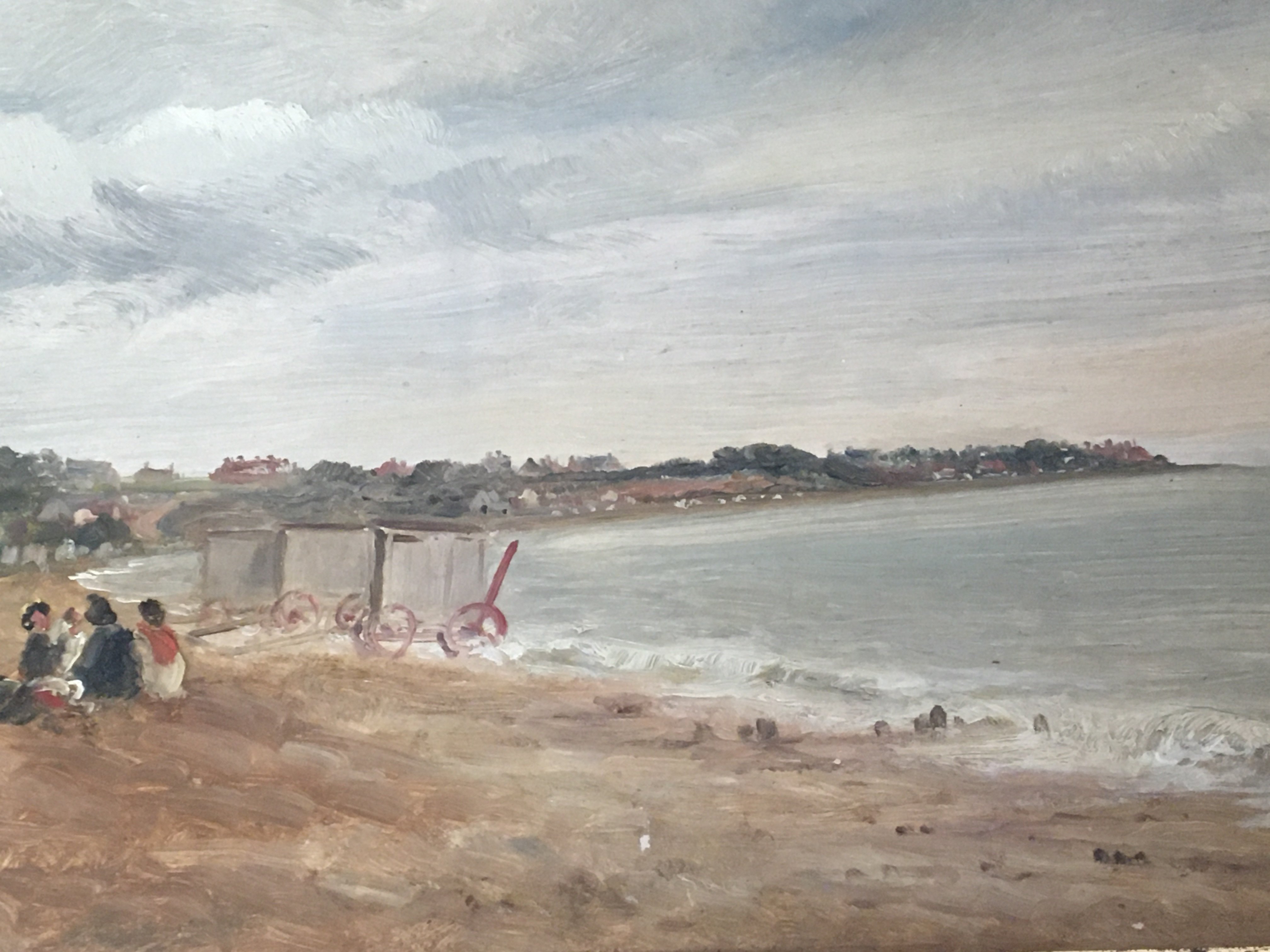 A framed oil painting on board a French street market signed lower right Jan Minarik. The reverse with applied label 30x25cm and one other oil painting in the style of John Moore a beach scene with figures Old Felixstowe.36x30cm (2)