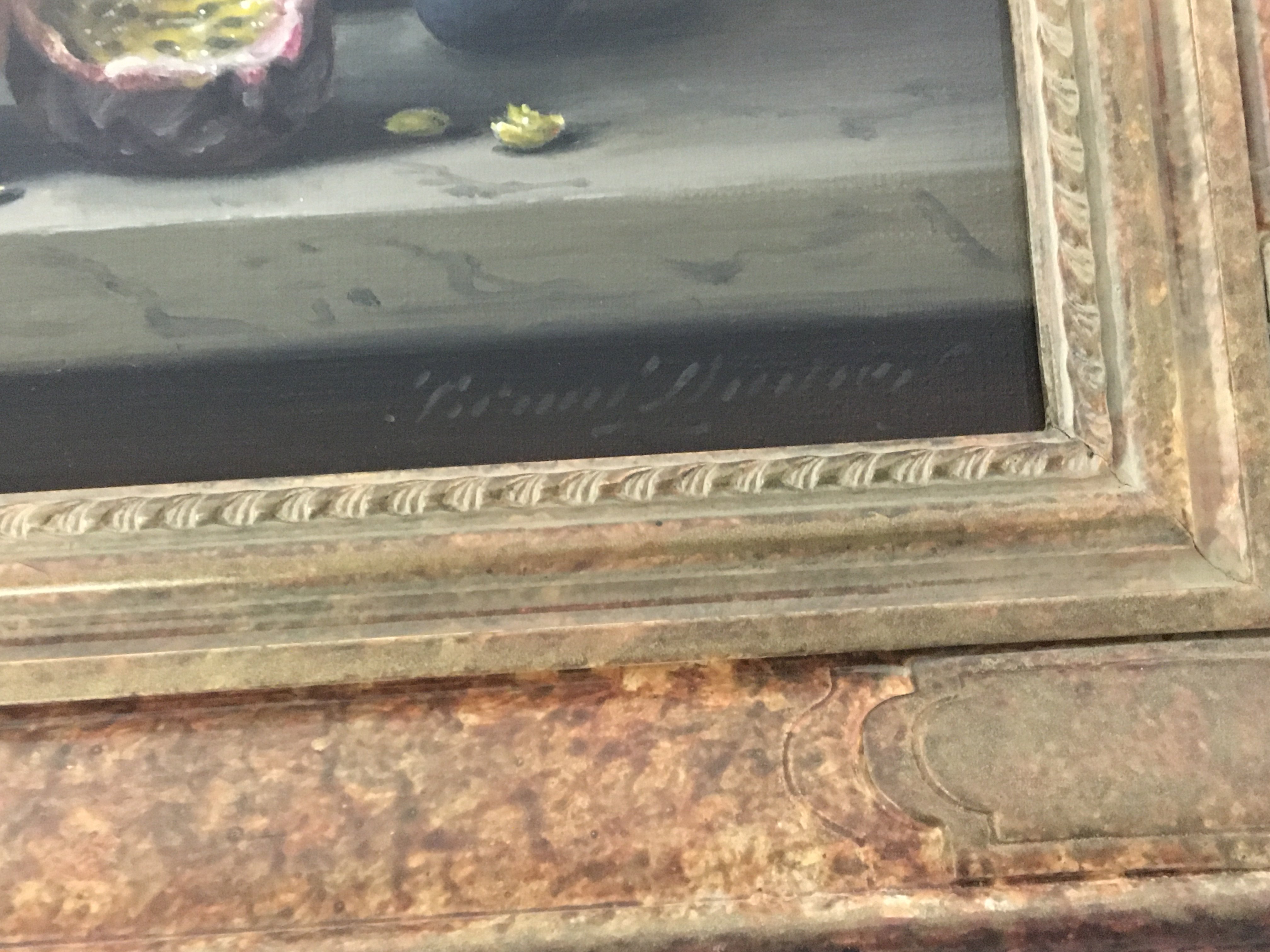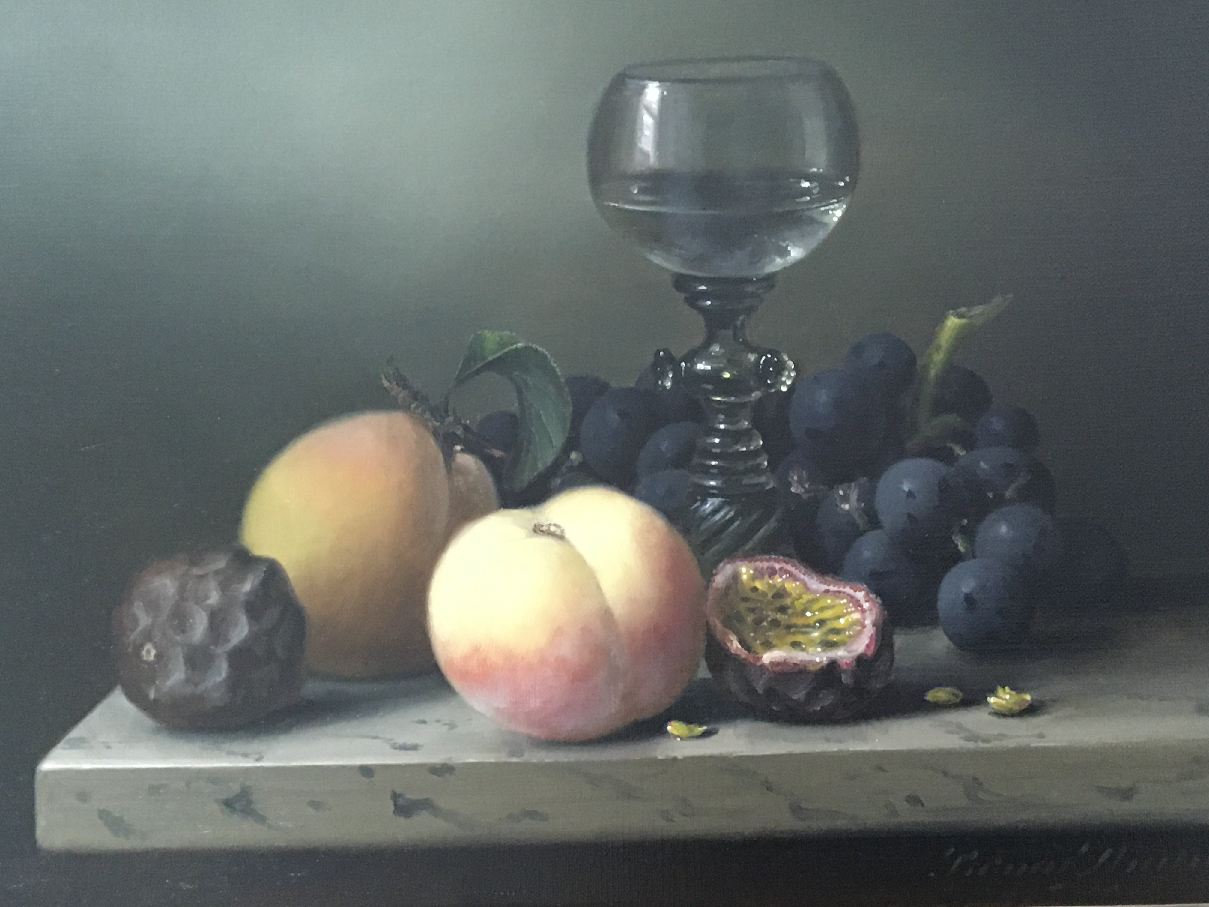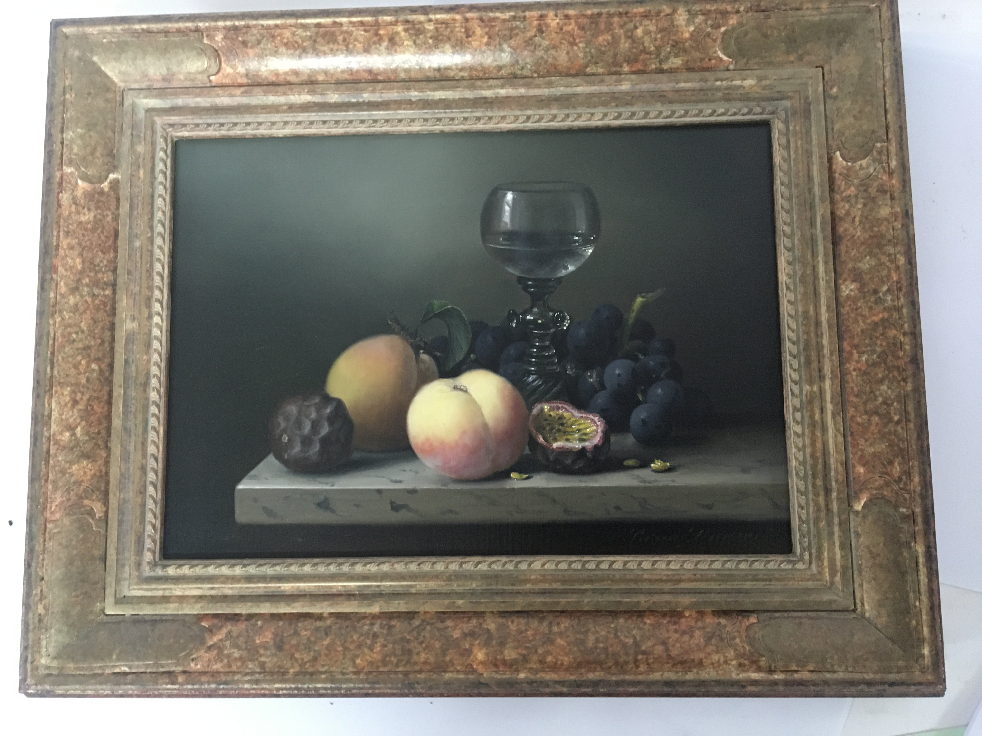 A conforming framed 20th century oil painting still life study with a Continental wine glass and fruit signed by Brian Davies 1942-2014 49x38cm