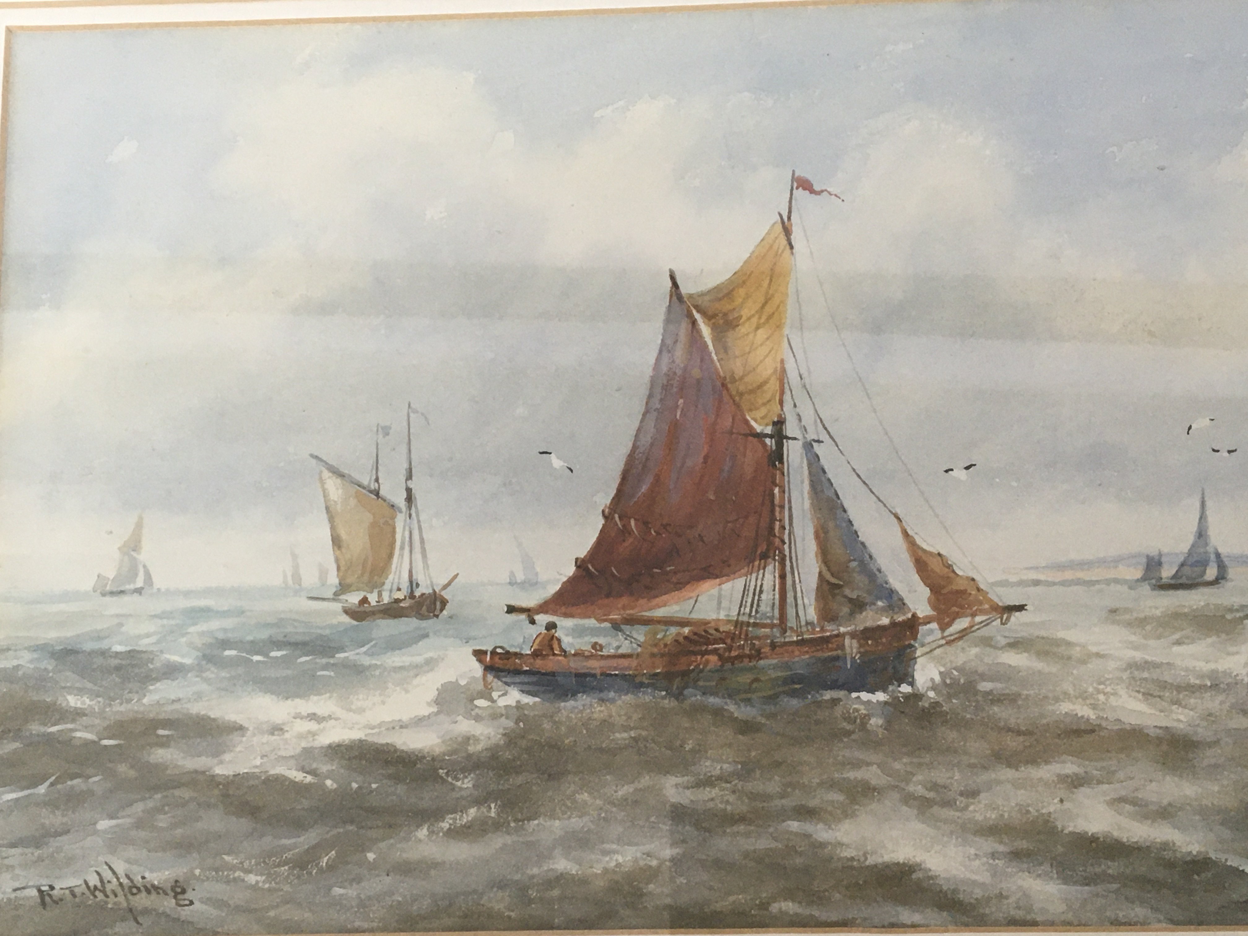 A framed watercolour Marine view with sailing fishing boats signed by RT Wilding.