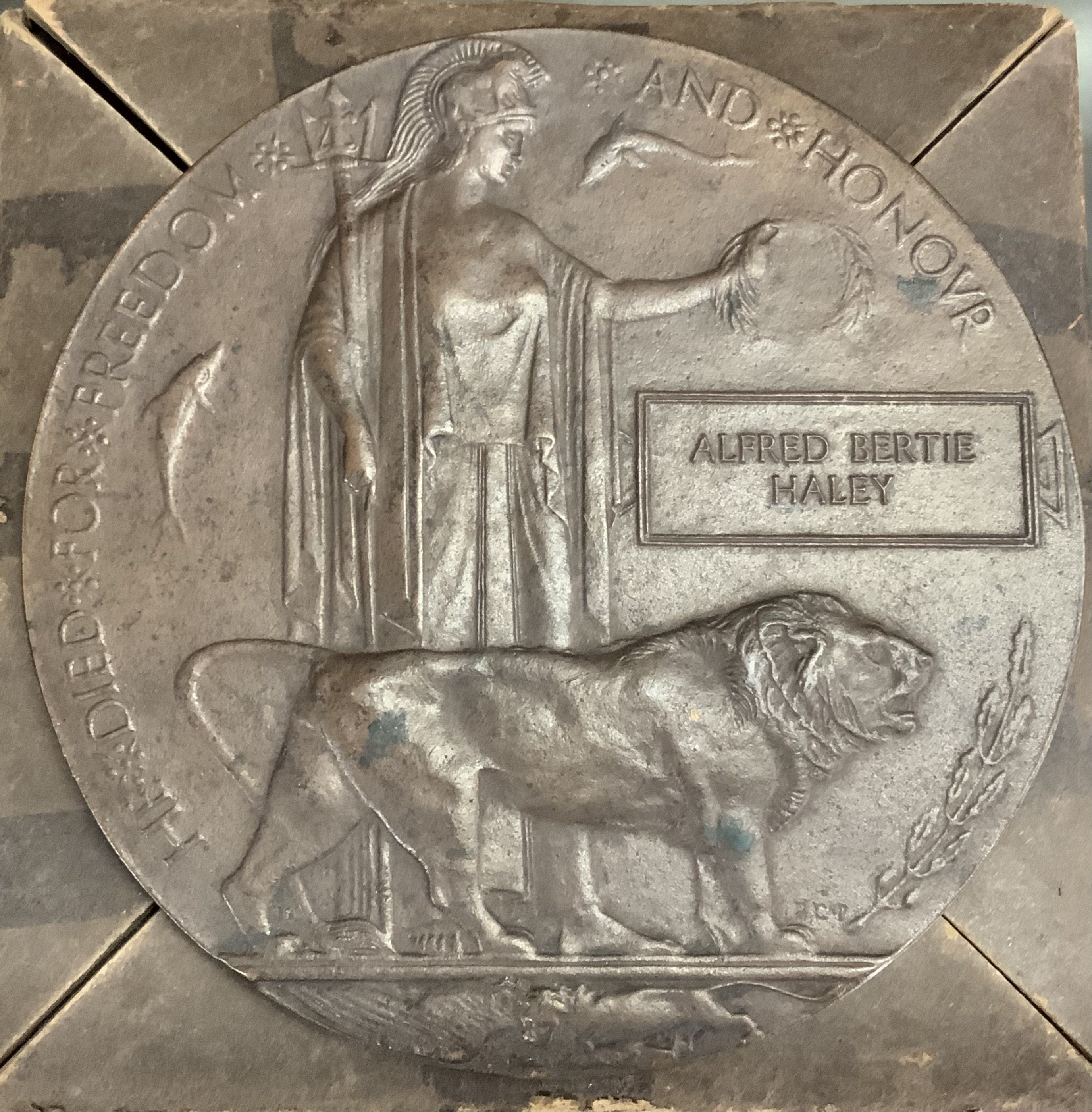 A WW1Bronze Death plaque given for Alfred Bertie Haley with original card sleeve. (Corporal G/33309 4th Battalion Middlesex Reginment, Died of Wounds received, 2/4/1917, France and Flanders)