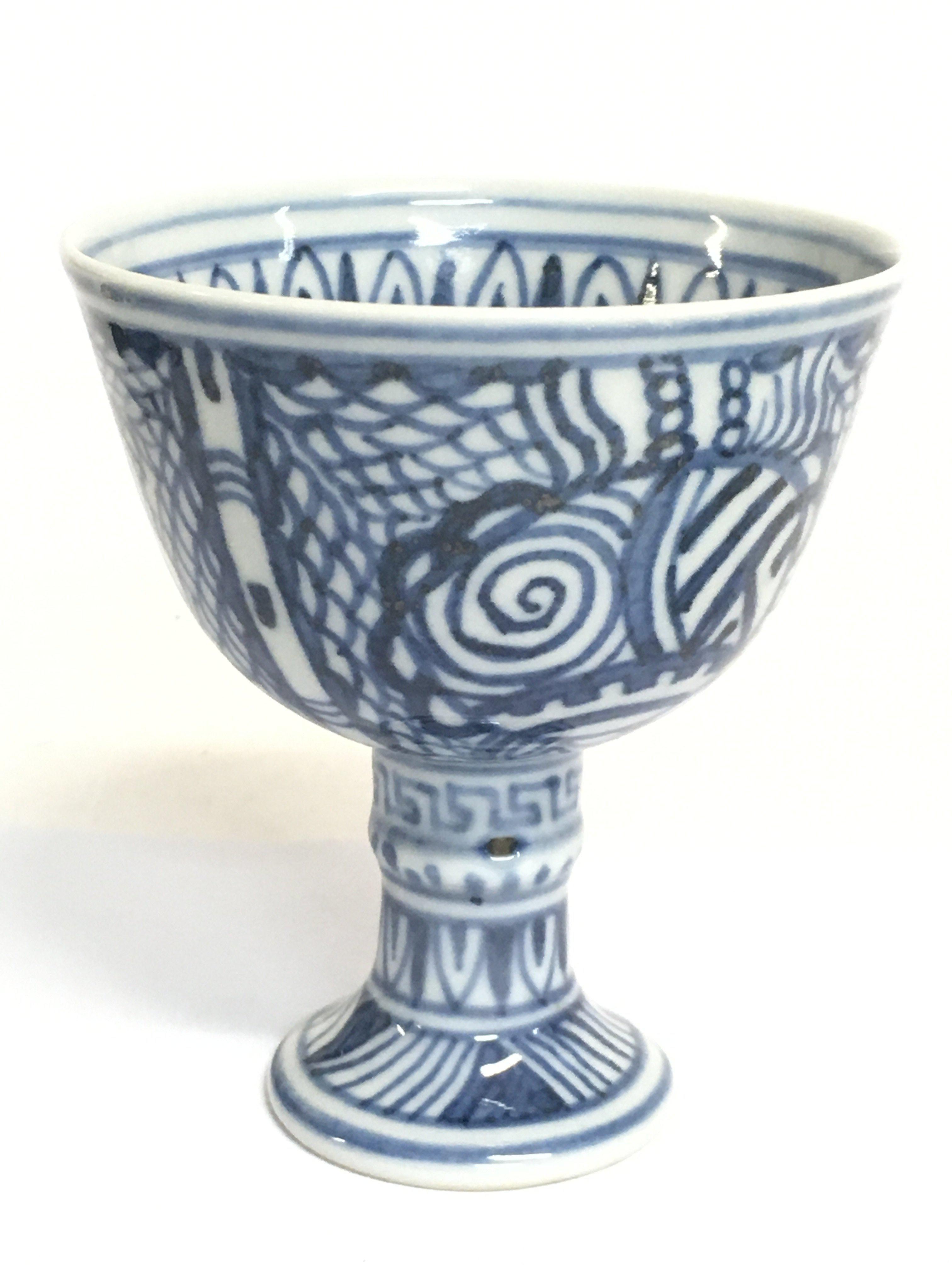 A Chinese blue and white high stand cup , 9cm tall. No obvious damage or restoration. This lot cannot be posted
